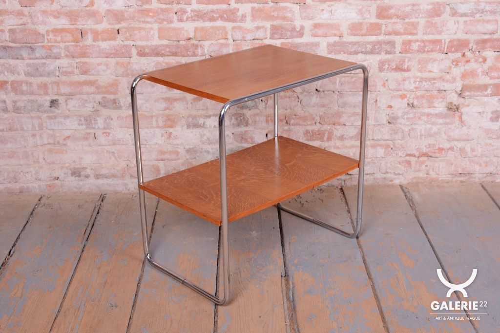 Tento stolek je ikonou moderního designu 20. století, která v sobě nese rukopis jednoho z nejvýznamnějších designérů hnutí Bauhaus, Marcela Breuera. Byl vyroben v 30. letech v Československu renomovanou firmou Mücke-Melder ve Fryštátu, která se specializovala na špičkový nábytek z ohýbaných ocelových trubek. Tento konkrétní model představuje esenci funkcionalismu – dokonalou rovnováhu mezi lehkostí konstrukce a geometrickou čistotou úložného prostoru.