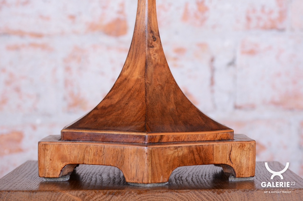 The piece consists of solid wood veneered with walnut. The rich grain of the walnut veneer creates impressive visual effects on the rounded body of the pedestal. The item underwent a careful restoration process. This restored the beauty of the wood and ensured stability for future generations. This unique collector piece represents a perfect example of early Biedermeier, where functional form meets refined artistic craftsmanship.