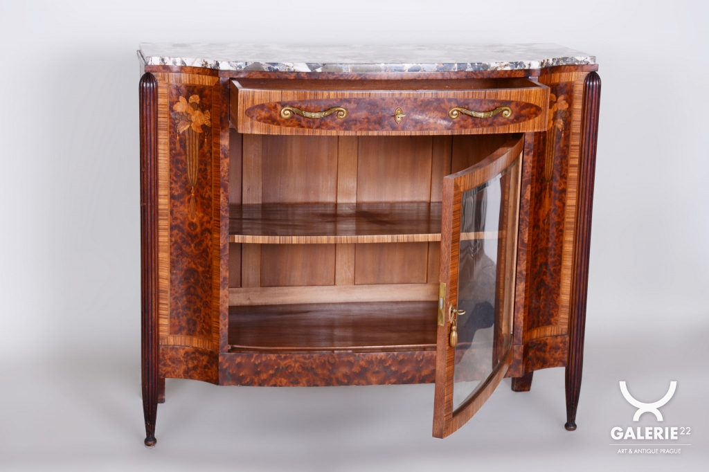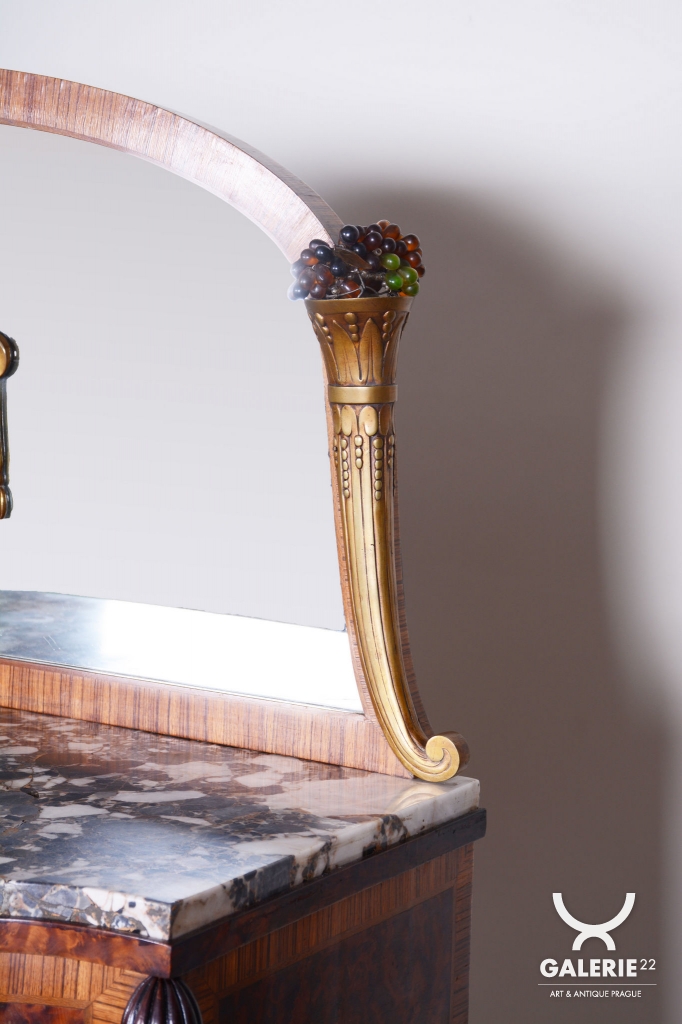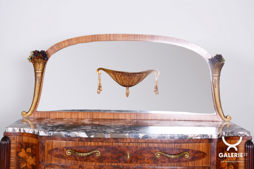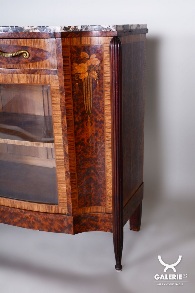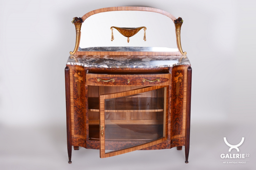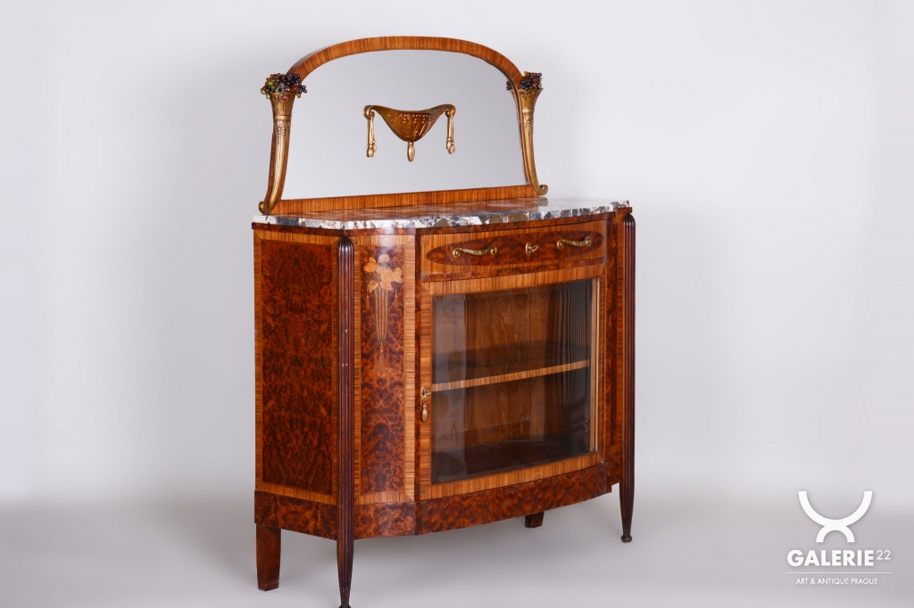 The structure is crafted from solid mahogany, veneered with exquisite thuja burl. The surface features precise marquetry and is adorned with unique bronze appliqués set with glass imitations of grapes. The exceptional quality is further highlighted by clear, convexly curved faceted glass. It has undergone professional restoration, including a sensitive revival of the original wood polish. The buffet is in excellent condition, using entirely original materials, and is fully functional. This is an investment-grade piece of international significance, representing the pinnacle of French luxury furniture.