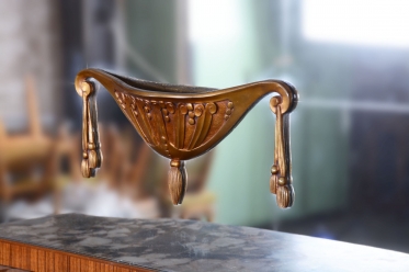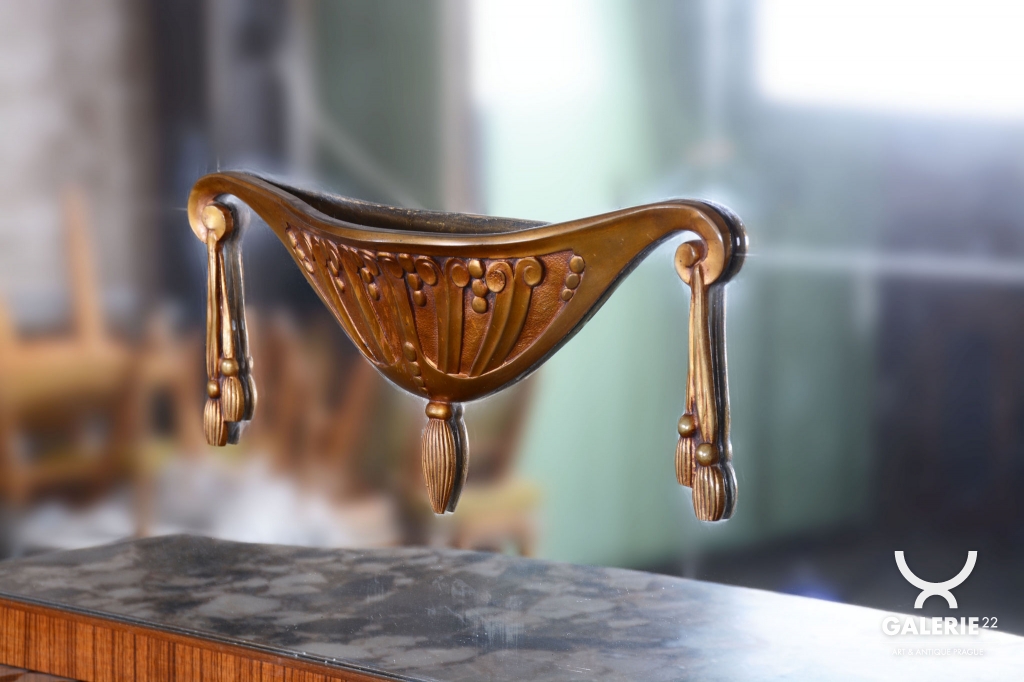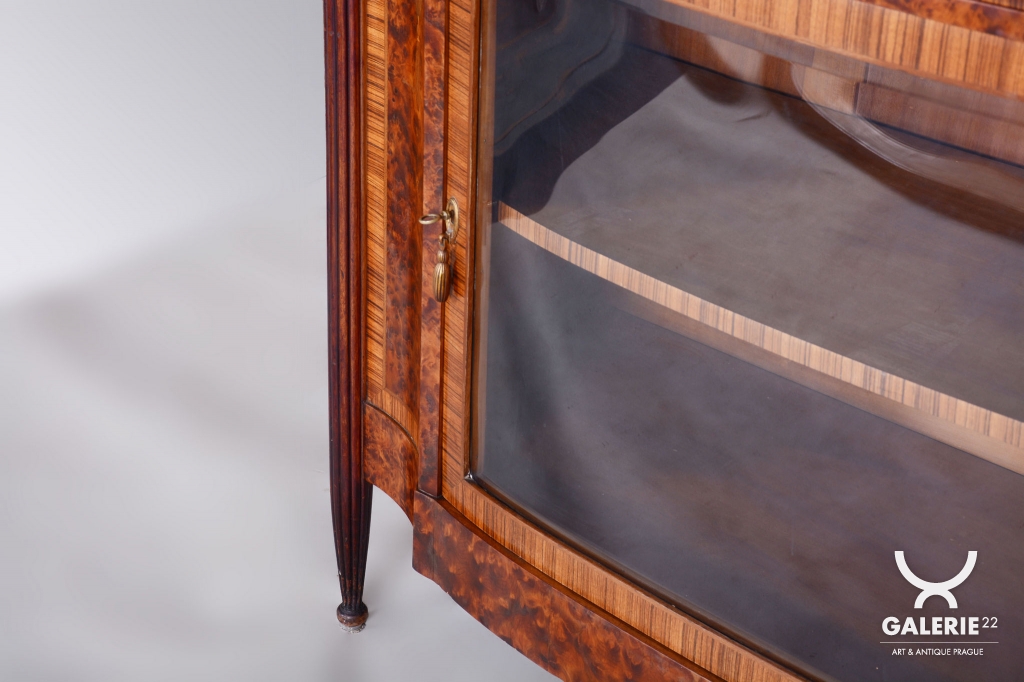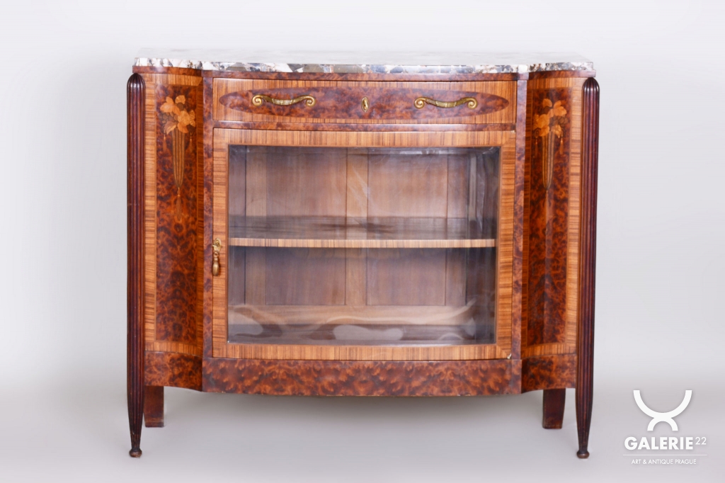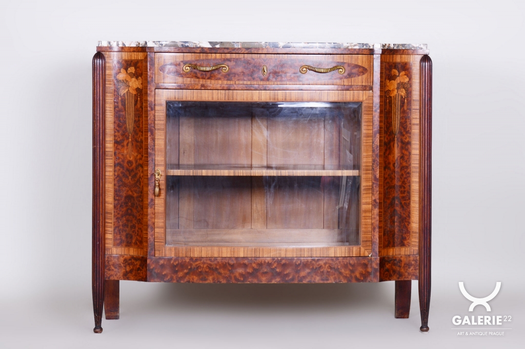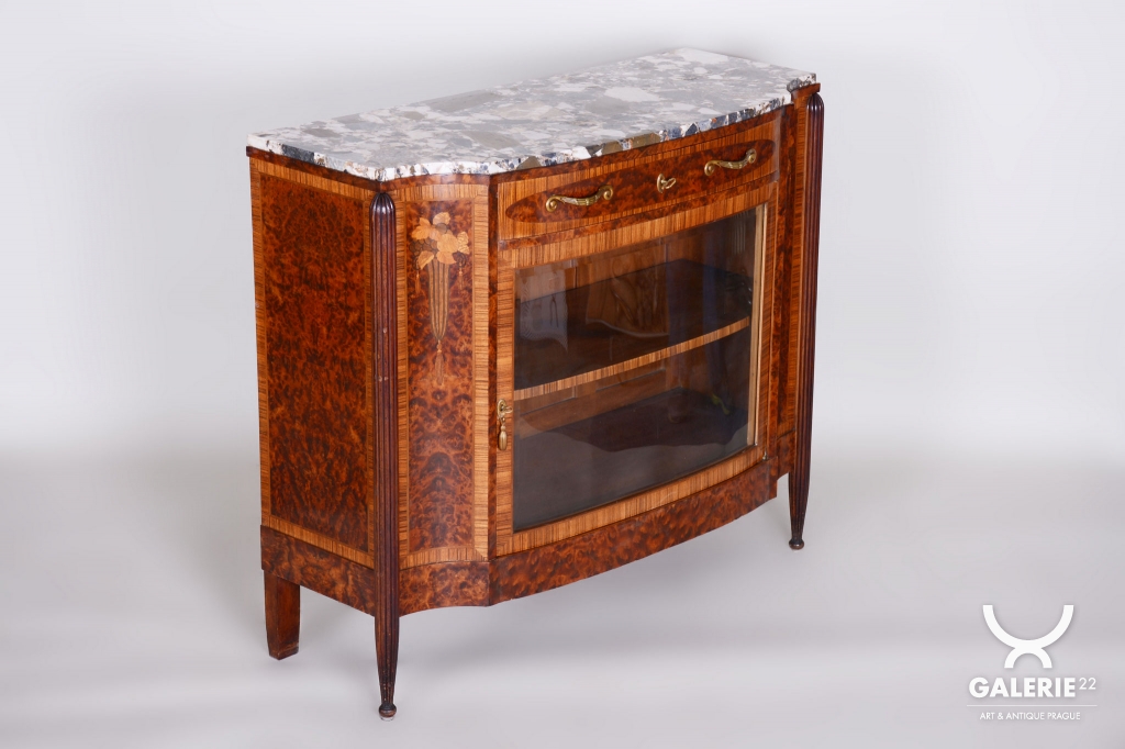 The structure is crafted from solid mahogany, veneered with exquisite thuja burl. The surface features precise marquetry and is adorned with unique bronze appliqués set with glass imitations of grapes. The exceptional quality is further highlighted by clear, convexly curved faceted glass. It has undergone professional restoration, including a sensitive revival of the original wood polish. The buffet is in excellent condition, using entirely original materials, and is fully functional. This is an investment-grade piece of international significance, representing the pinnacle of French luxury furniture.