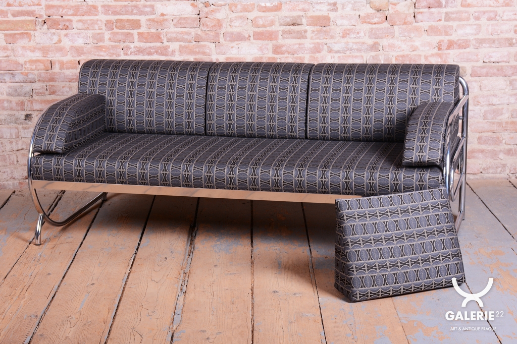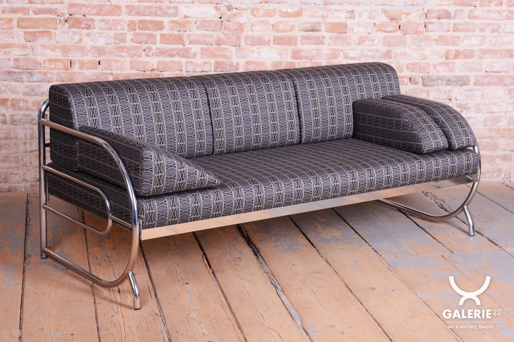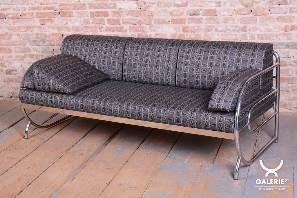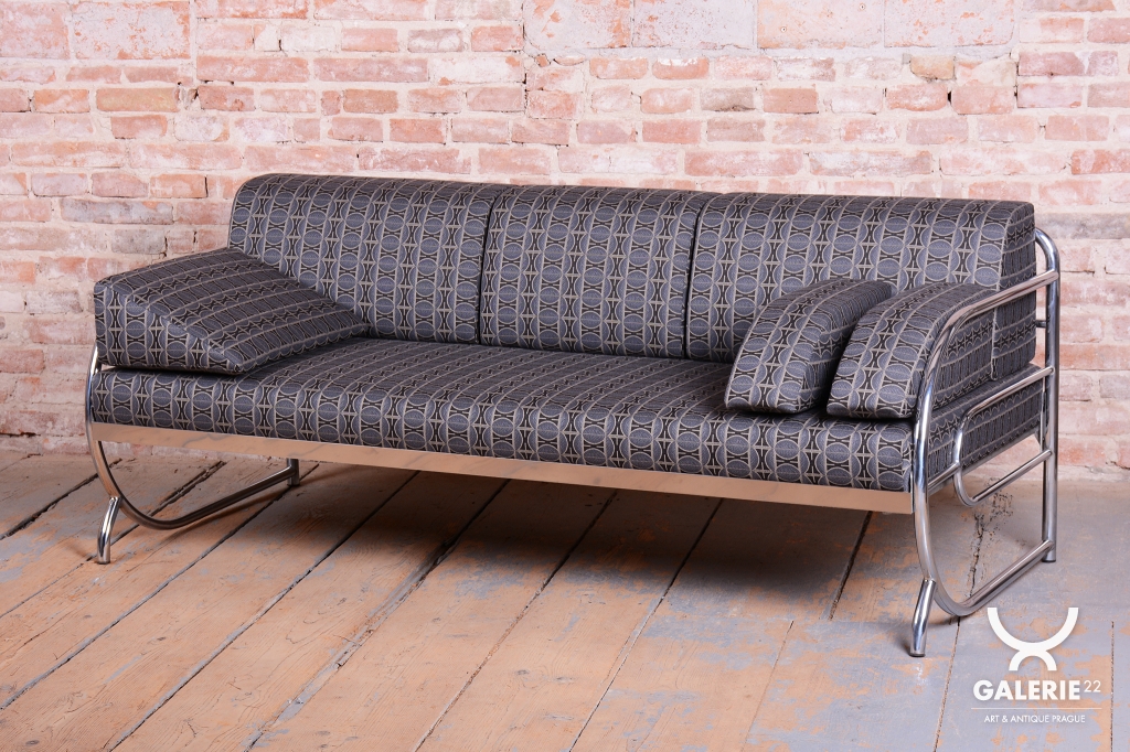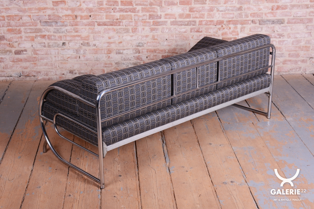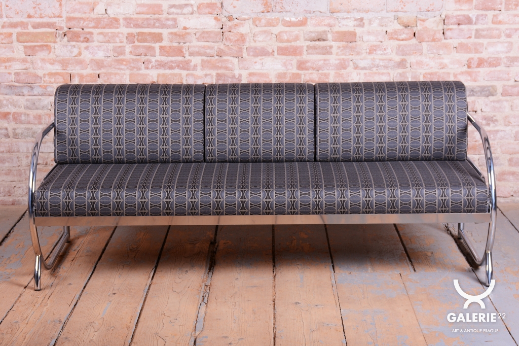 This elegant sofa from the early 20th century originates from the renowned Slezákovy závody workshop. Its frame is crafted from tubular chrome steel, which has been professionally cleaned to restore its original shine. The new upholstery, made from high-quality fabric, not only respects the original design but also ensures exceptional seating comfort.
