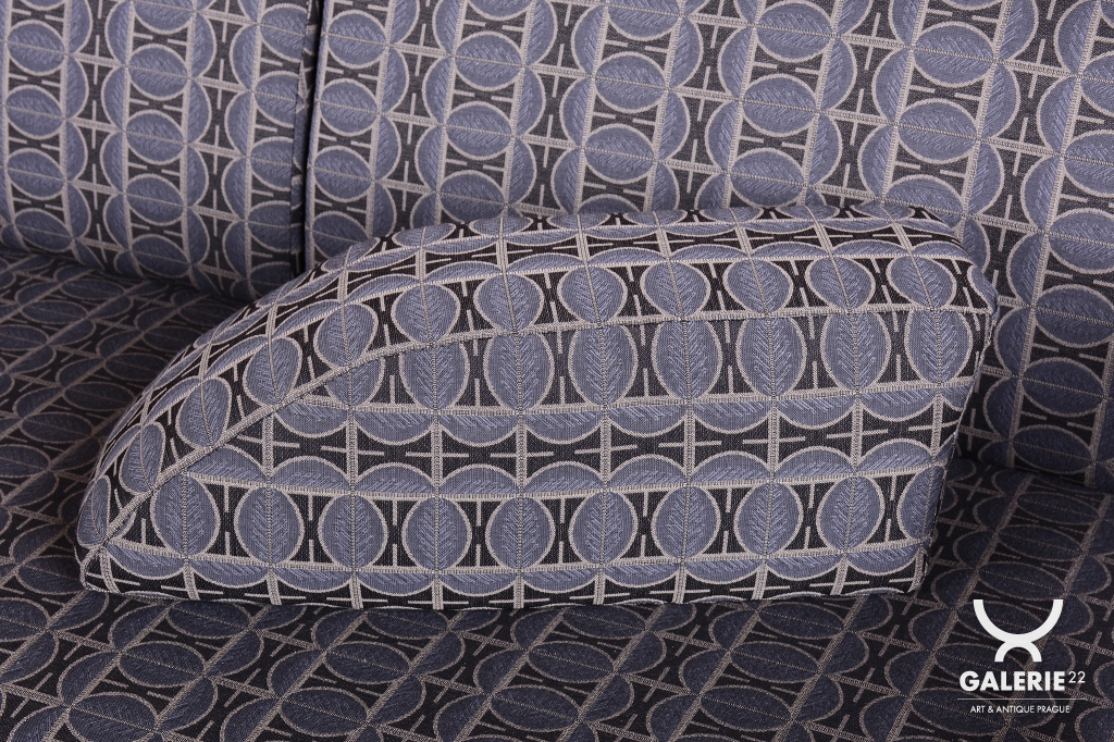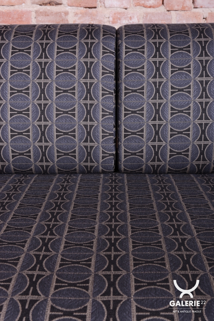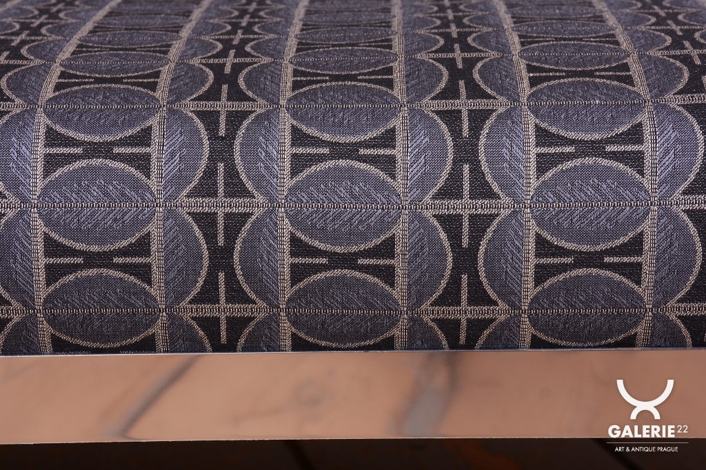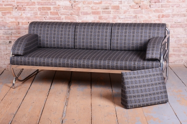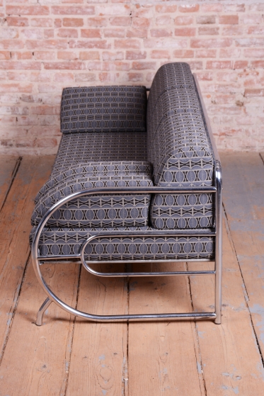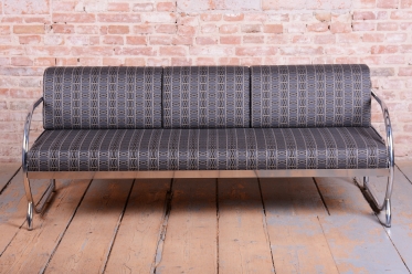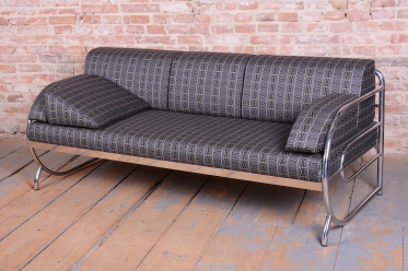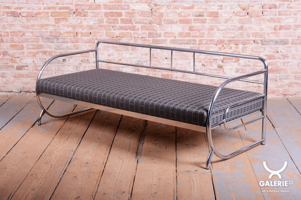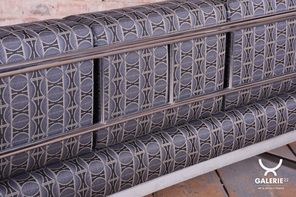 This elegant sofa from the early 20th century originates from the renowned Slezákovy závody workshop. Its frame is crafted from tubular chrome steel, which has been professionally cleaned to restore its original shine. The new upholstery, made from high-quality fabric, not only respects the original design but also ensures exceptional seating comfort.
