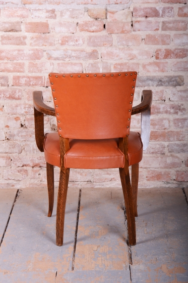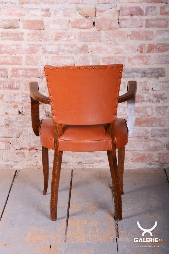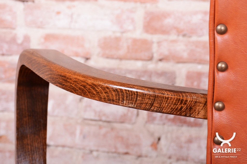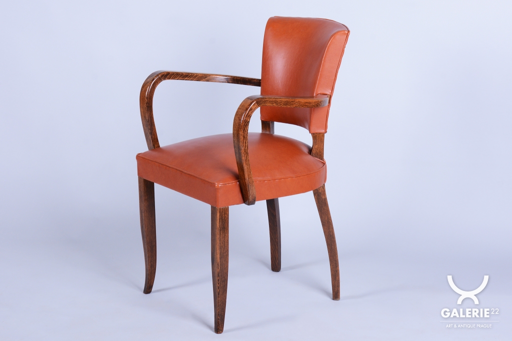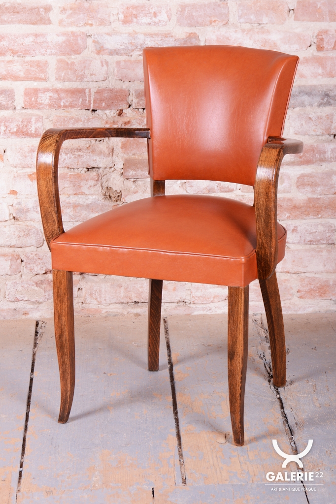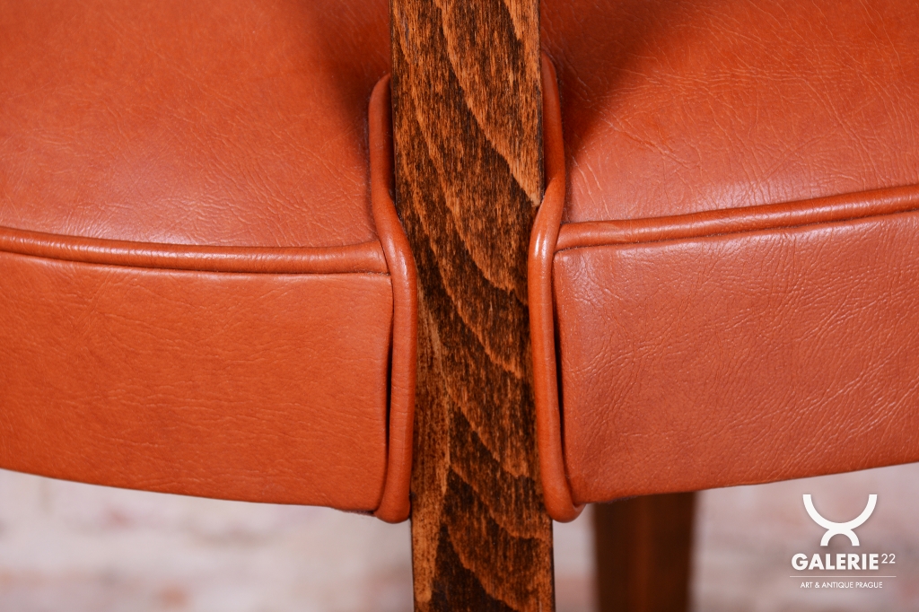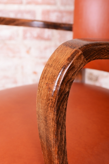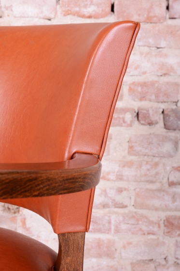 The armchairs frame is crafted from solid beech wood with a beautiful, warm tone. The chair has undergone restoration and features a revived polish, which highlights the authenticity and beauty of the wood. It is fitted with traditional upholstery in faux leather, which is very well-preserved and not sagged, ensuring maximum comfort.