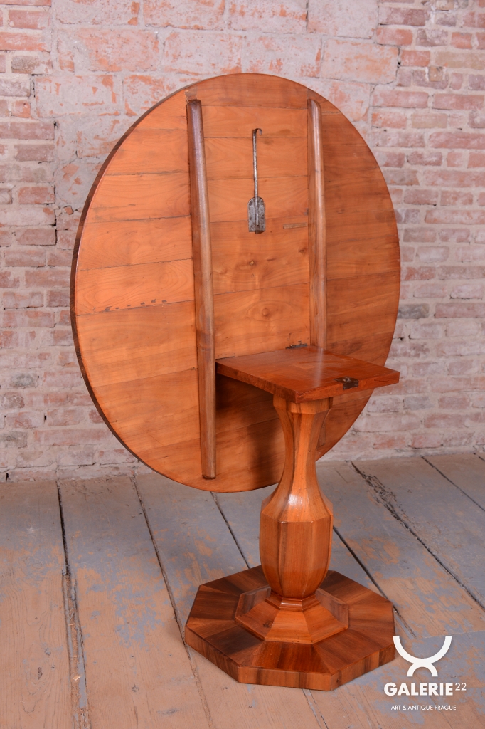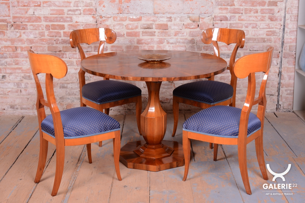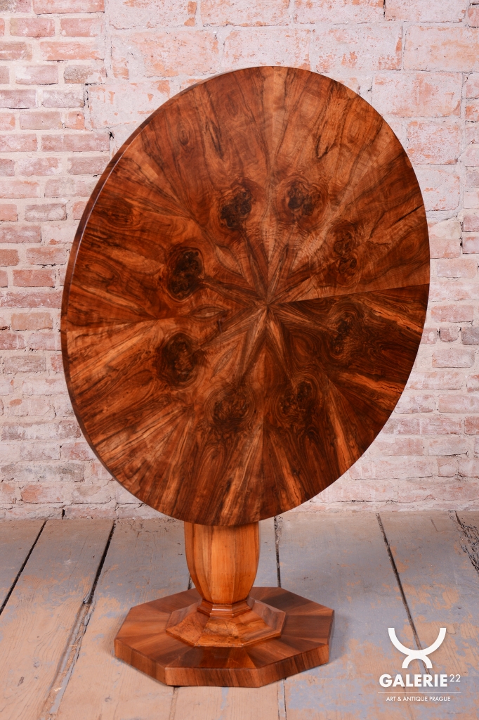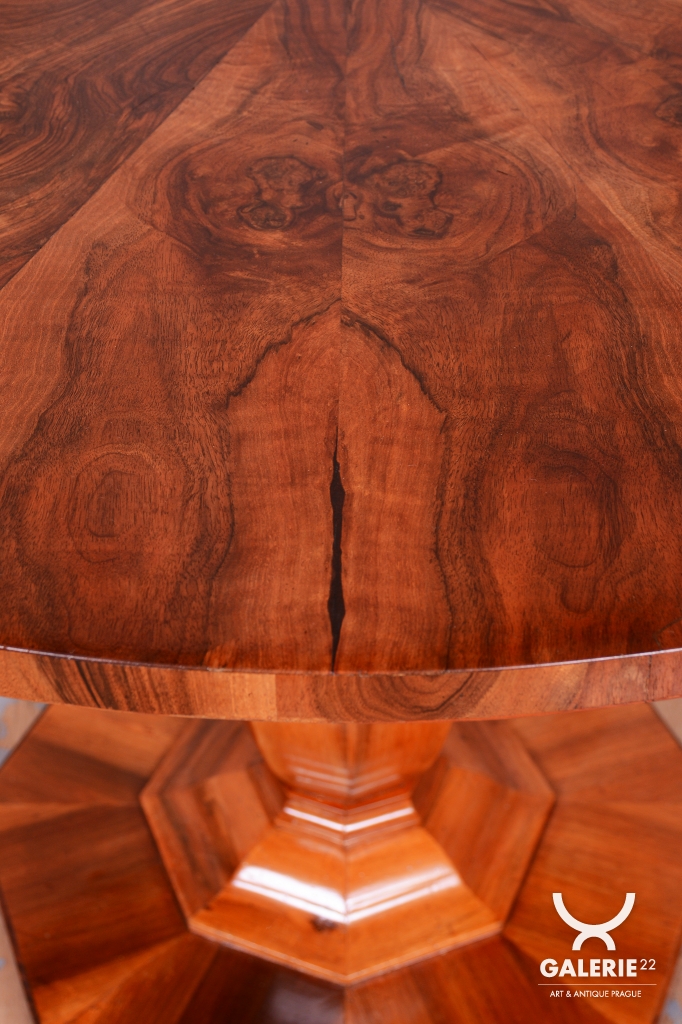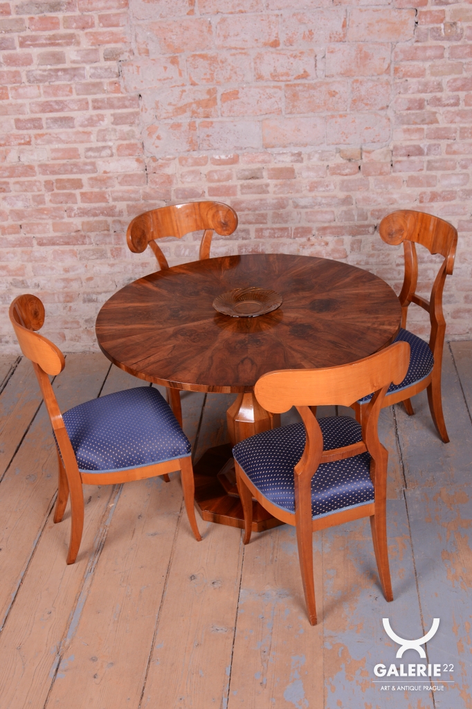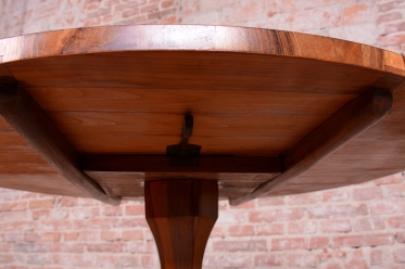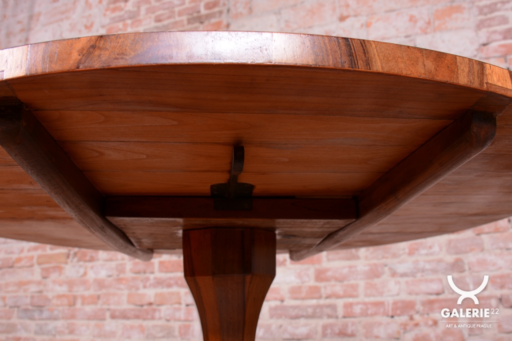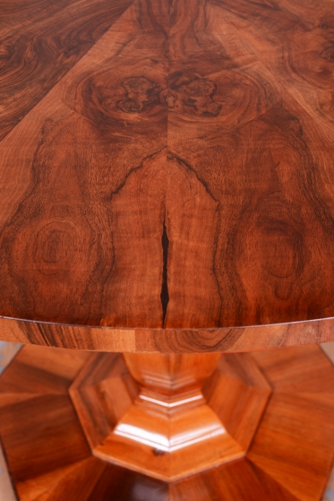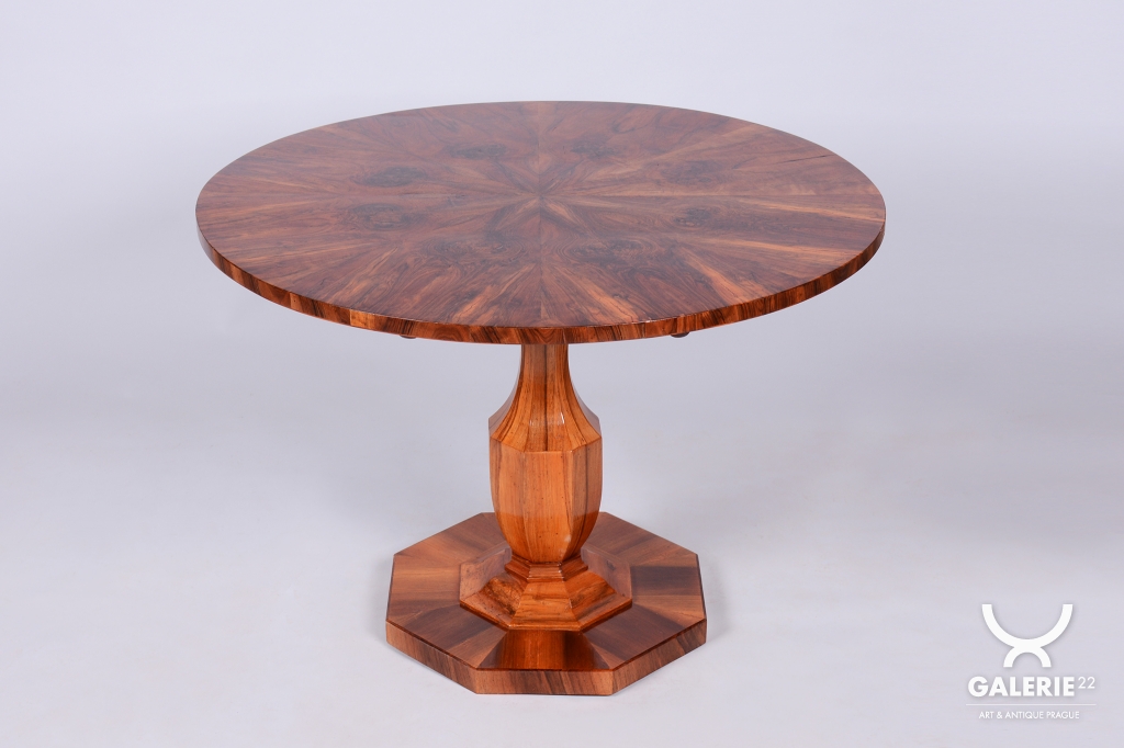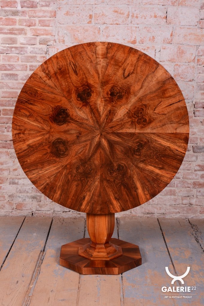 This exceptional round dining table represents the pinnacle of Viennese Biedermeier and is attributed to one of the most significant creators of the era, the architect and designer Josef Danhauser. Originating from early 19th-century Austria, the table embodies the period ideal of bourgeois elegance, clean lines, and functionality. The primary material is refined walnut veneer, with the grain masterfully arranged on the circular top to create a decorative starburst pattern.