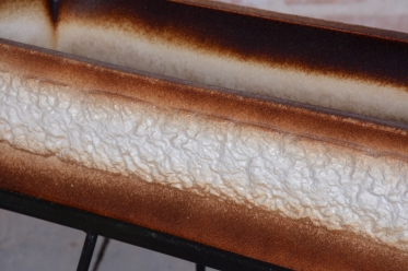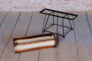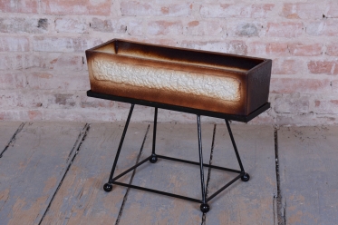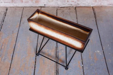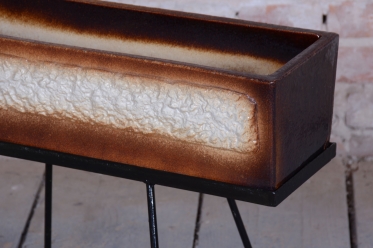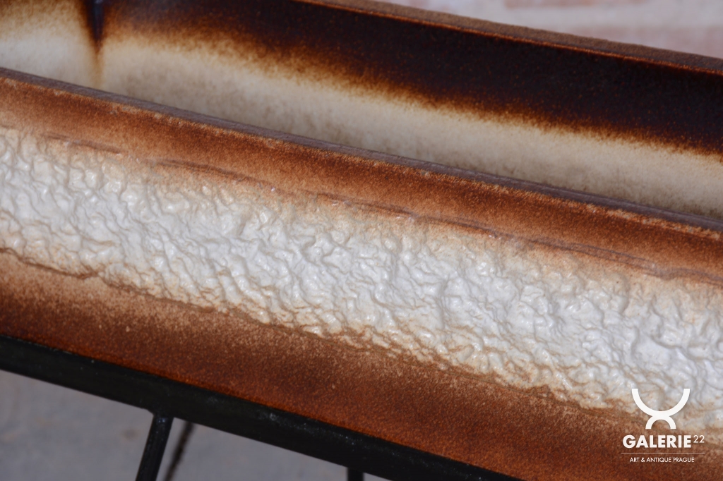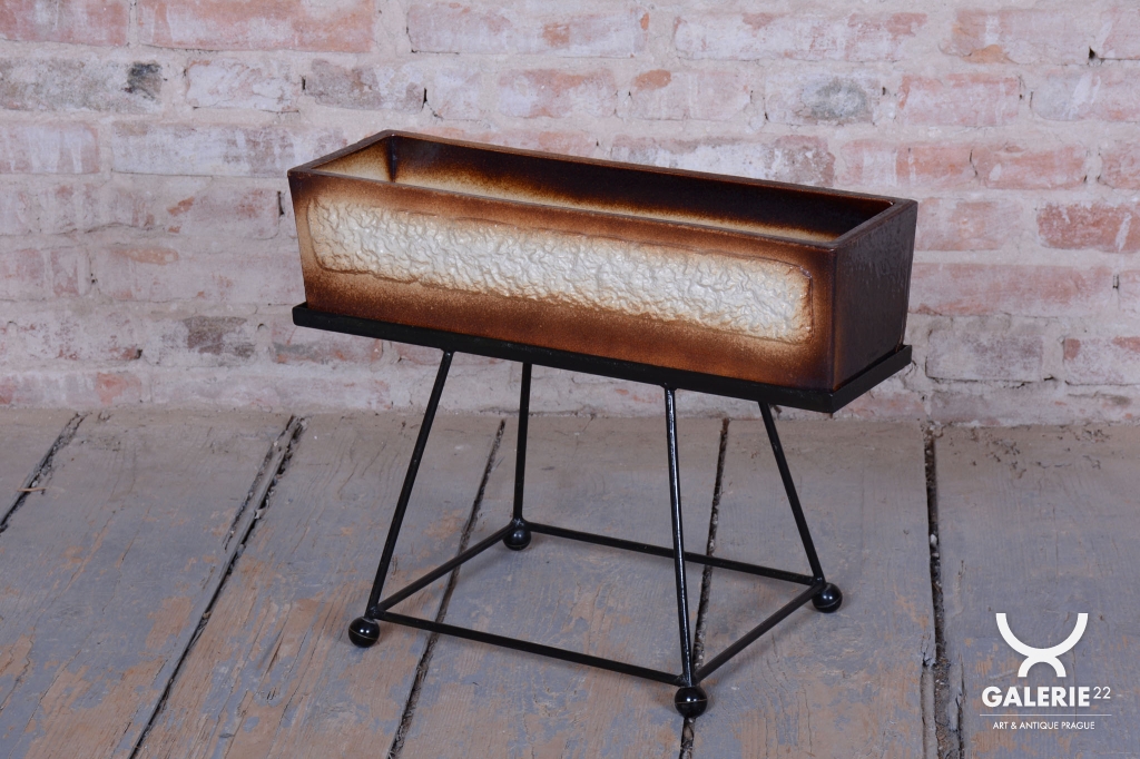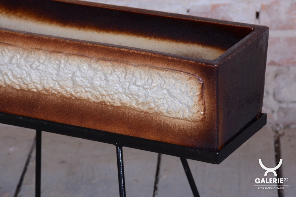 The planter is made of ceramics with an attractive and textured glaze in brown and beige tones, giving it a distinctive character. It rests on an elegant, geometric stand made of steel with a black lacquer finish. The entire set is in original and very well-preserved condition, which speaks to its quality.