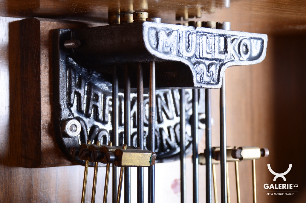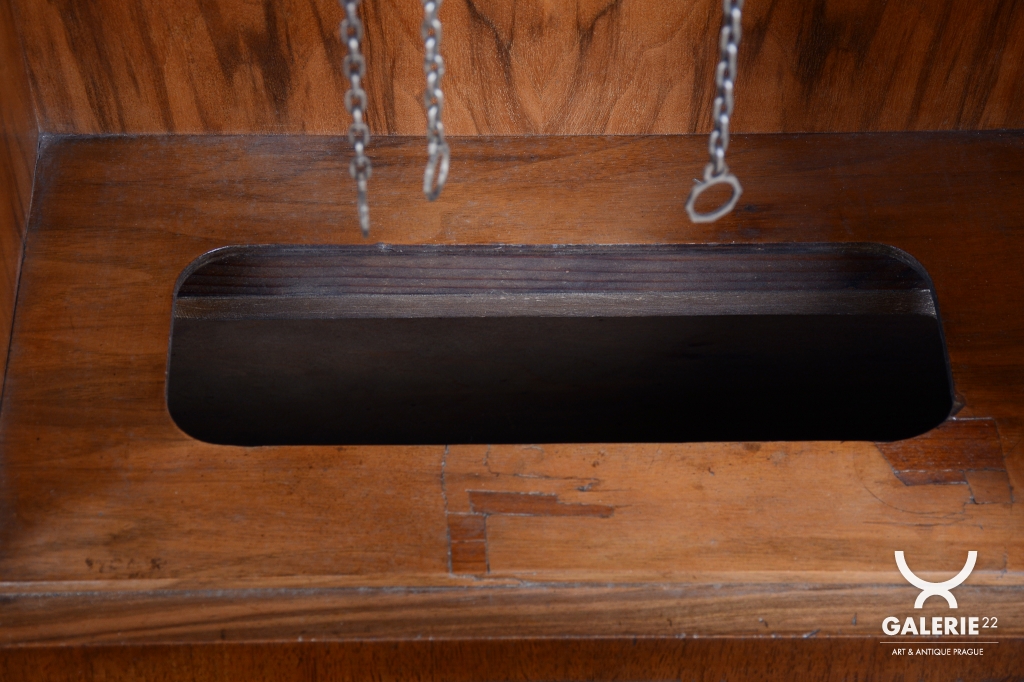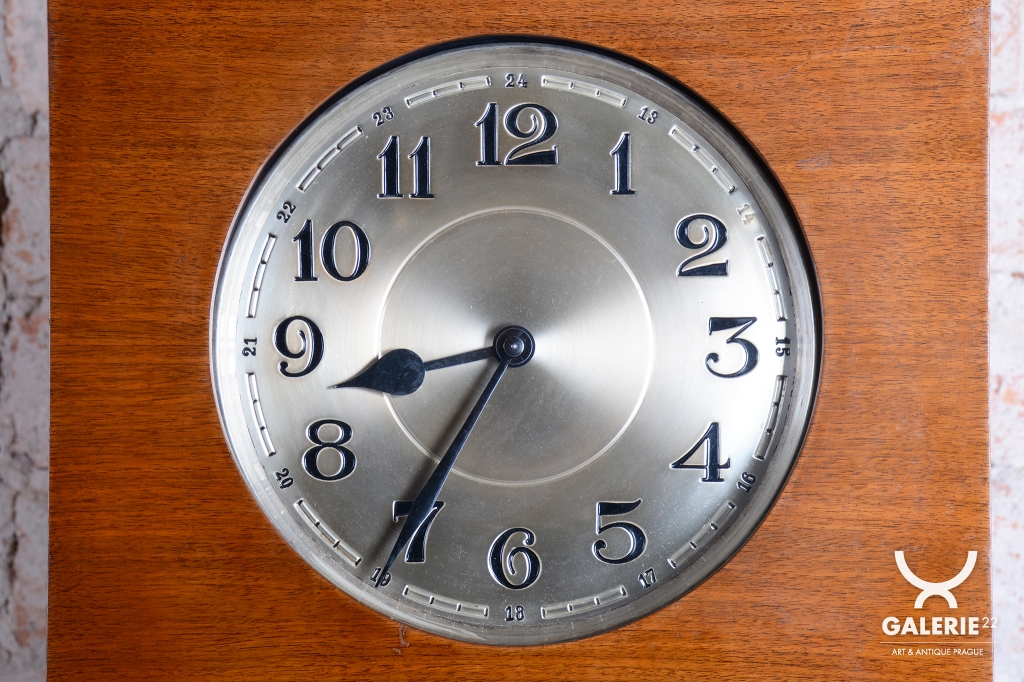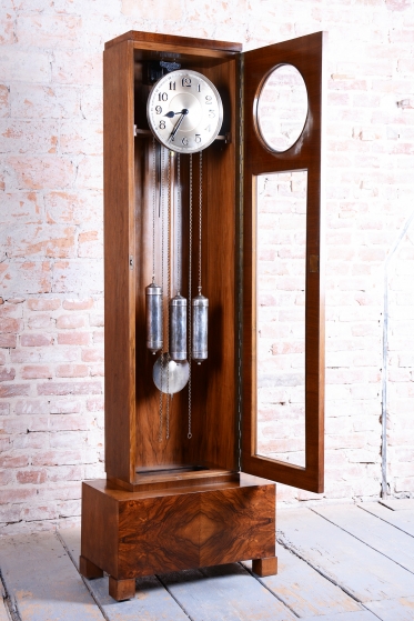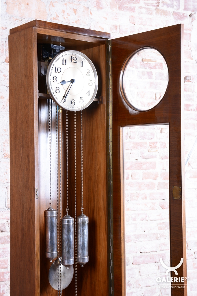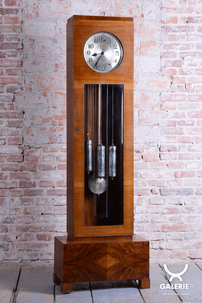 This majestic Art Deco grandfather clock represents the pinnacle of Czechoslovak furniture design from the 1920s. Its elegant, geometric lines combined with wood and metal are a perfect example of the era design.