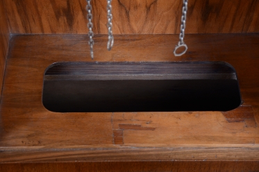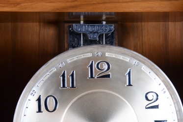The clock case is crafted from solid spruce veneered with walnut. The veneer has a distinctive, rich grain, especially on the base, and has been carefully restored with a revived original polish, highlighting its depth and luster.