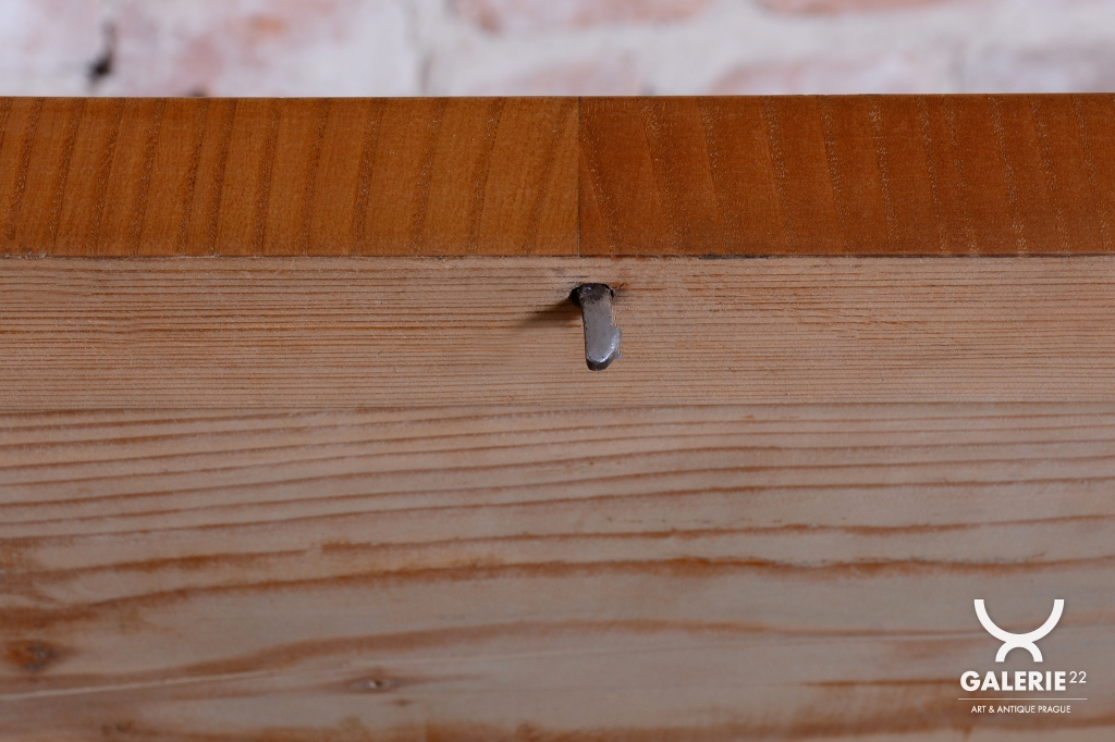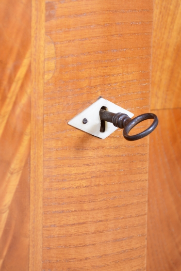 The cabinet is crafted from solid spruce wood and veneered with ash, which boasts a beautiful light and distinctive wood grain. It has undergone a meticulous restoration, during which the original polish has been revived, highlighting its authenticity and luster.