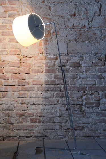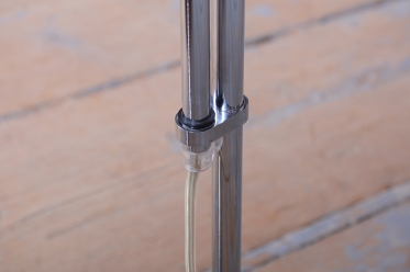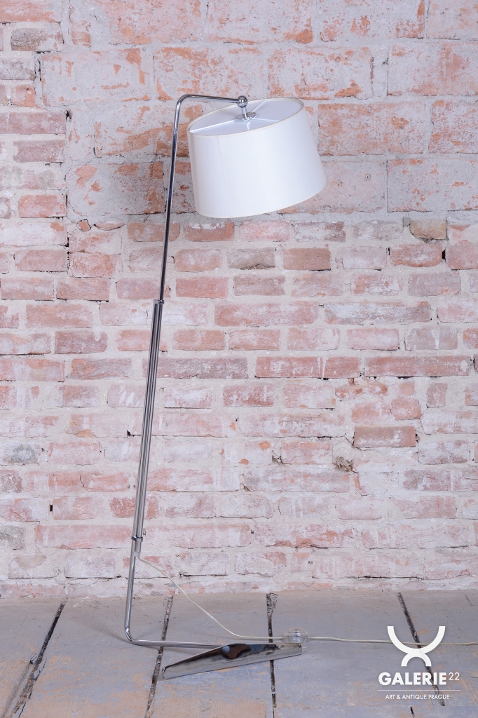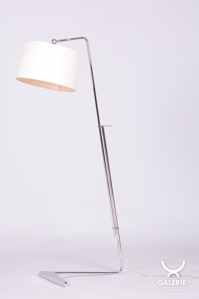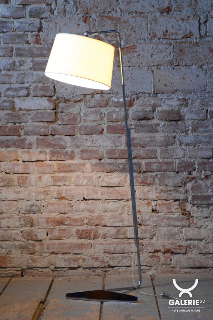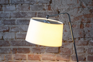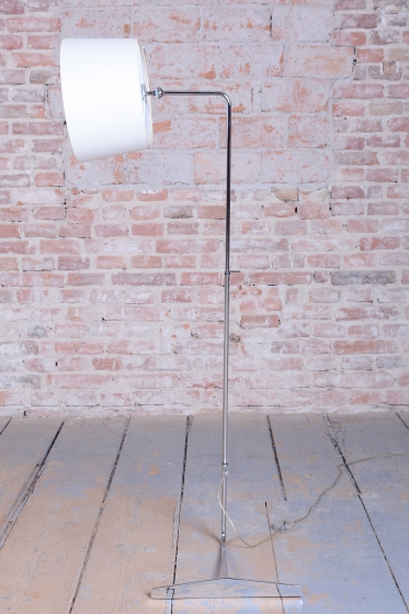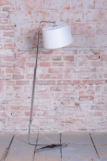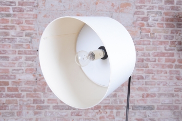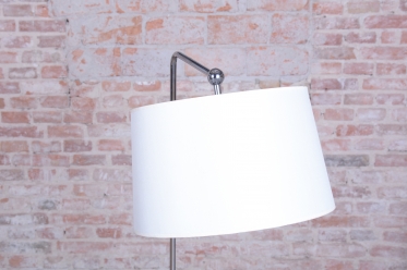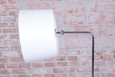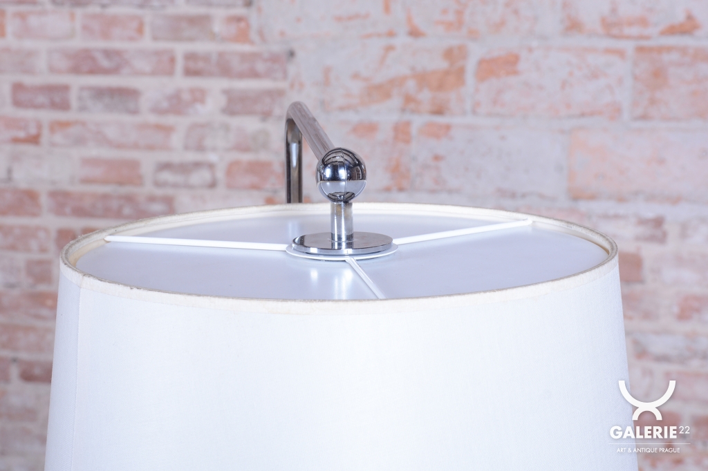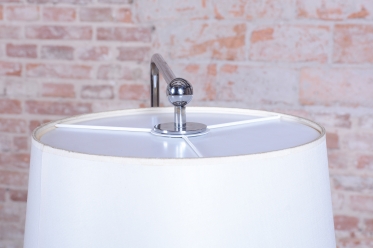 The structure is crafted from chrome-plated steel with an elegant and minimalist base that ensures stability. The chrome has been professionally cleaned and shines brightly. The lamp is fitted with a large, clean cotton lampshade in a cream color, providing pleasant diffused light.