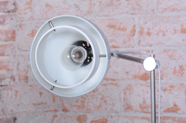 This is a highly sought-after, collectible piece from the renowned manufacturer NAPAKO, often attributed to the legendary designer Josef Hůrka. The lamp is crafted from an elegant combination of glossy chrome and lacquered steel.