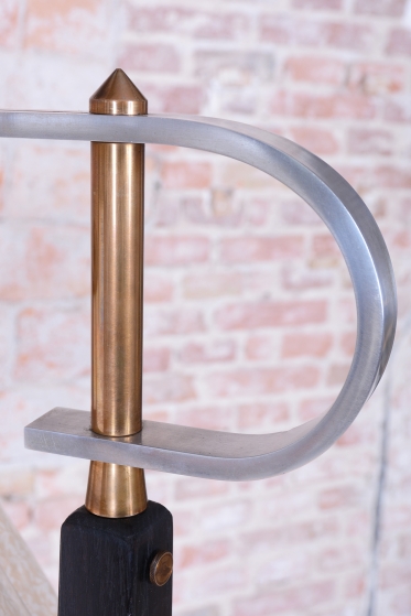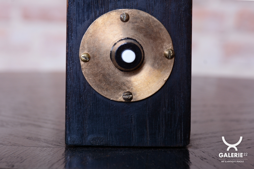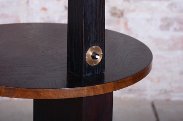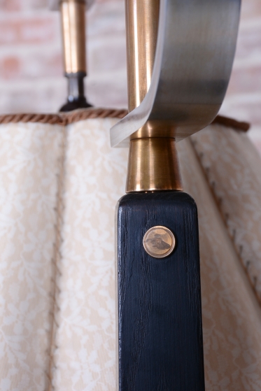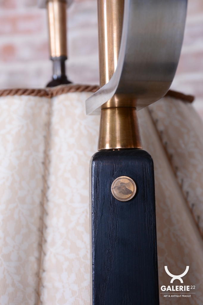 The lamps structure is crafted from solid oak and oak veneer, which has undergone meticulous restoration and features a revived original wood polish, enhancing the dark, noble tone. The design combines a vertical line with practical small shelves, which increases its functionality.