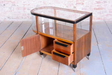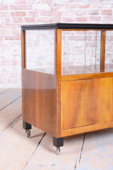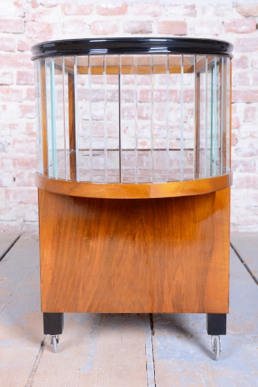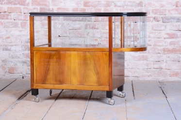 The structure of the cart is crafted from walnut-veneered blockboard, whose rich wood grain has been meticulously restored and lacquered to a high gloss, highlighting its sophistication. The cart boasts a rounded upper section with ground clear glass, which displays the contents while protecting them.