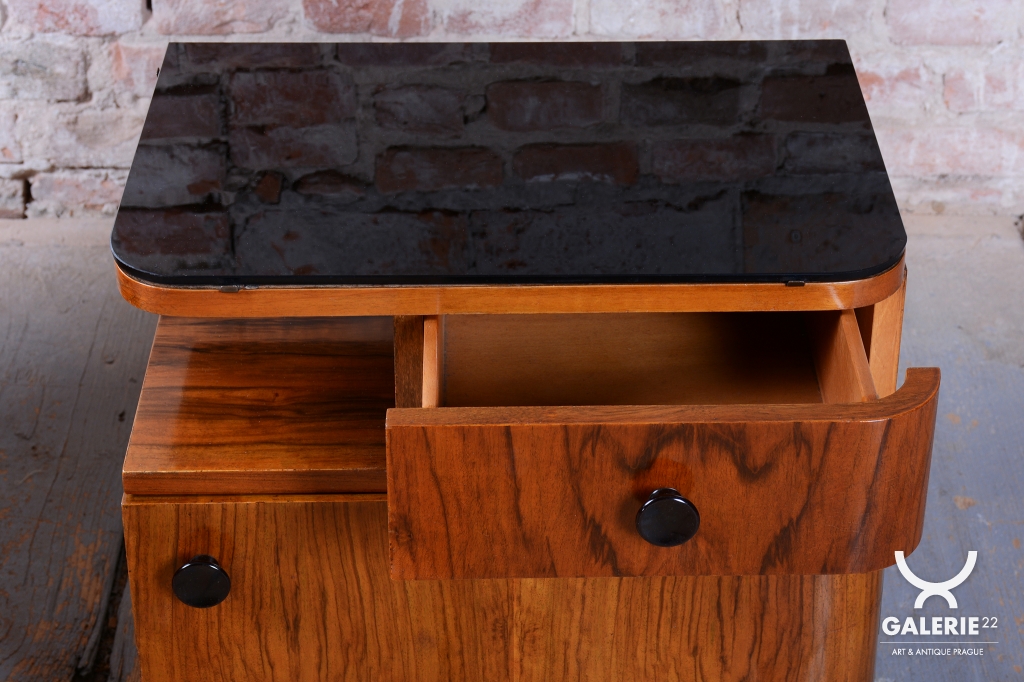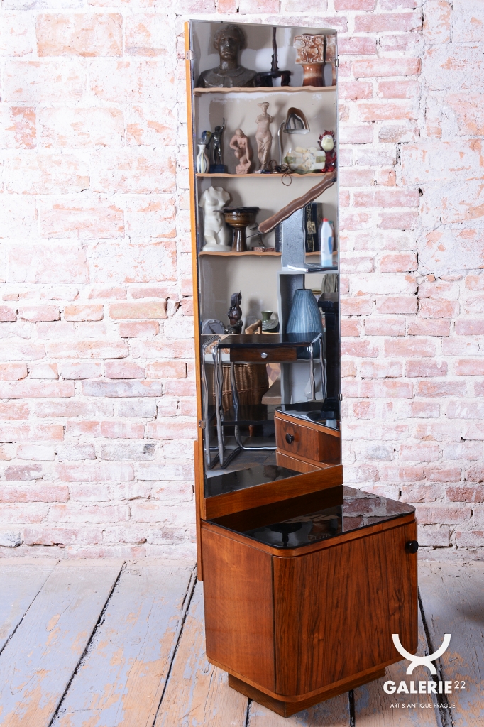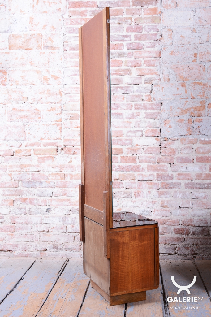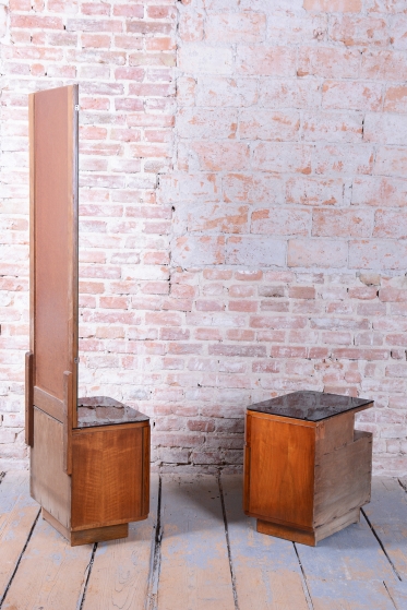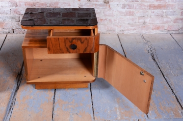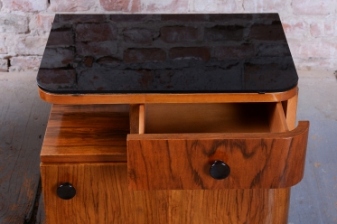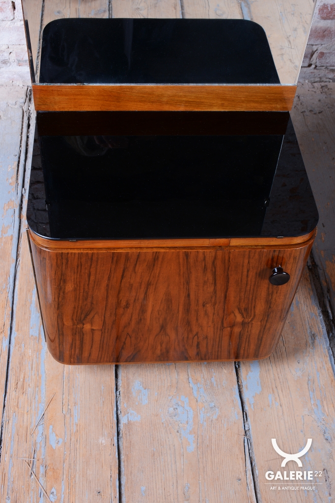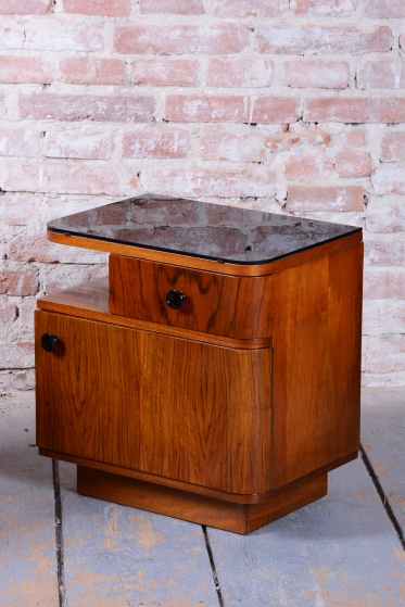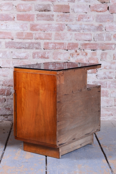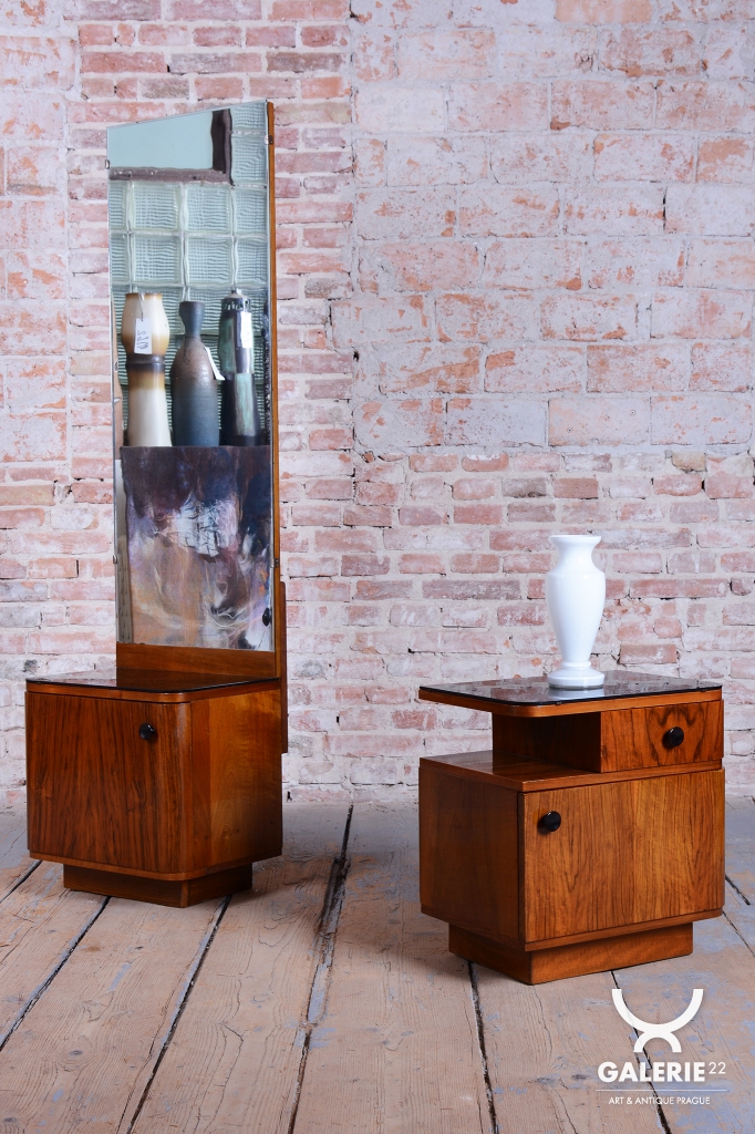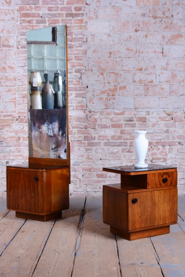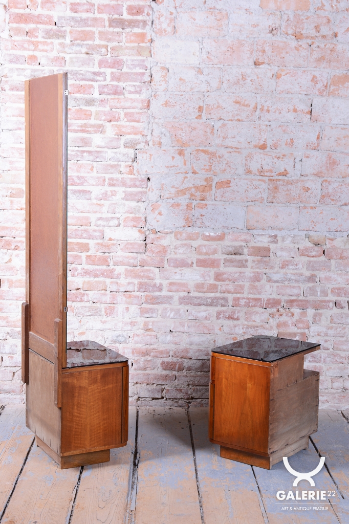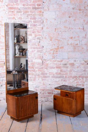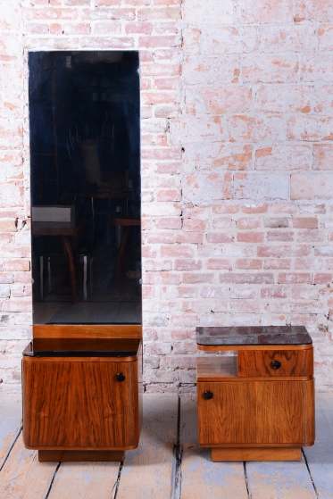 We present an exceptional bedroom furniture set consisting of an elegant vanity table and a single (originally asymmetrical) nightstand. This set represents a fascinating fusion of the elegance of Art Deco and the clean lines of the Mid-Century Modern style, dating to the transition period between these two iconic eras.