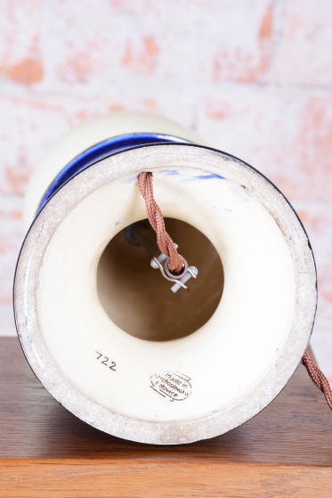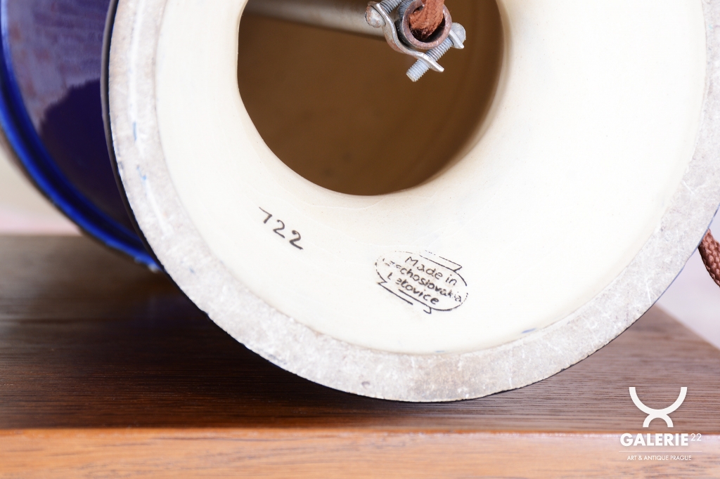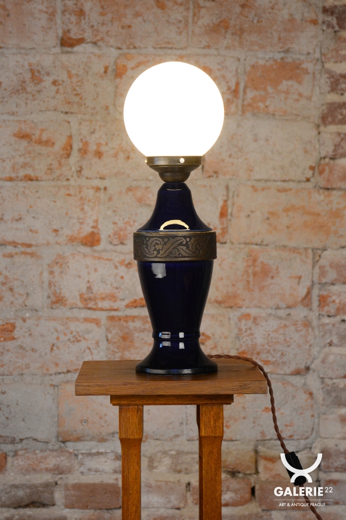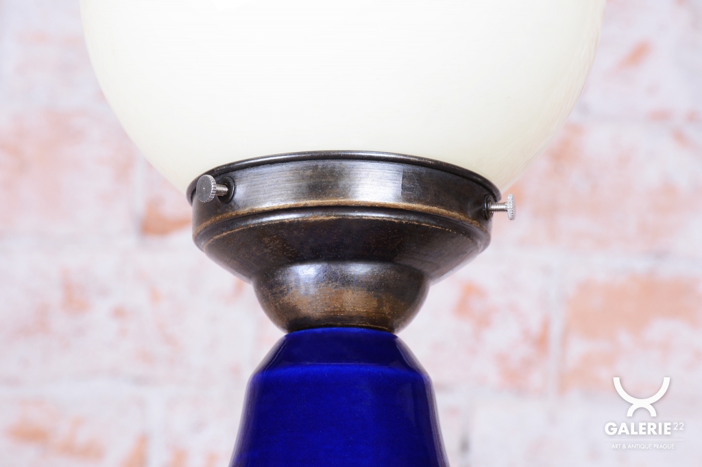 The characteristic feature of the lamp is its base made of cobalt glass, which is beautifully decorated with the technique of oroplastics (gilded relief), lending the lamp a regal appearance. The lamp is fitted with an elegant round opal glass lampshade, which provides soft and diffused light.