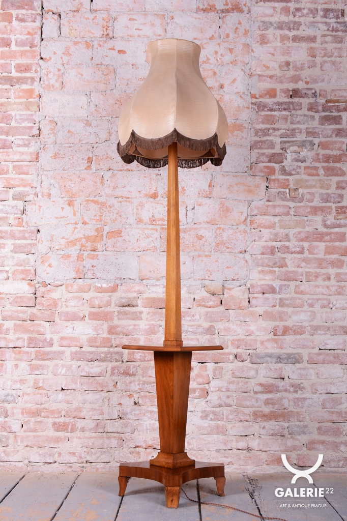 This elegant Art Deco floor lamp originates from Czechoslovakia from the 1920s. It is crafted from solid walnut and walnut veneer, which gives it a rich and timeless appearance with beautiful wood grain.