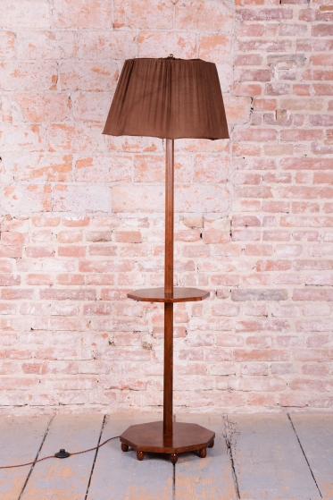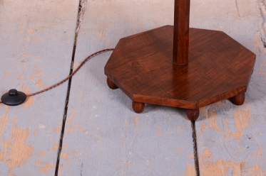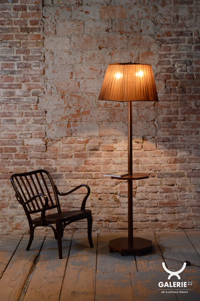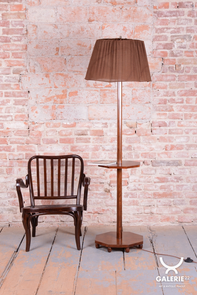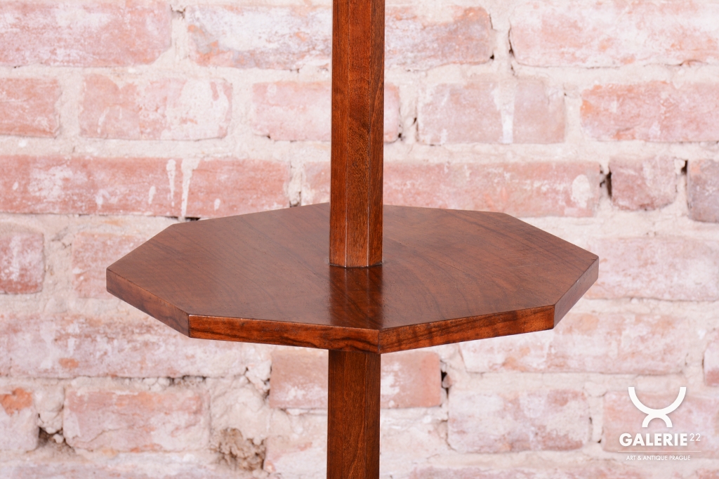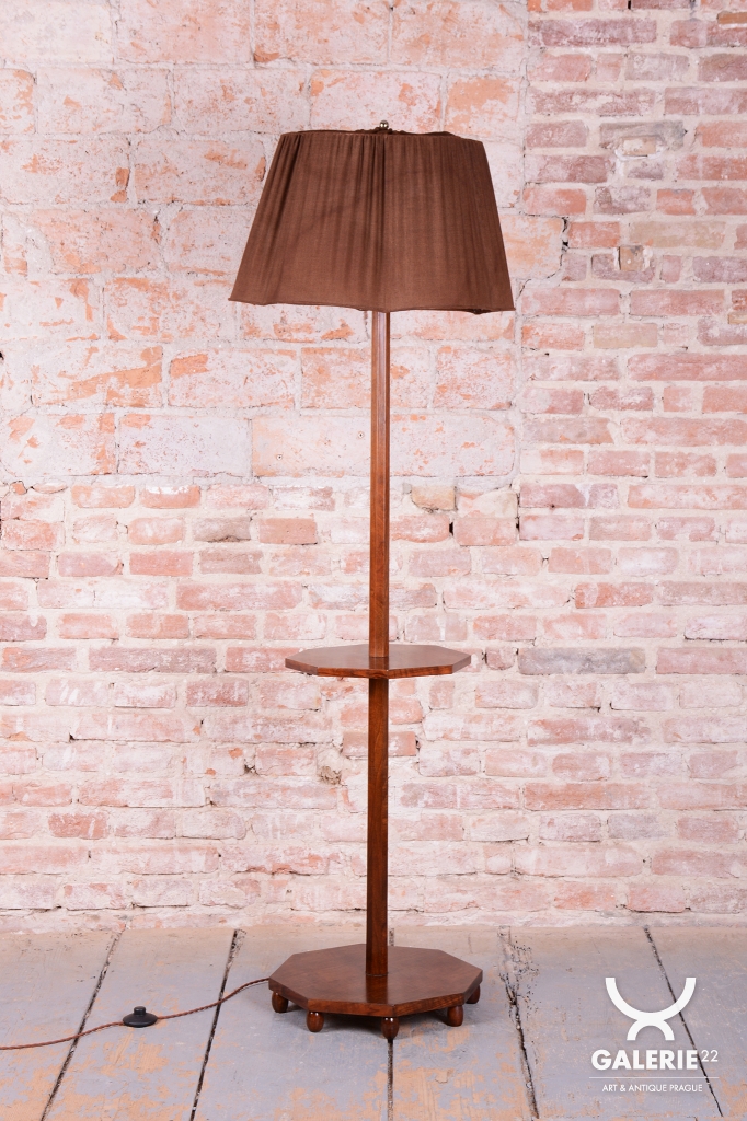 This elegant Art Deco floor lamp originates from Czechoslovakia from the 1920s. It is crafted from solid walnut and walnut veneer, which gives it a rich and timeless appearance with beautiful wood grain.