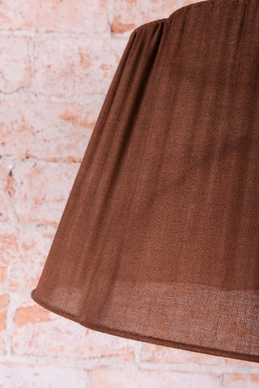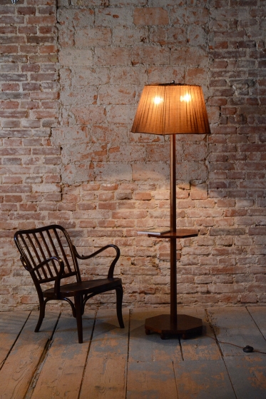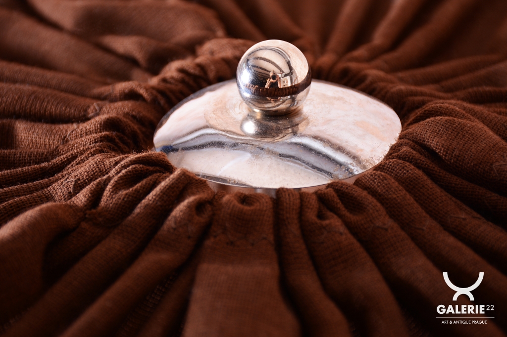 The lamp has undergone meticulous restoration, during which its original polish has been revived, highlighting its authenticity. It is fitted with a textile lampshade that complements the overall aesthetic and provides pleasant illumination. For safe and reliable use, it has been newly electrified.