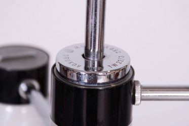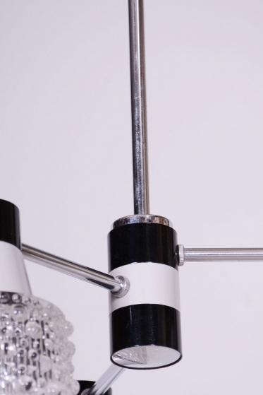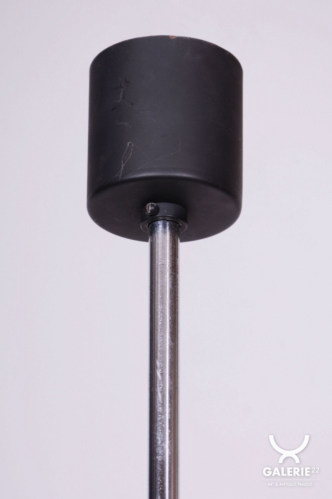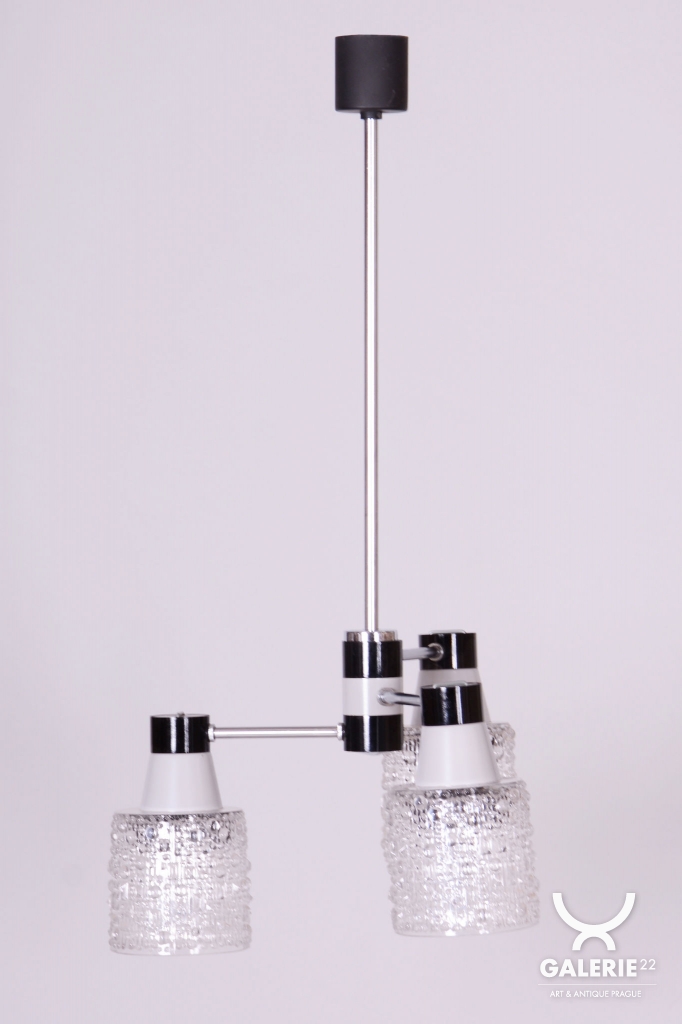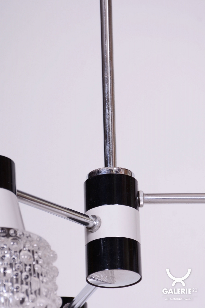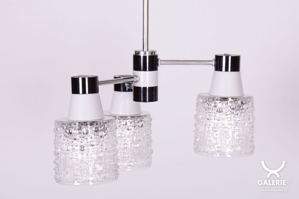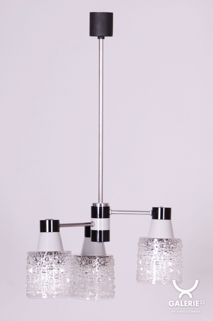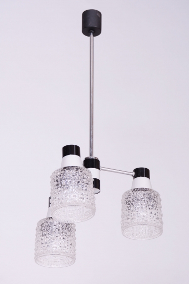 This three-arm chandelier, produced by the Drukov cooperative in Brno, is a prime example of Czechoslovak design from the 1970s. The fixture represents the later phase of the Mid-Century style, emphasizing technical precision and geometric purity. The overall composition, based on a central cylinder from which three horizontal arms extend, gives the piece a modern, industrial feel.