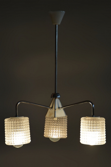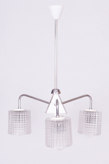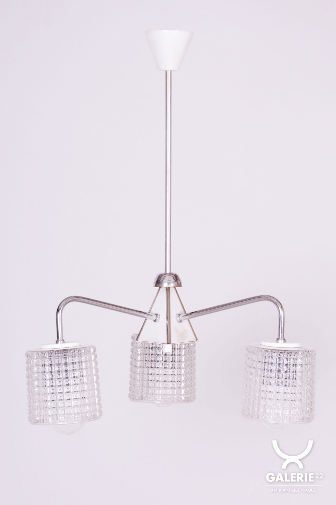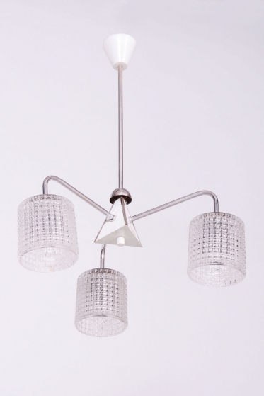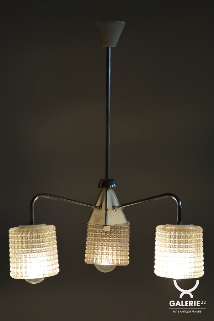 This three-arm chandelier, produced by the Drukov company in Brno, is a striking representative of Czechoslovak design from the 1970s. The fixture combines the geometric austerity of the late Mid-Century style with industrial elements typical of that period and manufacturer. The elegant construction relies on a harmonious contrast between professionally cleaned chrome-plated steel and black lacquered metal details, giving the chandelier a modern and timeless look.