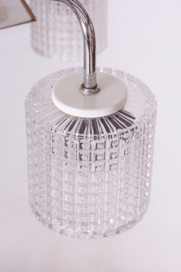 The primary aesthetic draw consists of three shades with a diameter of 12 cm, made of textured clear glass. This specific glass surface refracts light when illuminated, creating a unique play of shadows and reflections within the interior while maintaining high brightness. The shades are securely held in black metal cups that flow seamlessly into the chrome arms.