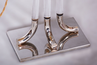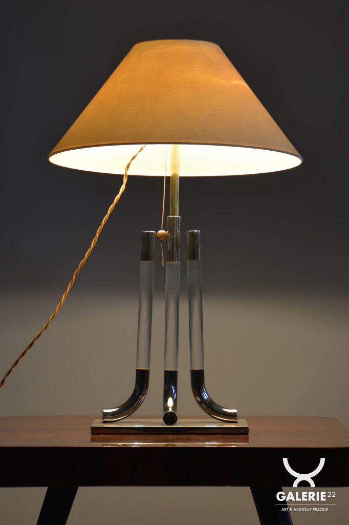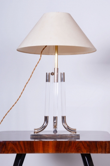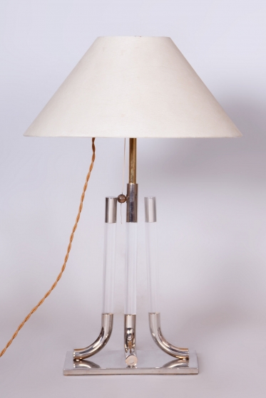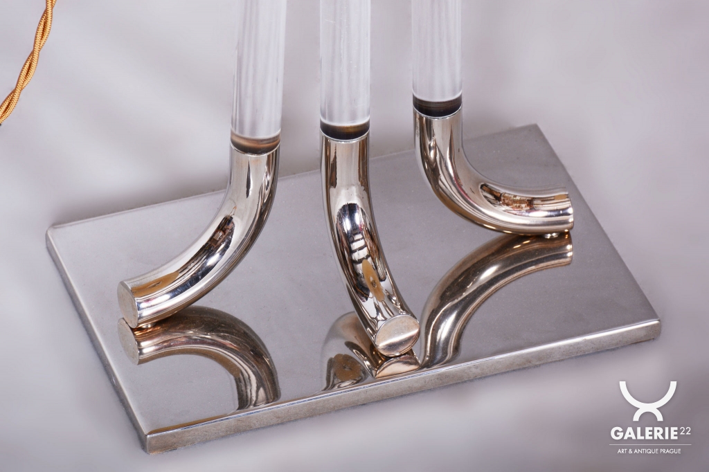 This table lamp is a prime example of 1970s Italian design, embodying the luxurious and bold aesthetic of the late Mid-Century style. The lamp captivates with its monumentality and a refined combination of materials typical of Italian production from this era. The dominant feature of the base is a central glass cylinder set into elements made of professionally cleaned chrome-plated steel, whose high mirror finish lends the object a modern and exclusive character.