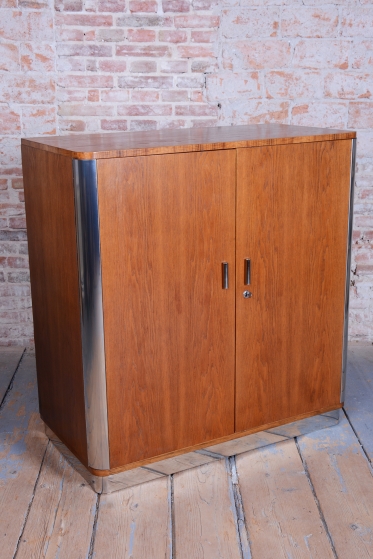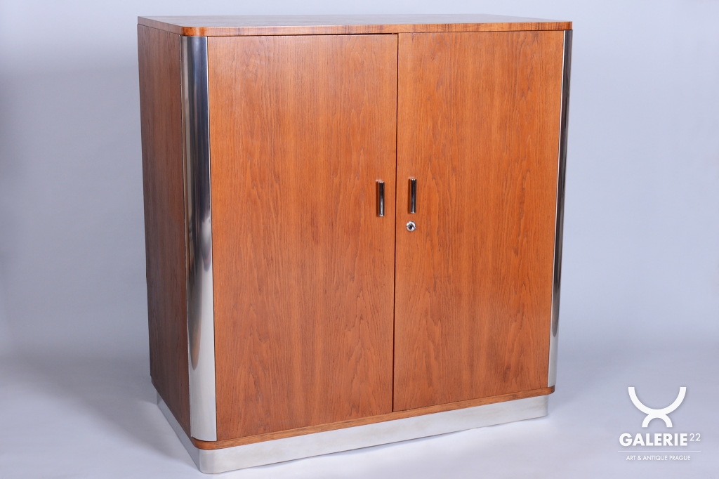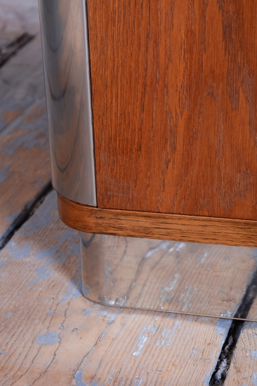 The cabinet is crafted from spruce blockboard veneered with oak, which gives it a warm, natural look with a beautiful wood grain. A key design feature is the metal elements made of chrome-plated steel, which have been professionally cleaned to highlight their modernist aesthetic.