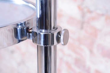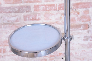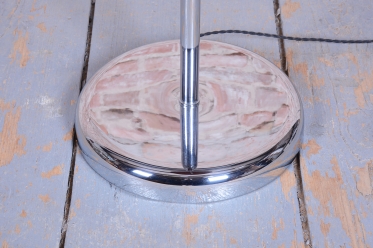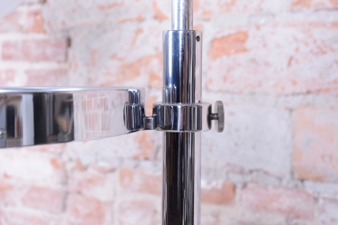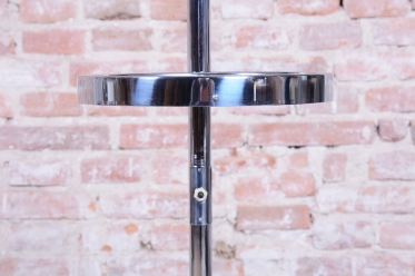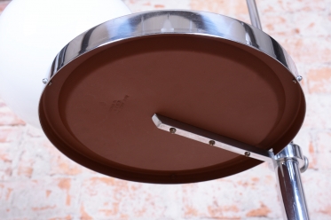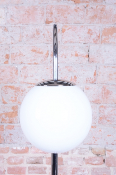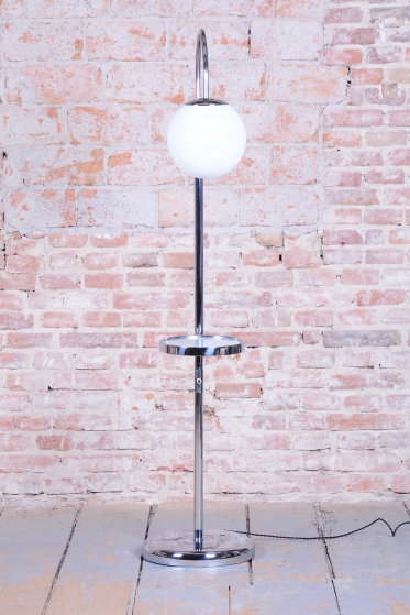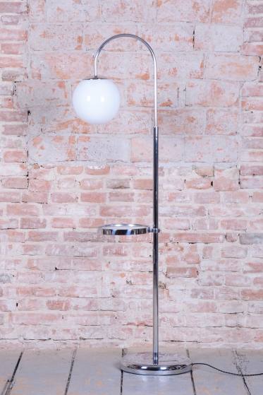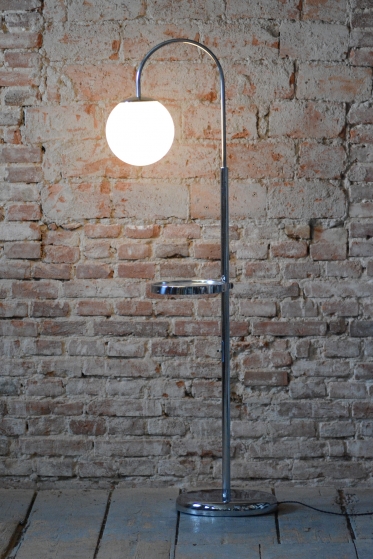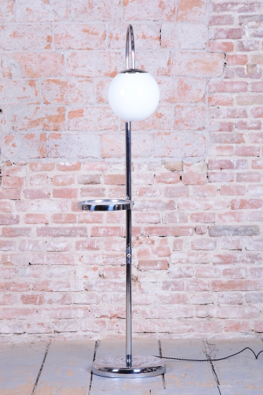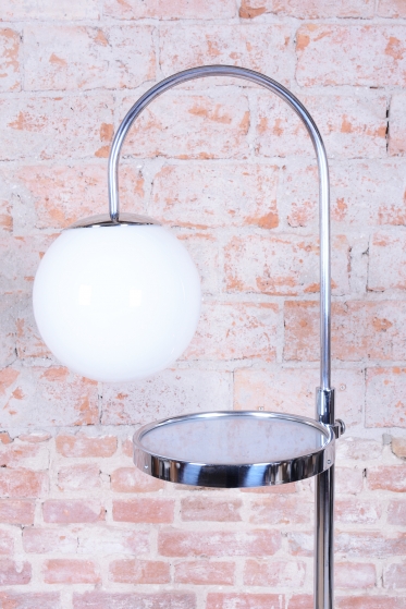 The lamp is crafted from tubular chrome-plated steel, which has been professionally cleaned and shines like new. It is fitted with a round lampshade of milky opal glass with a 25 cm diameter, ensuring pleasant and even illumination. A unique and practical feature is the shelf, whose height can be easily adjusted.