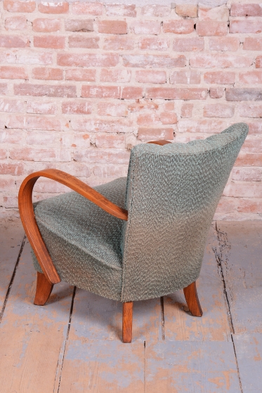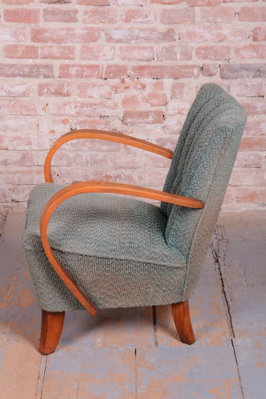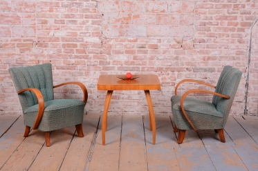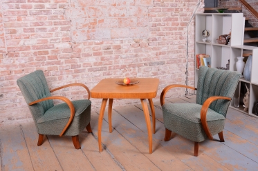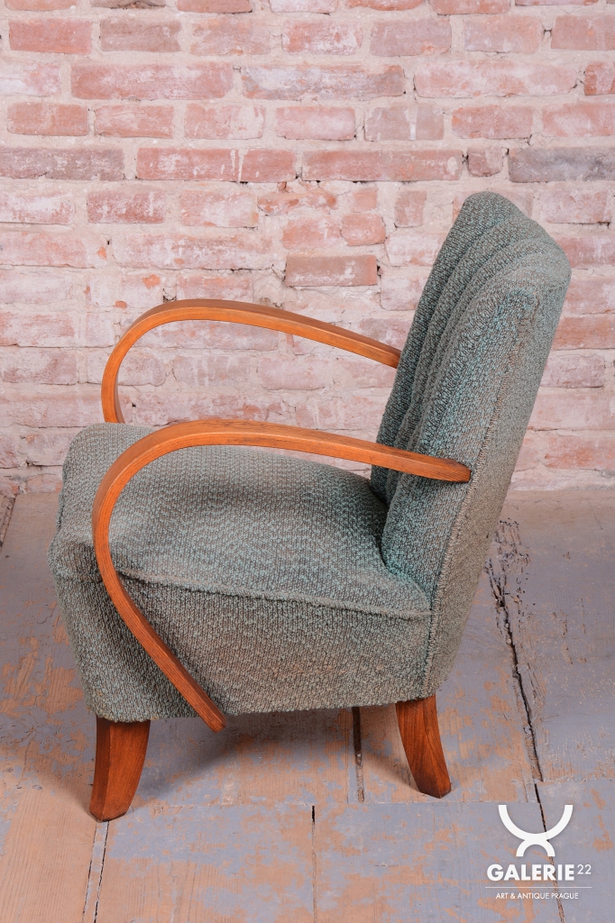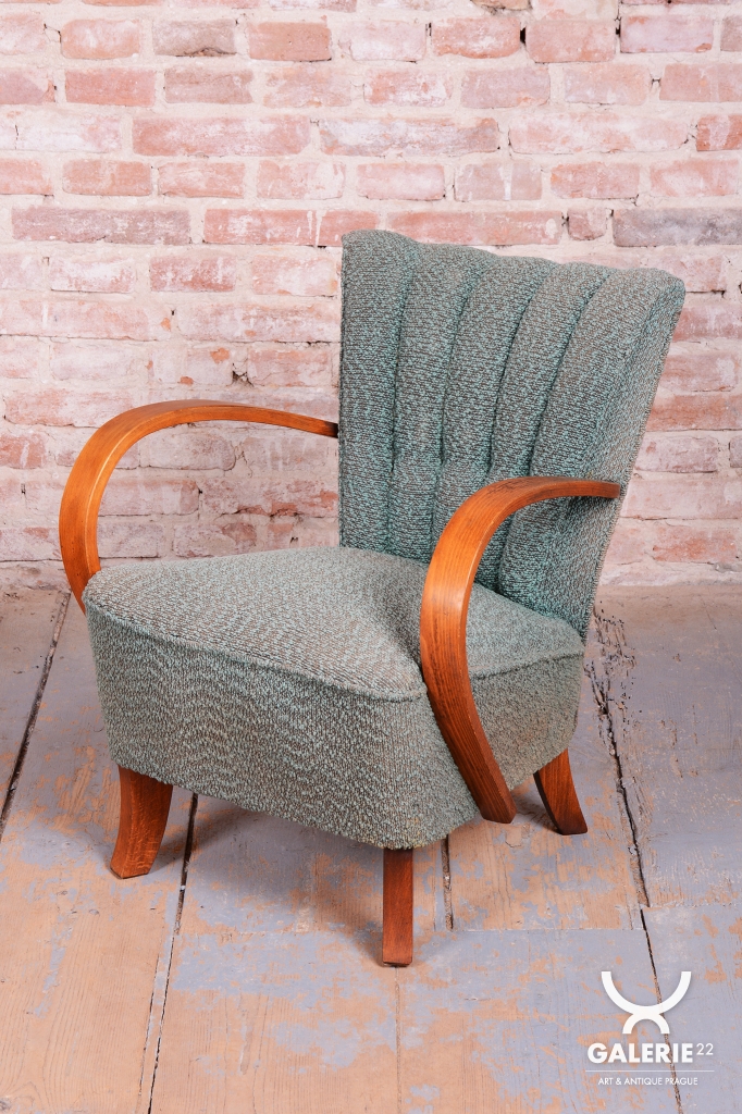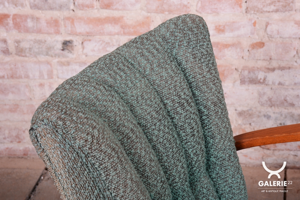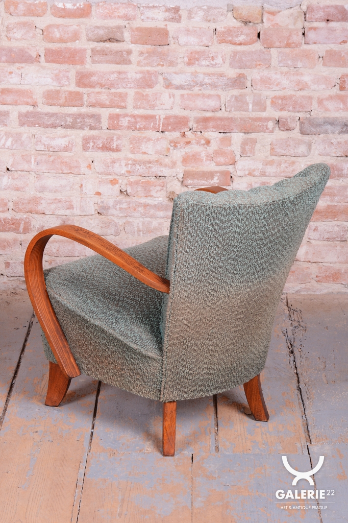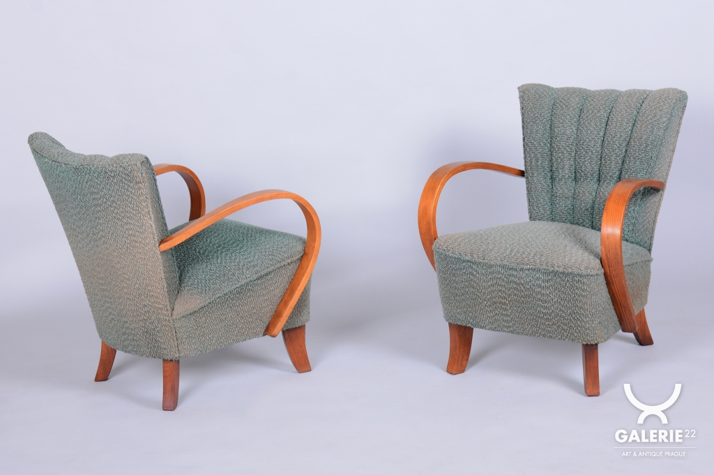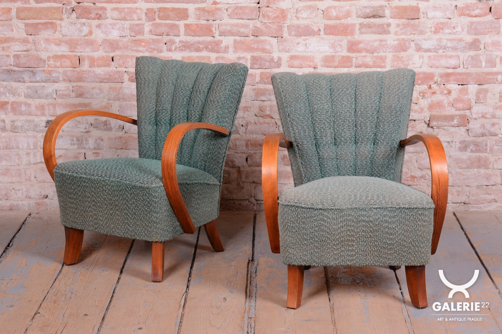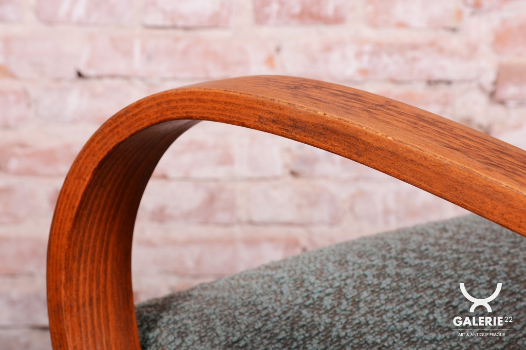 This pair of armchairs is an authentic example of Art Deco furniture design, which dominated Czechoslovakia during the 1920s. The frames of both pieces are crafted from high-quality solid beech wood, with the elegantly curved armrests providing the characteristic dynamic look of the era. During the professional restoration process, the original wood polish was carefully revived, highlighting the natural grain of the solid wood and its warm tones.