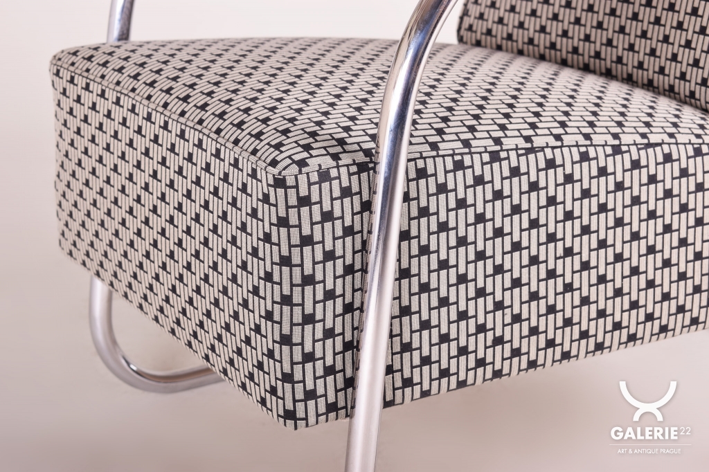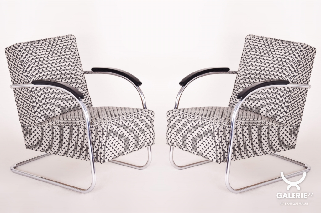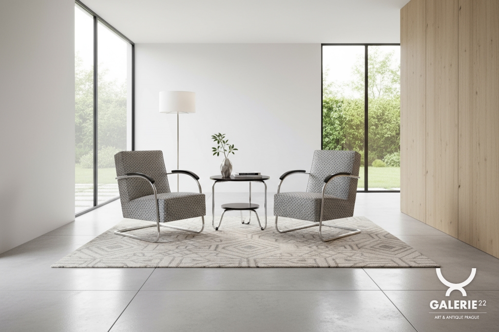 This iconic pair of armchairs is a masterpiece of the Bauhaus style, originating from Czechoslovakia. Designed by the acclaimed architect Anton Lorenz for the renowned manufacturer Mücke - Melder, these are the highly sought-after FN 21 Famos model chairs, produced in the first half of the 20th century.