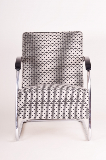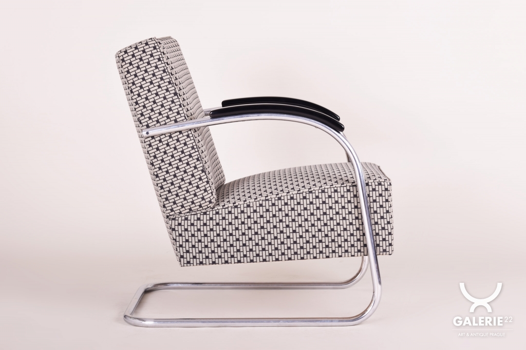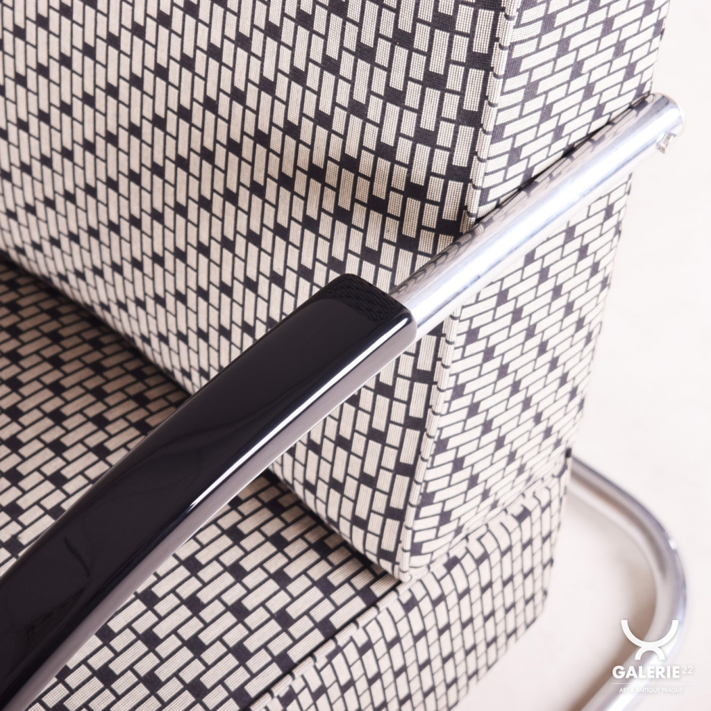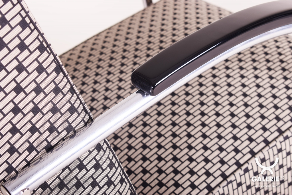 The armchairs have undergone full restoration, featuring new upholstery and professionally cleaned chrome. An elegant contrast to the polished metal is provided by the solid beech armrests, which have been finished in a fresh, high-gloss black piano lacquer. Thanks to their timeless design and meticulous craftsmanship, these chairs are a perfect addition to both modern and historical interiors.