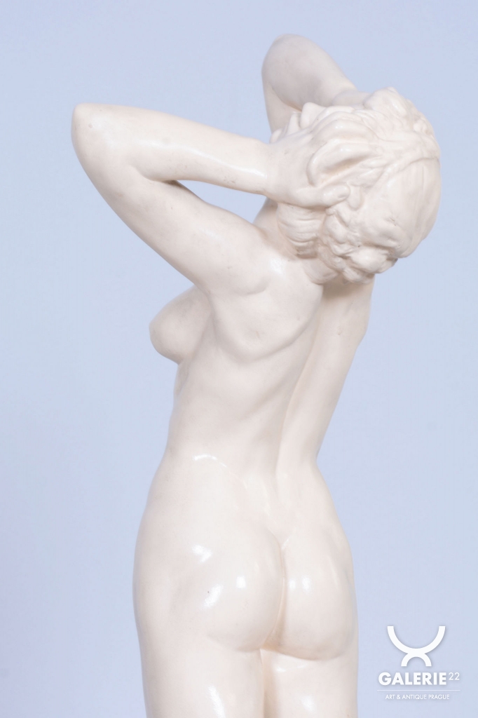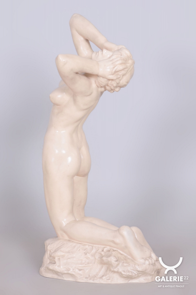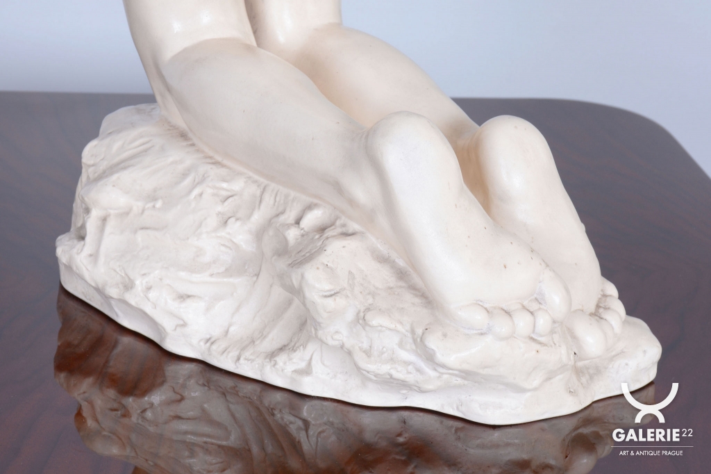 Due to its artistic quality and association with a major name in Czechoslovak ceramics, this is a highly prized collector's item. The sculpture is an ideal statement piece for serious collectors of interwar art or as a luxury decorative detail that brings a strong narrative and aesthetic depth to any interior.