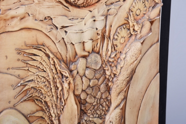 The central composition features a stylized landscape dominated by a circular sun element. The artist utilizes rich texture and relief depth to narrate a story of nature: the right side bears motifs of blooming flowers, the left evokes ripe ears of grain, and the lower section is filled with tactile pebbles. The entire scene is set in a massive dark wooden frame with a distinct patina, which gives the piece a brutalistic touch and firmly anchors it within a space.