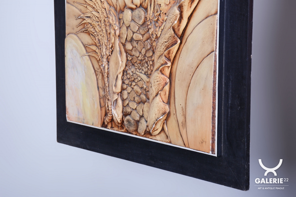 This hanging ceramic relief from 1992 is a striking example of Czech postmodern ceramics, seamlessly continuing the tradition of the Brussels style while embracing a Mid-Century aesthetic. The piece represents a fascinating transition from applied art to free sculpture and spatial painting, a trend typical of artists working in Czechoslovakia during the late 80s and early 90s.