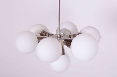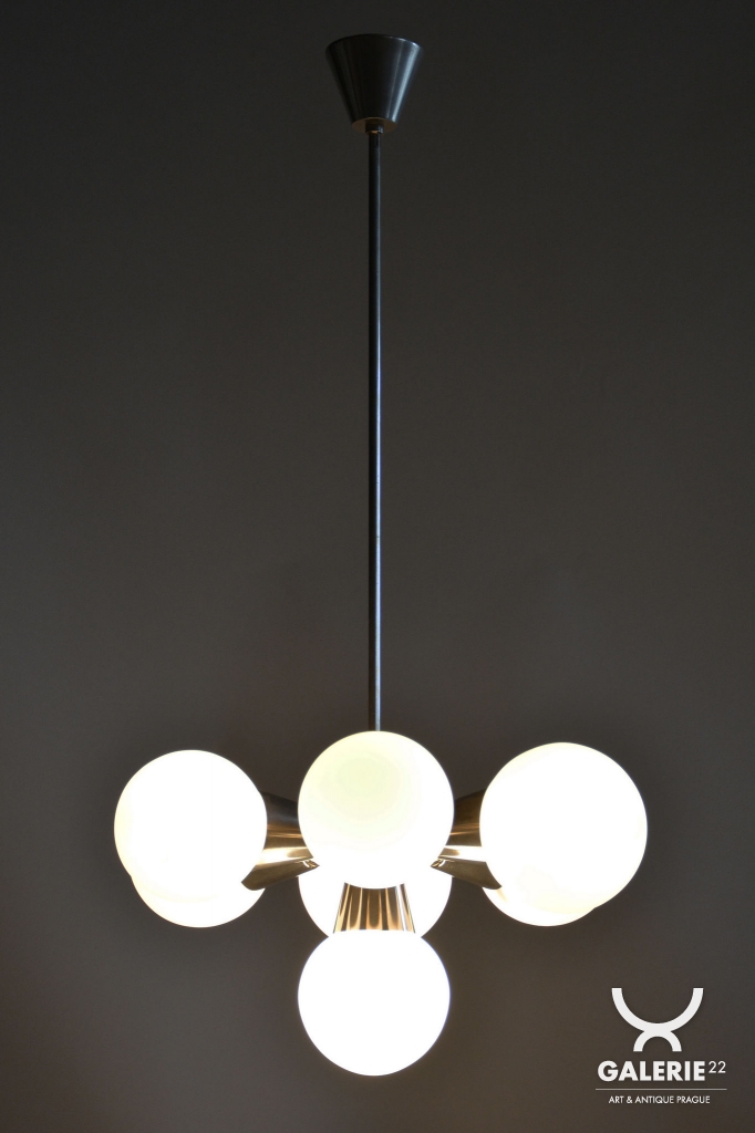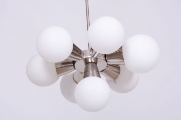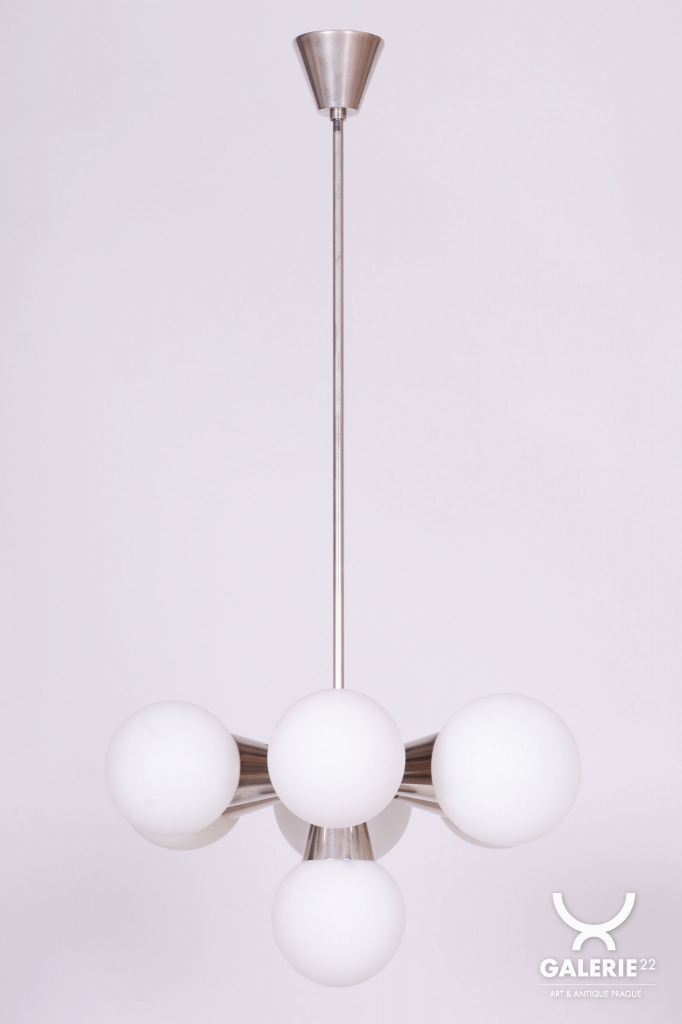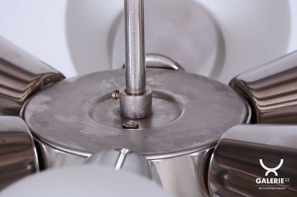 This Sputnik-style chandelier is an iconic representative of the Space Age and progressive 1970s Czechoslovak design. Manufactured in the renowned works of Kamenický Šenov, its dynamic, kinetic form celebrates the futurism of the Mid-Century Modern era. The foundation of the chandelier is a chrome-plated steel construction, professionally polished to a mirror finish. The composition features opal milk glass shades that create a harmonious whole: a central bottom shade with a 14 cm diameter is complemented by 6 side shades with a 12 cm diameter. This configuration ensures perfect light distribution throughout the room.