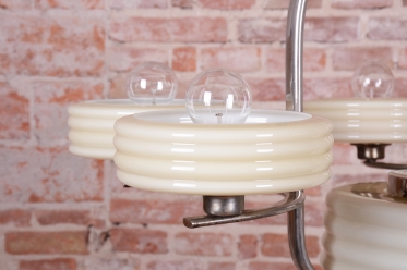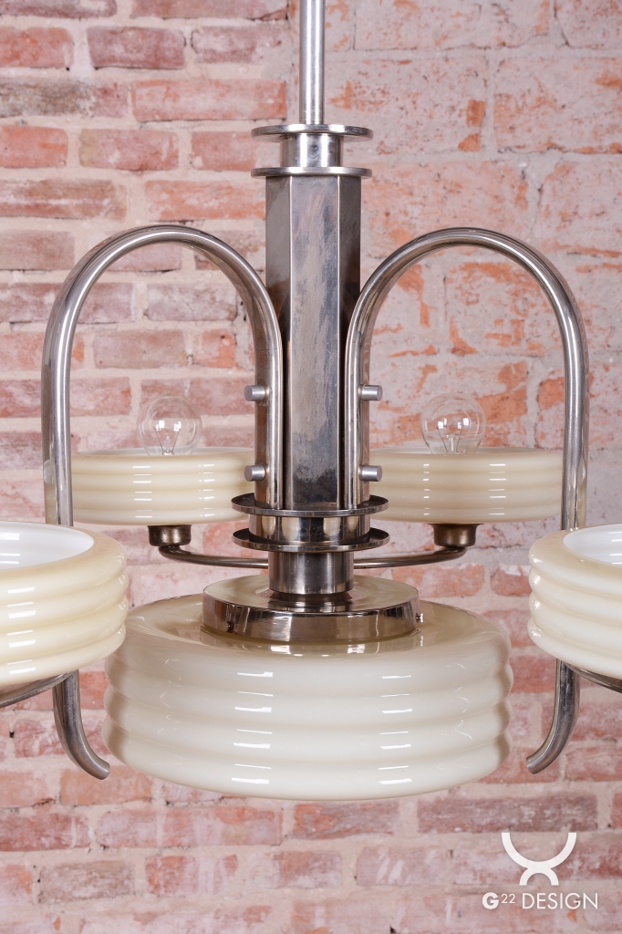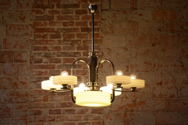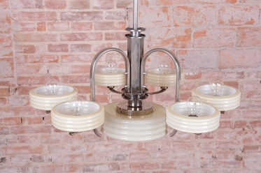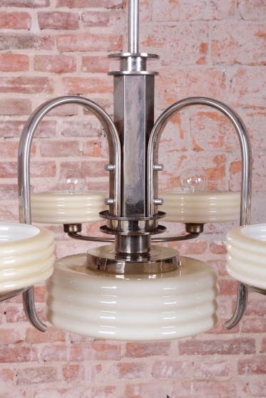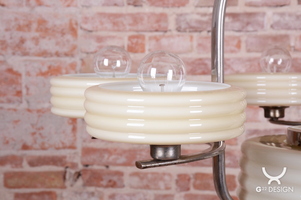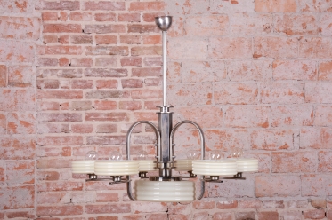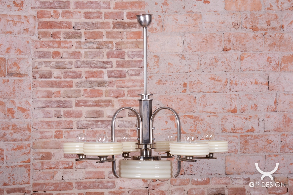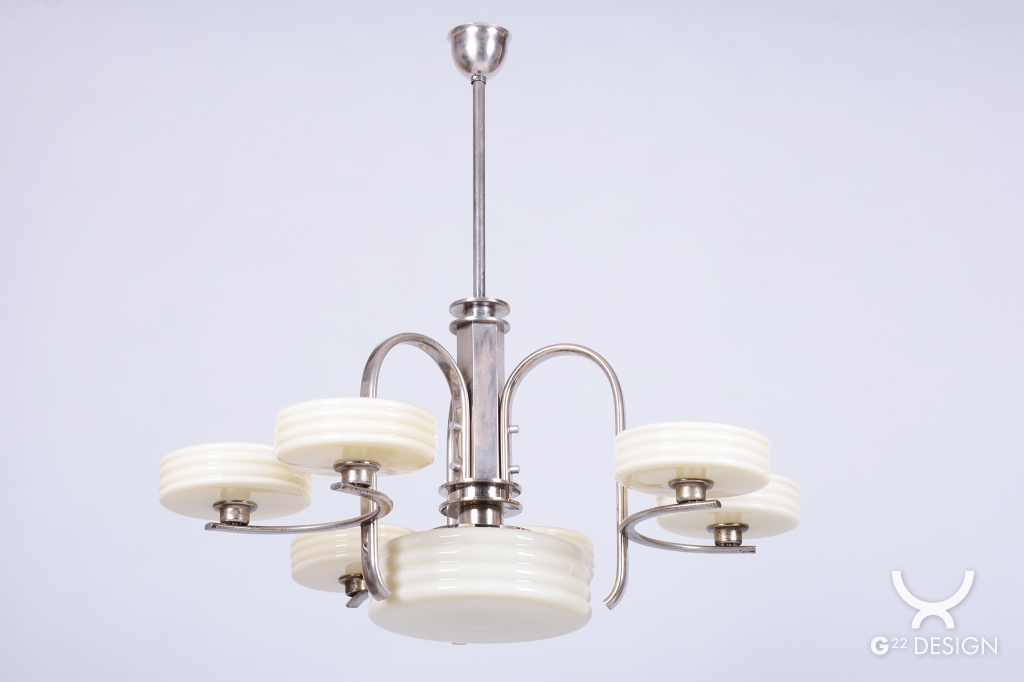 This imposing large salon chandelier is a premier example of Czechoslovak design from the 1920s. Its form sits at the intersection of two major movements – the decorative Art Deco and the strictly functional Bauhaus. This unique synthesis is reflected in the harmonious blend of geometric lines and technical precision, typical of the modern interiors of the young republic. The nickel-plated steel structure has been professionally cleaned during the restoration process, regaining its characteristic cool luster, which, combined with its generous dimensions, lends the fixture an air of luxury.