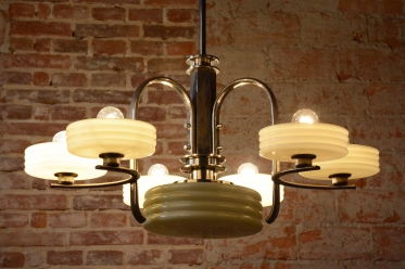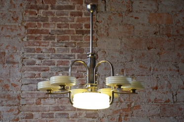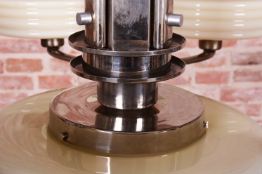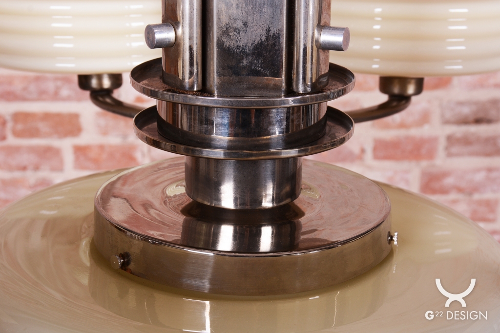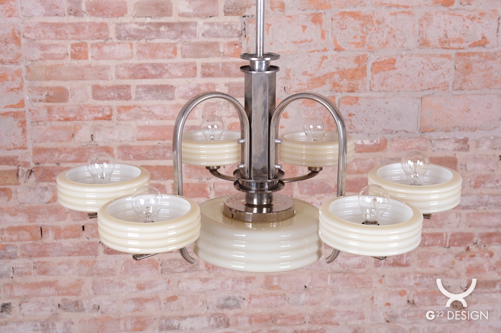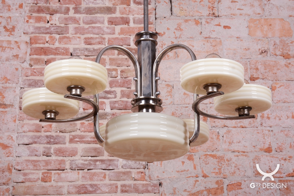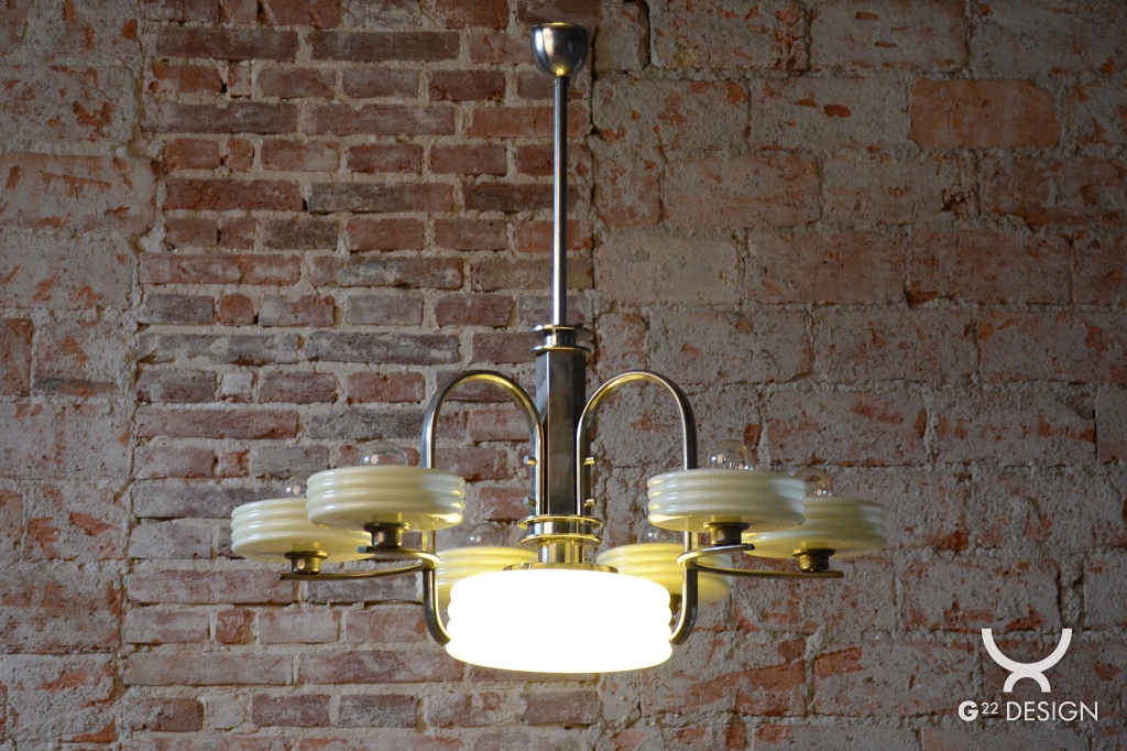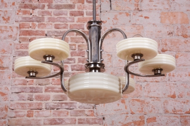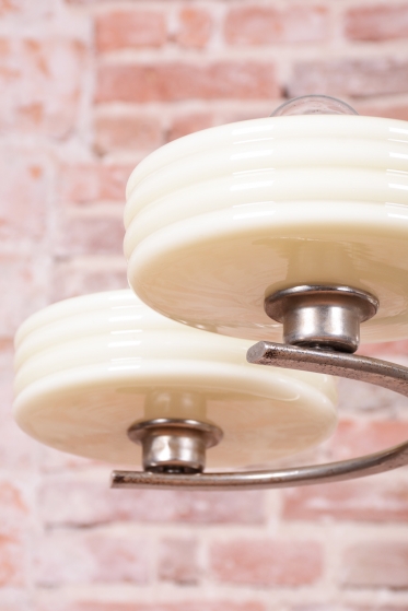This imposing large salon chandelier is a premier example of Czechoslovak design from the 1920s. Its form sits at the intersection of two major movements – the decorative Art Deco and the strictly functional Bauhaus. This unique synthesis is reflected in the harmonious blend of geometric lines and technical precision, typical of the modern interiors of the young republic. The nickel-plated steel structure has been professionally cleaned during the restoration process, regaining its characteristic cool luster, which, combined with its generous dimensions, lends the fixture an air of luxury.