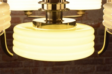 The centerpiece of the chandelier consists of opal glass lampshades, crafted in a milky white finish. These shades were designed to create soft, pleasantly diffused light within a space without glare, making it ideal for illuminating large salons or dining rooms. As part of the comprehensive restoration process, new wiring has been installed to meet current safety standards, ensuring that the chandelier is fully functional and ready for immediate use in demanding modern households or prestigious commercial spaces.