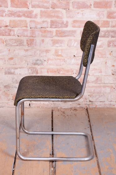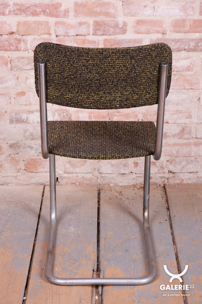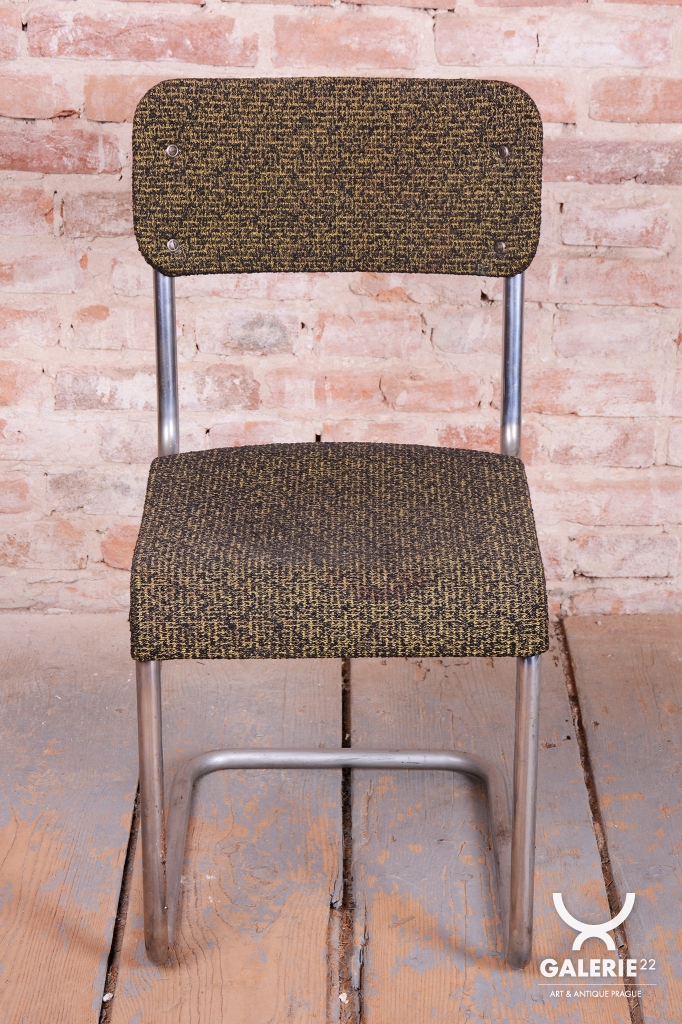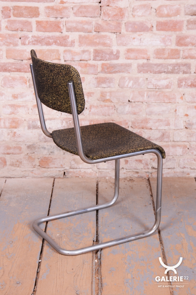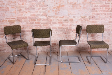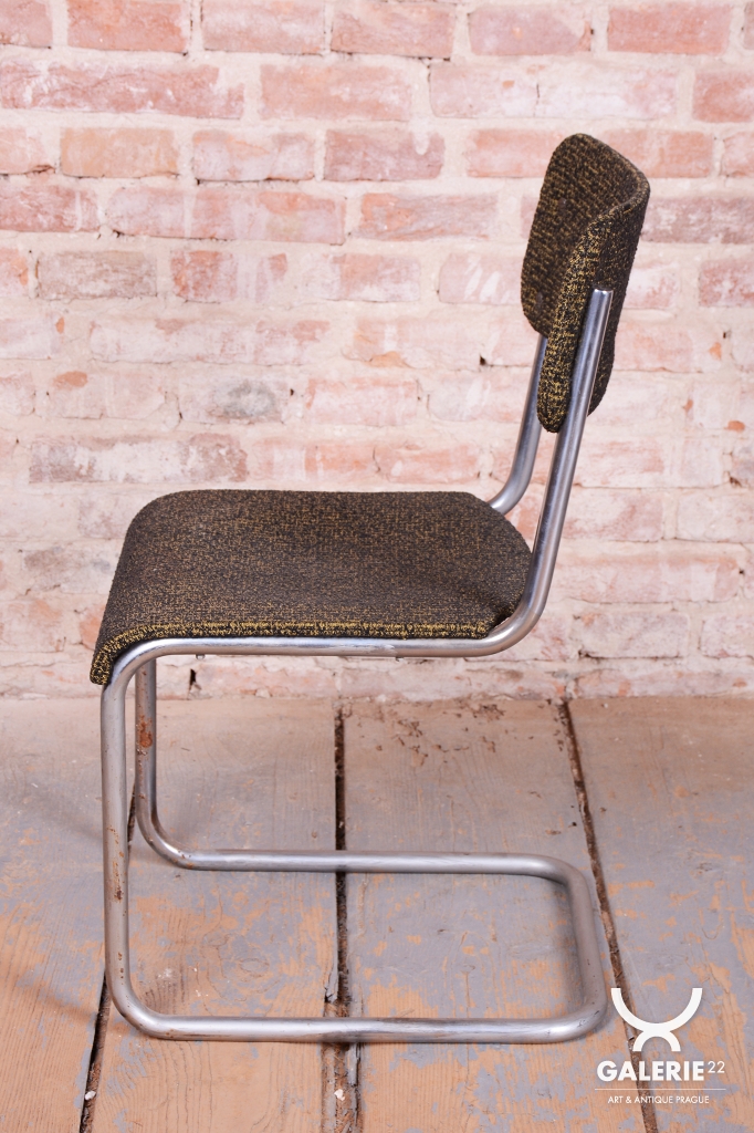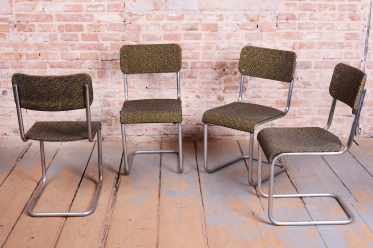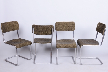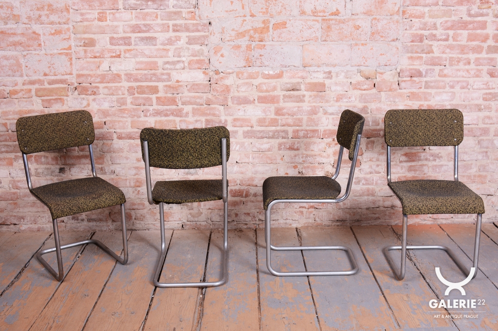 This set of four chairs is an iconic representative of 1930s European Modernism, fully rooted in the aesthetics and functional principles of the Bauhaus school. The design relies on the revolutionary cantilever construction (a springy chair without back legs), which symbolized technological progress and a new, lightweight approach to living during the interwar period. The tubular steel construction has been thoroughly cleaned during professional restoration, restoring its high mirror-like luster and highlighting the elegant, fluid lines of the bent metal.