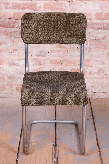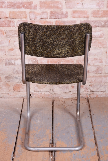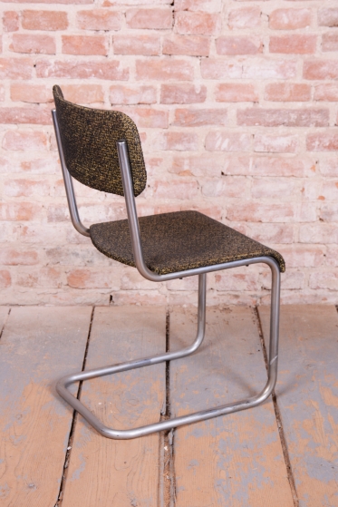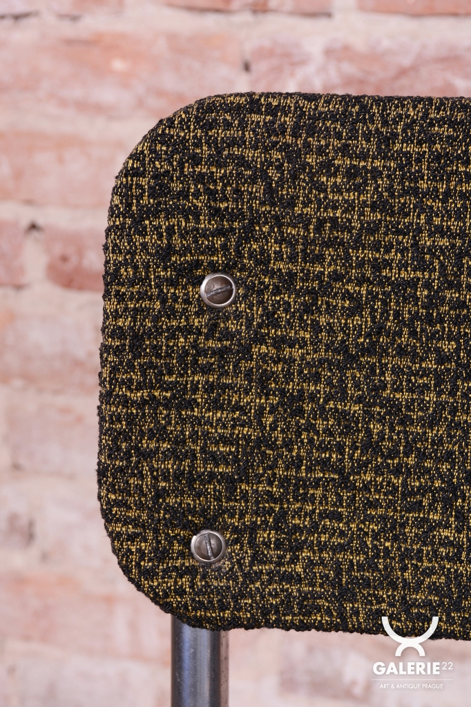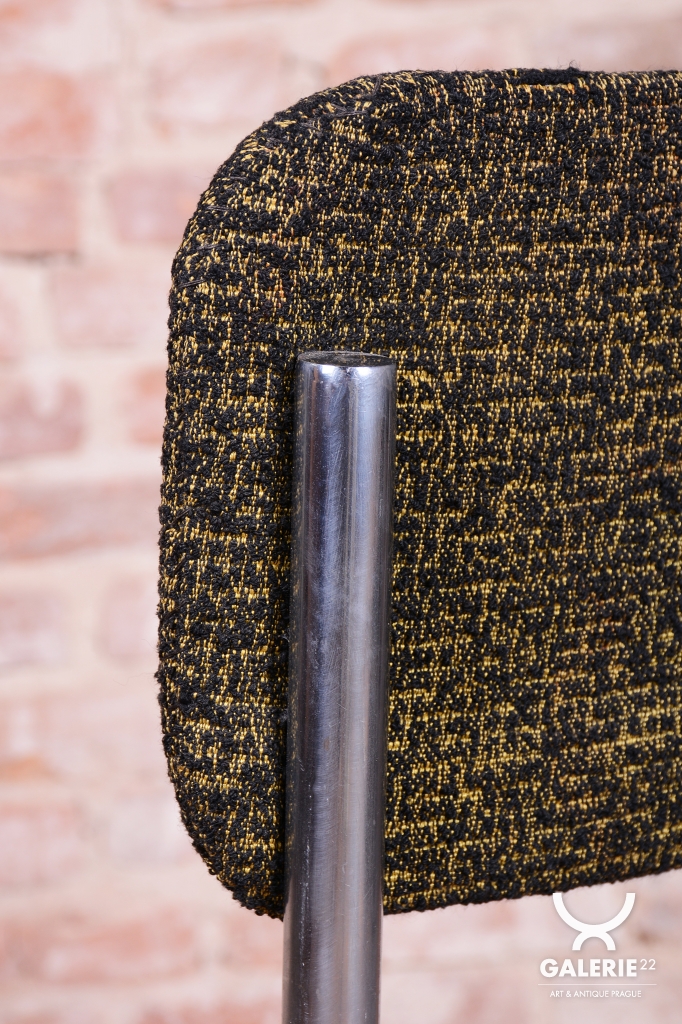 The seats and backrests are upholstered in a textile fabric in a subtle dark mottled tone, harmoniously complementing the cool chrome surface. The entire set has undergone professional machine cleaning, removing impurities while preserving the fabric strength and authentic appearance. The ergonomic shaping of the backrest and the natural elasticity of the steel frame provide the high level of seating comfort typical of this type of modernist furniture.