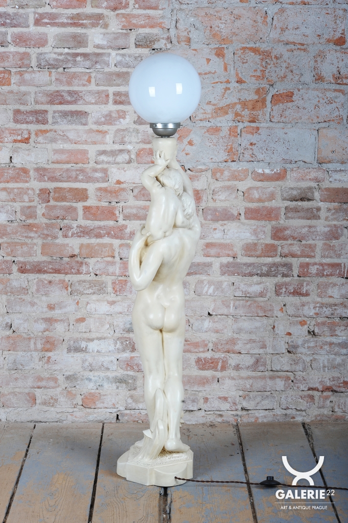 This figural floor lamp is an extraordinary gem of 1920s German decorative art, masterfully combining sculptural artistry with functional design. The fixture features a delicately modeled female nude carrying a small child (putti) on her shoulder, creating a harmonious scene that emphasizes classical proportions and fluid lines. The base clearly bears the signature "Sommer," probably referring to the German artist Ferdinand Sommer. Unfortunately, we do not have more precise proof that this is this particular artist.
