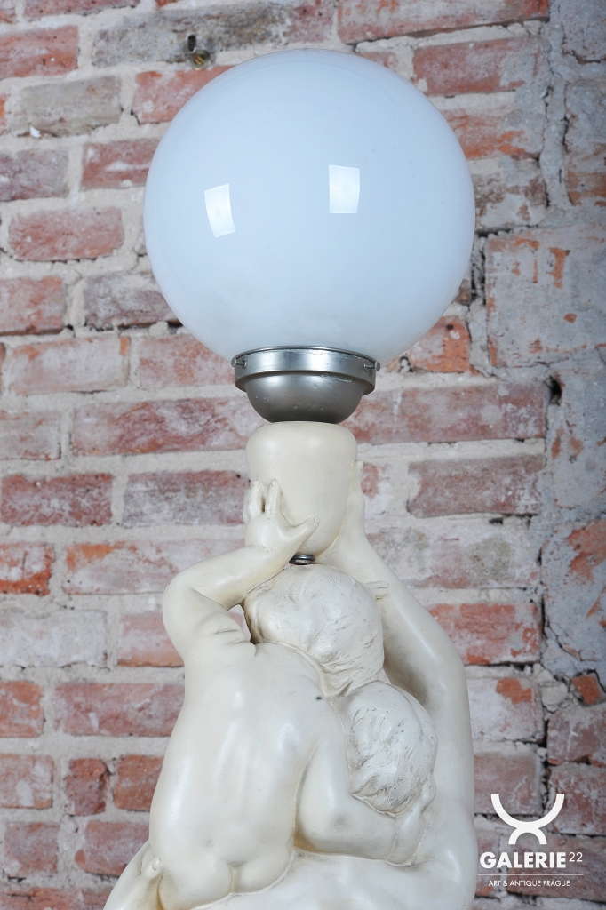 The material is high-quality ceramic with an ivory finish, which highlights the subtle details of the modeling and provides the entire object with a noble appearance. The lamp is topped with a large opal glass sphere with a 25 cm diameter, whose geometric shape creates an interesting visual contrast to the organic curves of the sculpture while ensuring a soft, pleasantly diffused light. Stylistically, the piece sits at the transition between Late Art Nouveau and Early Art Deco, making it an ideal luxury accessory for representative halls, salons, or bourgeois interiors.