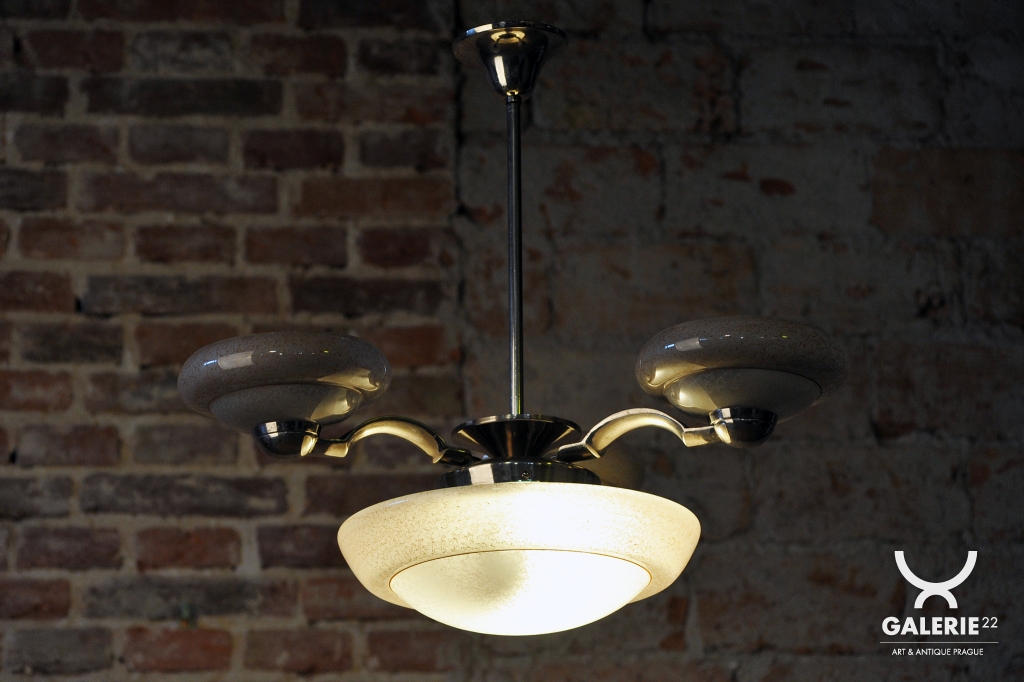 This chandelier is a representative example of Czechoslovak Art Deco from the 1920s, blending luxurious materials with modern geometric forms. The foundation is a dynamically shaped chrome-plated steel construction, which has been professionally cleaned during restoration to restore its visual dominance and light-reflecting brilliance.