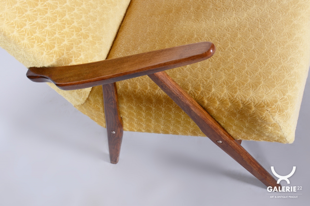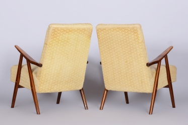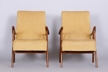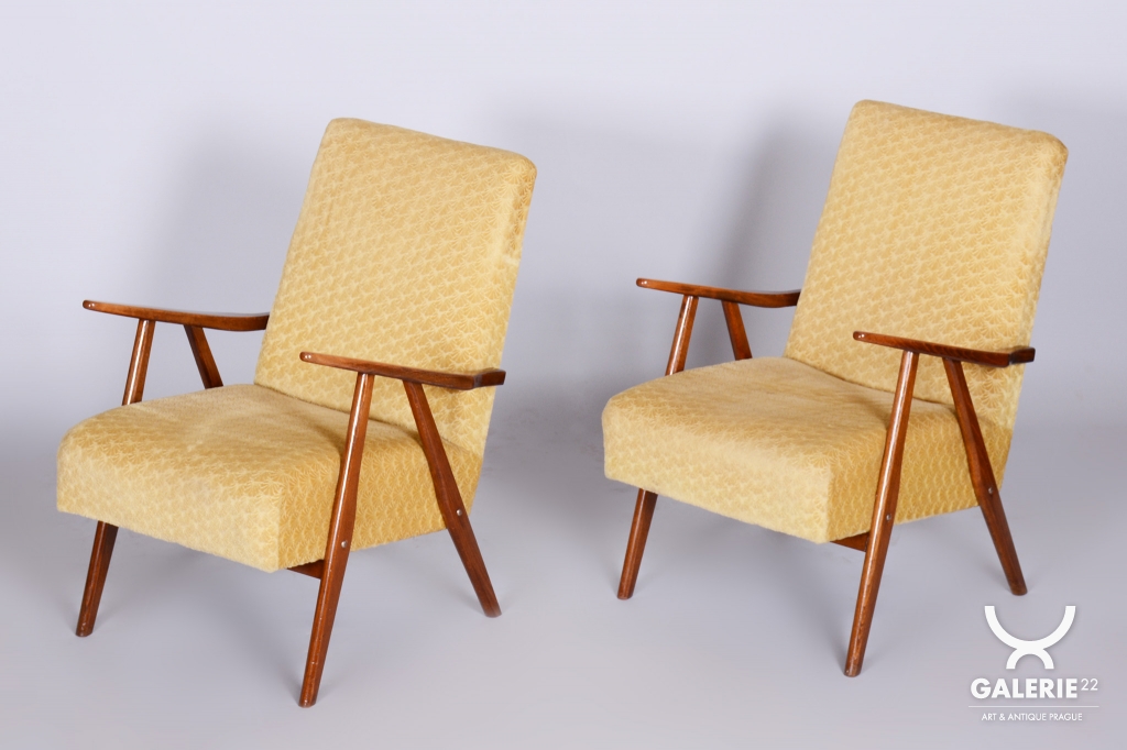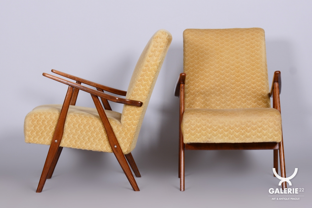 This pair of armchairs is an excellent example of Mid-Century Czechoslovak design from the mid-20th century, produced by the renowned Ústředí lidové umělecké výroby (ÚLUV). The armchairs feature a lightweight, elegant construction of solid beech wood, which has been treated with a revived polish during professional restoration, highlighting the warm tone and natural grain of the timber. The design, with its smoothly shaped armrests and subtle legs, is typical of the contemporary effort to combine modern functionality with traditional craftsmanship.