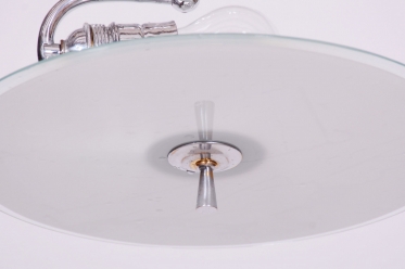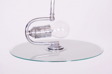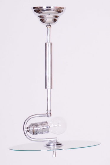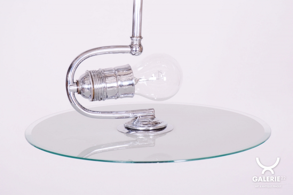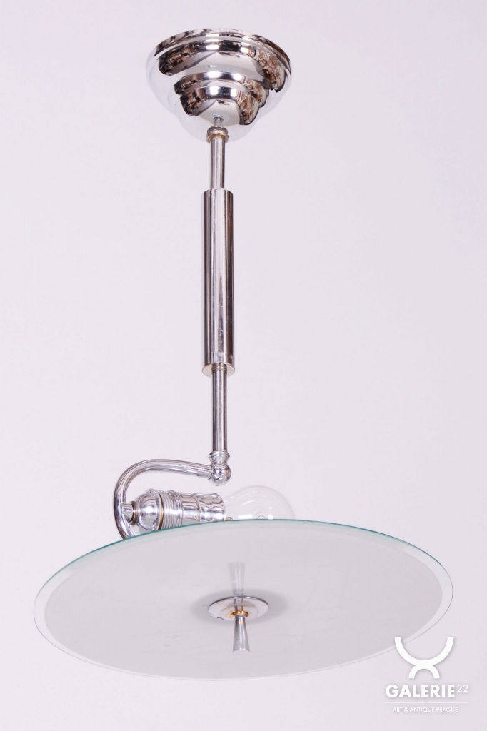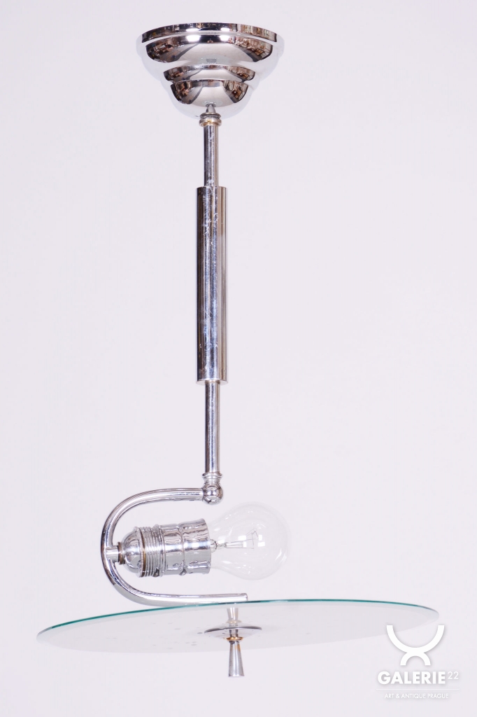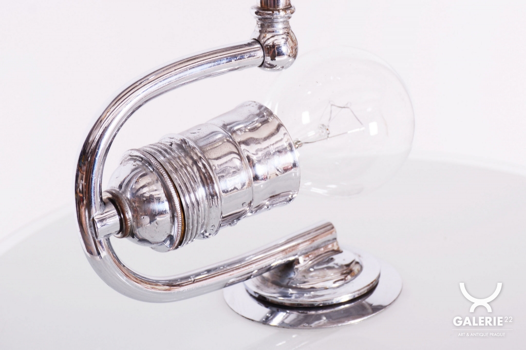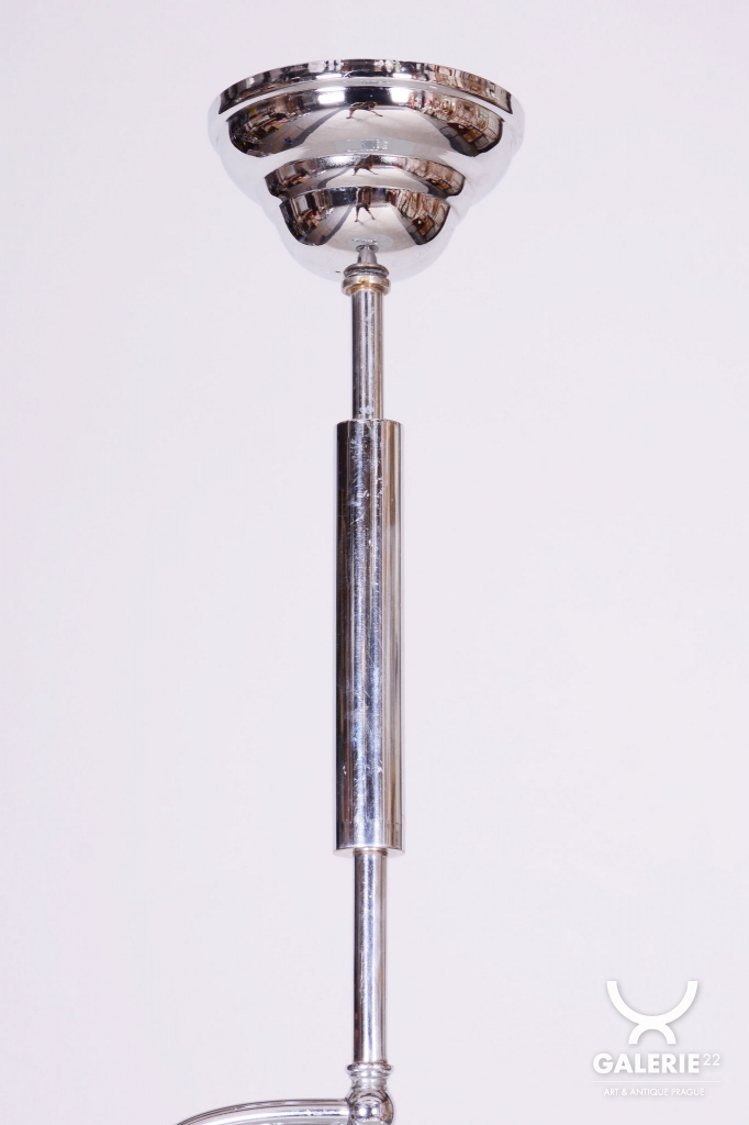 This chandelier is an iconic representative of Functionalist design and the Bauhaus movement in 1930s Czechoslovakia. During this period, the beauty of an object was derived from its function and technical purity. The dominant feature is the chrome-plated steel construction, which has been professionally cleaned to a mirror finish as part of the restoration. The subtle metal arms support opal (milk) glass shades, providing a pleasant, soft, and evenly diffused light.