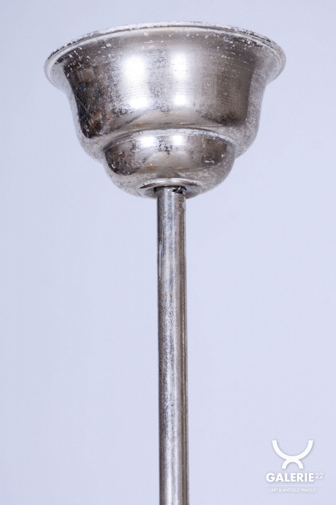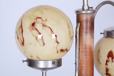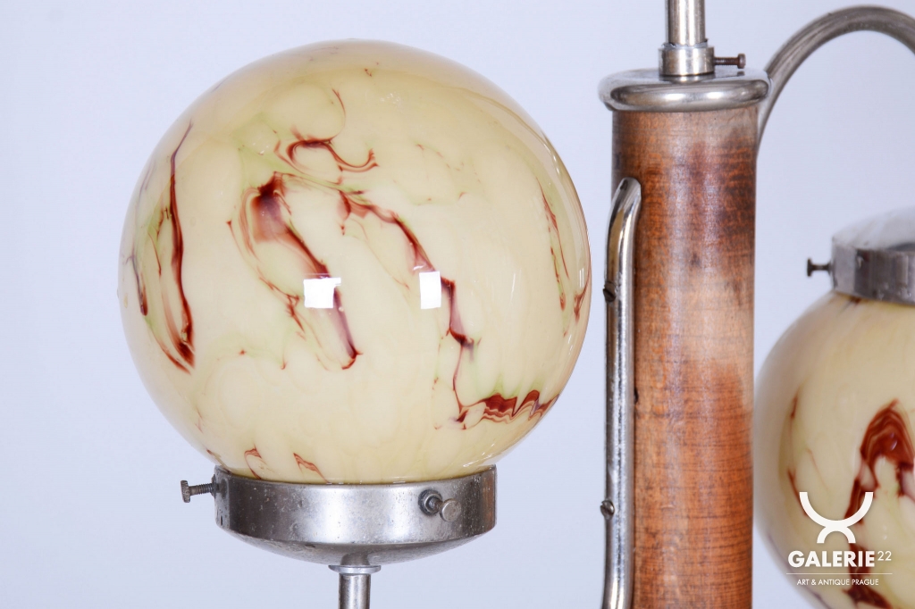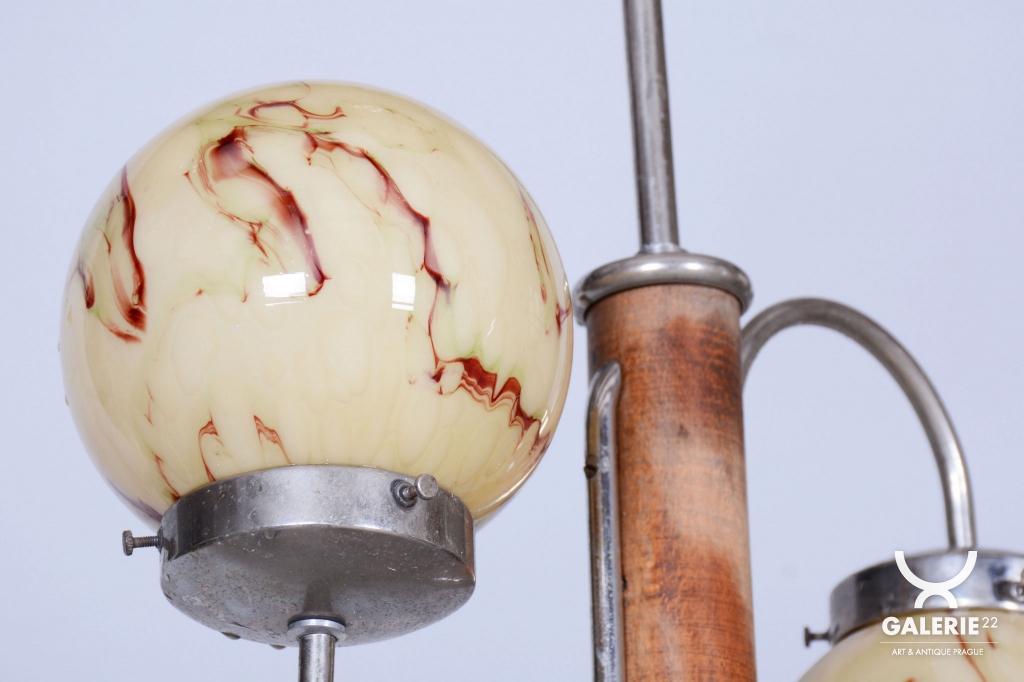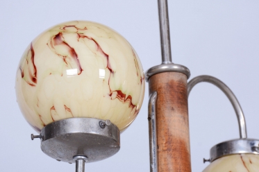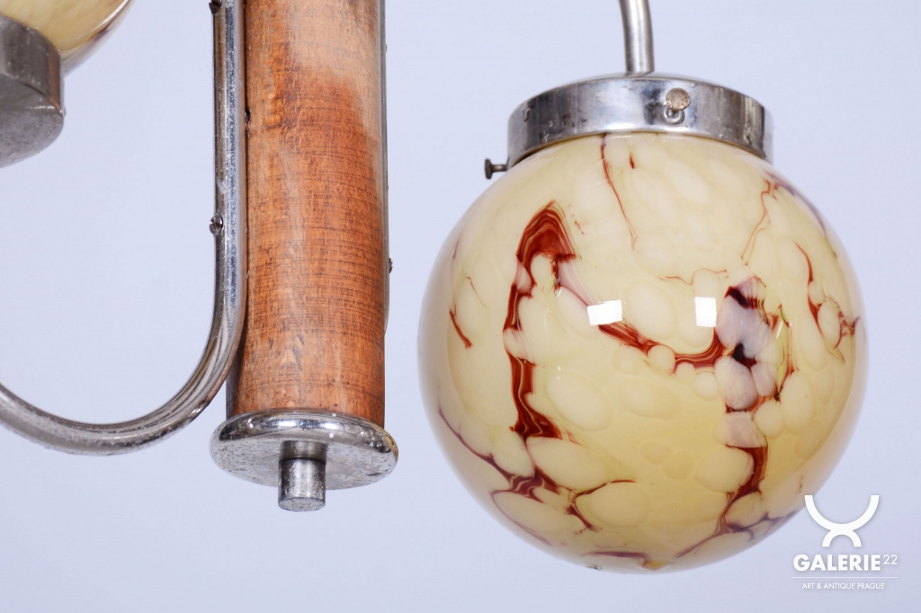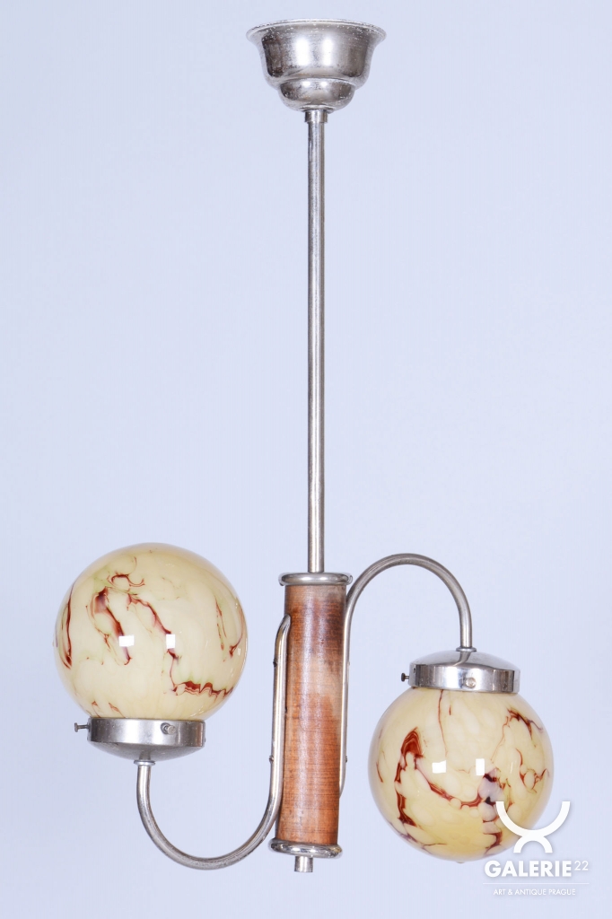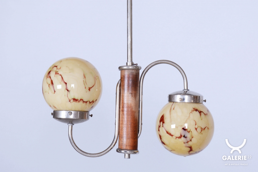 This chandelier is a rare and exceptionally elegant example of early Czechoslovak Art Deco from the 1920s. This style is manifested here in a unique combination of modern technical materials and traditional craftsmanship. The base of the fixture is a chrome-plated steel construction, sensitively complemented by elements of refined walnut veneer. It is precisely this contrast between the cool metal and the warm texture of the wood that gives the chandelier its unmistakable character. Its luxurious appearance is completed by two round shades with a 15 cm diameter made of marbled glass, which, when lit, creates a rich, deep texture reminiscent of natural stone.