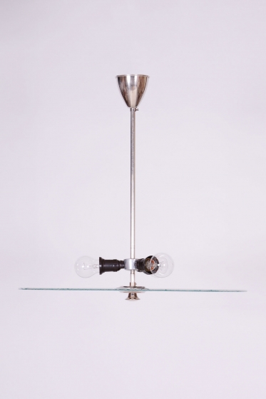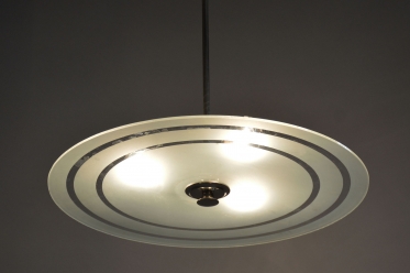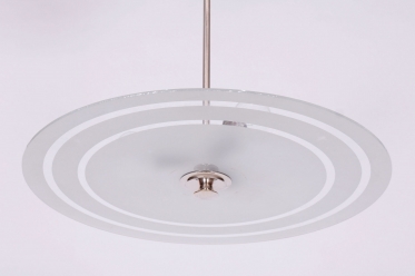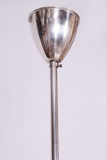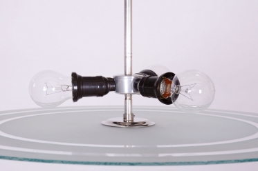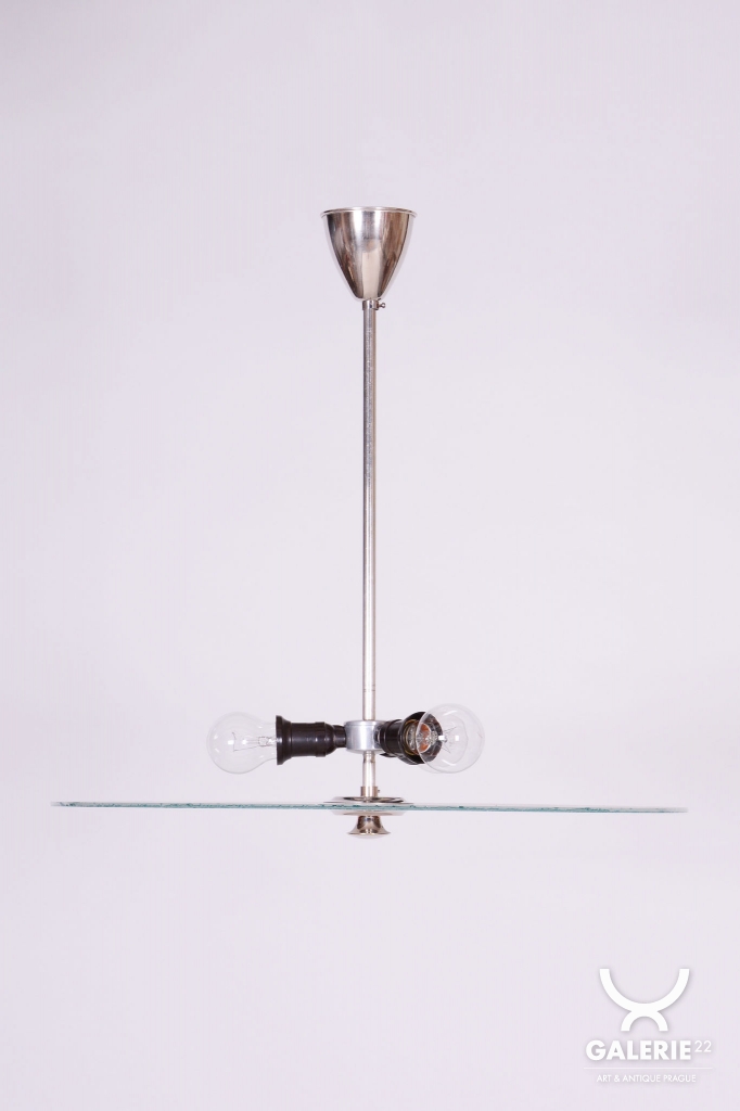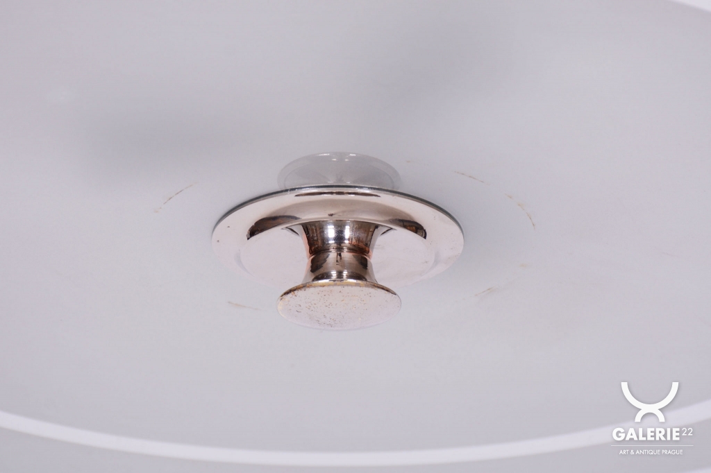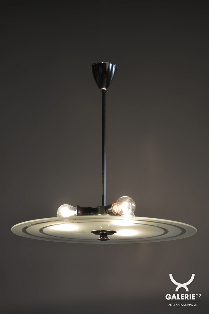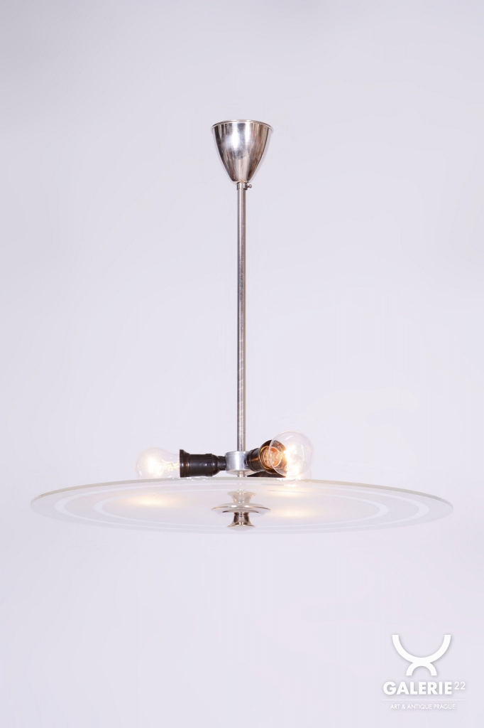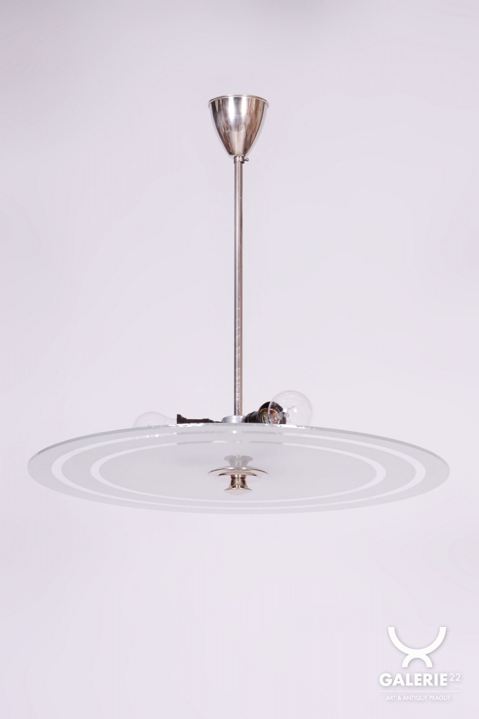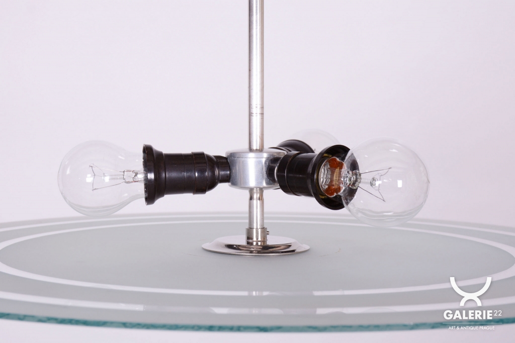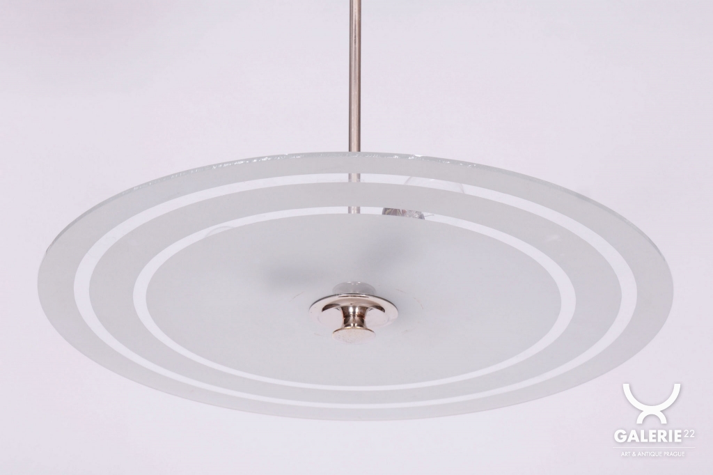 This chandelier is a monumental representative of functionalist purity and the Bauhaus movement in 1930s Czechoslovakia. With its size and austere elegance, this model was designed as a dominant lighting element for generous interiors. The base is a chrome-plated steel construction, professionally polished to a high luster. The primary visual and functional feature is the large-scale round shade made of frosted (sandblasted) opal glass, with an impressive 56 cm diameter. The sandblasted finish ensures a perfectly soft, velvety light diffusion, which is absolutely key to this style.
