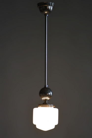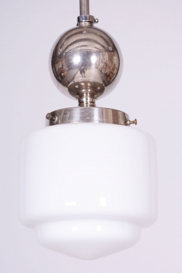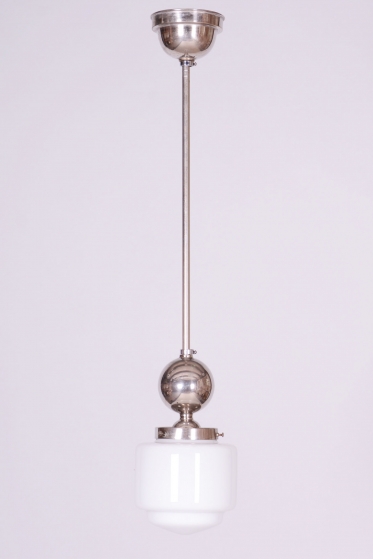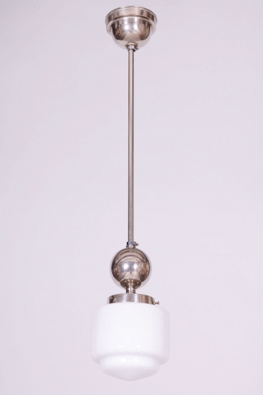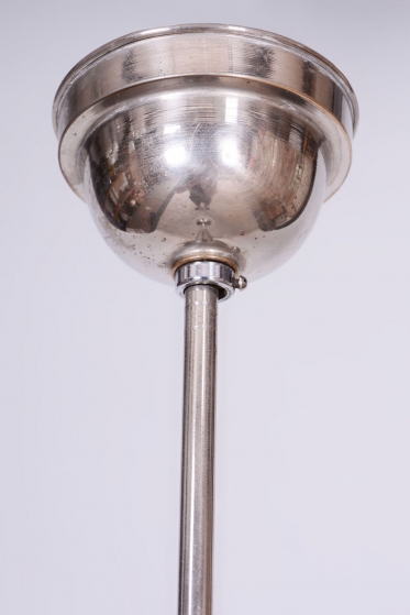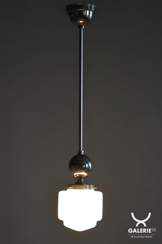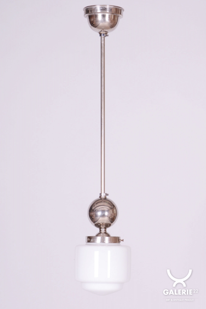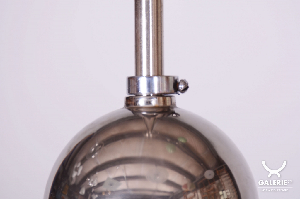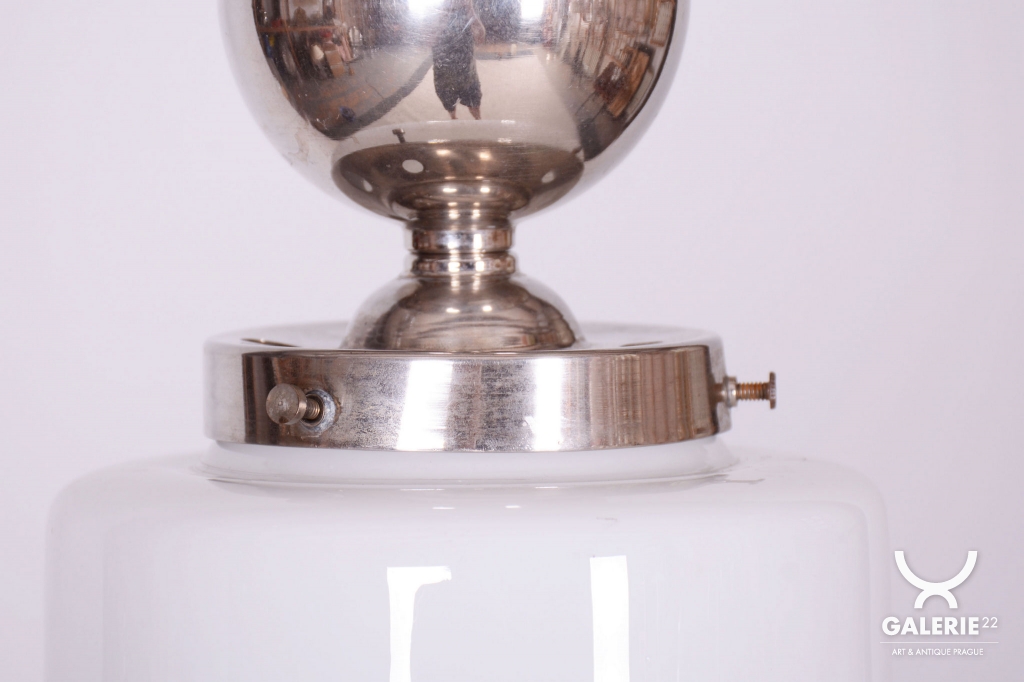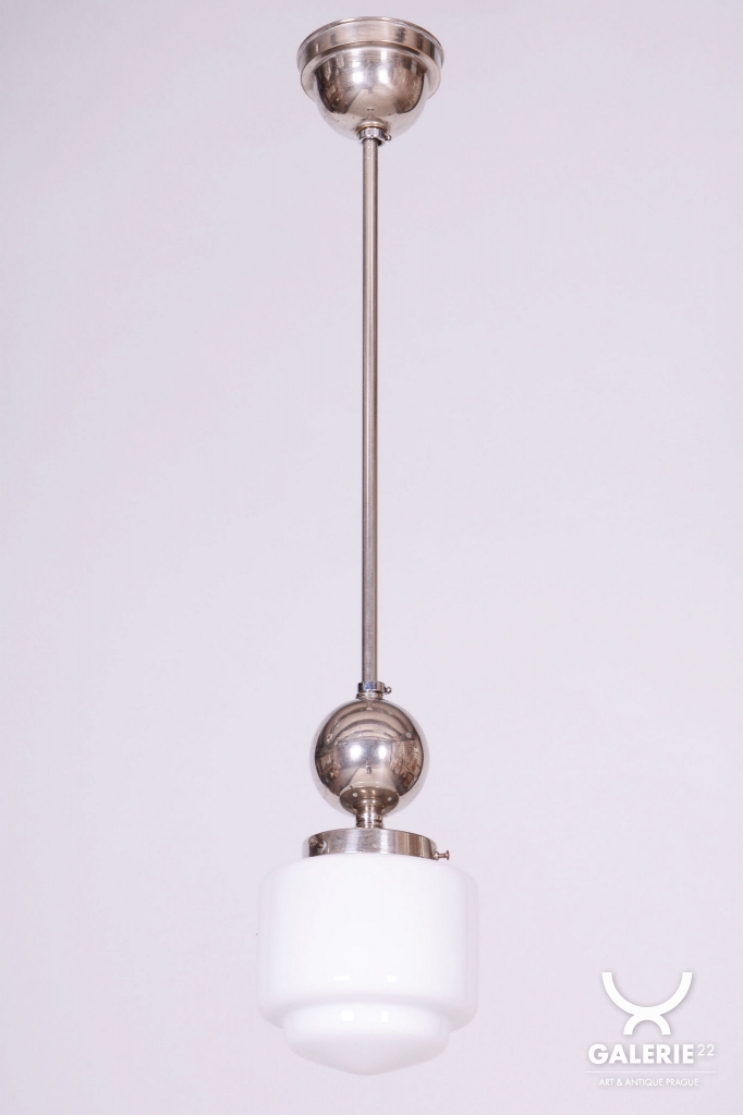 This chandelier is a pure representative of functionalist aesthetics and the Bauhaus movement in 1930s Czechoslovakia. Its design focuses on geometric clarity and maximum efficiency, which were key to modern architecture and home decor during this period. The base of the fixture is a chrome-plated steel construction, professionally polished to a mirror finish during restoration. The composition is complemented by a subtle opal glass shade with a 14 cm diameter, ensuring a pleasant and even distribution of light without glare.