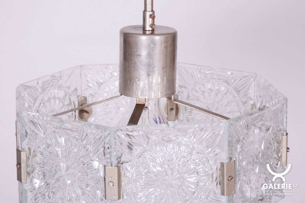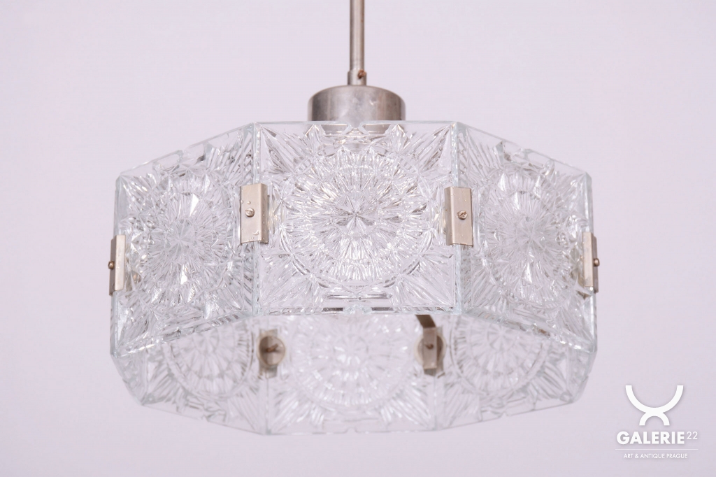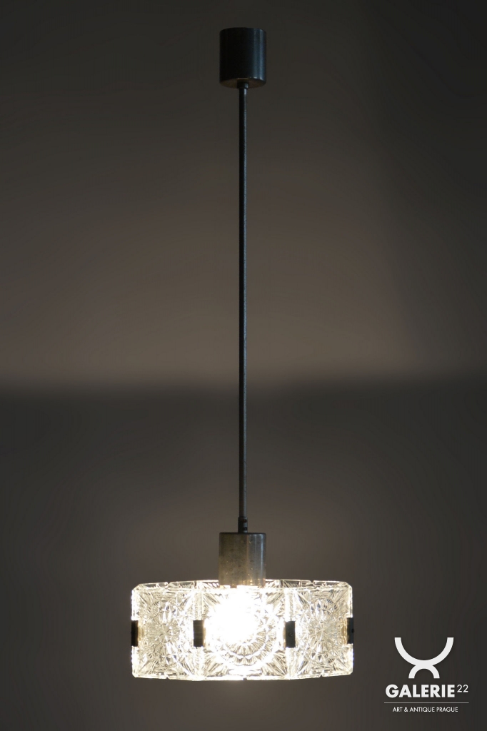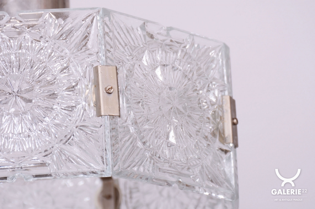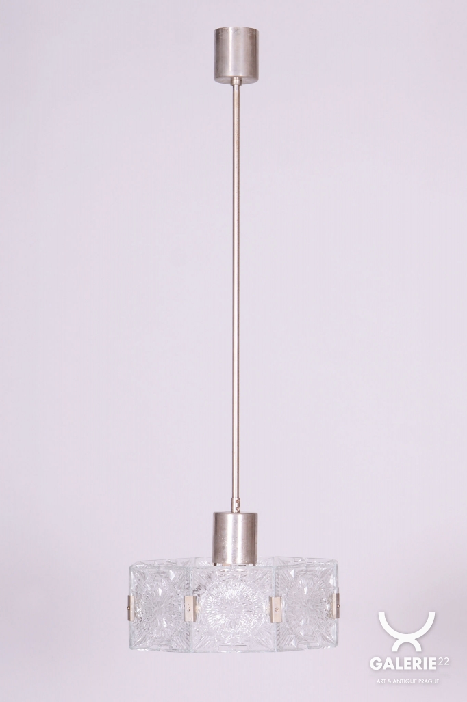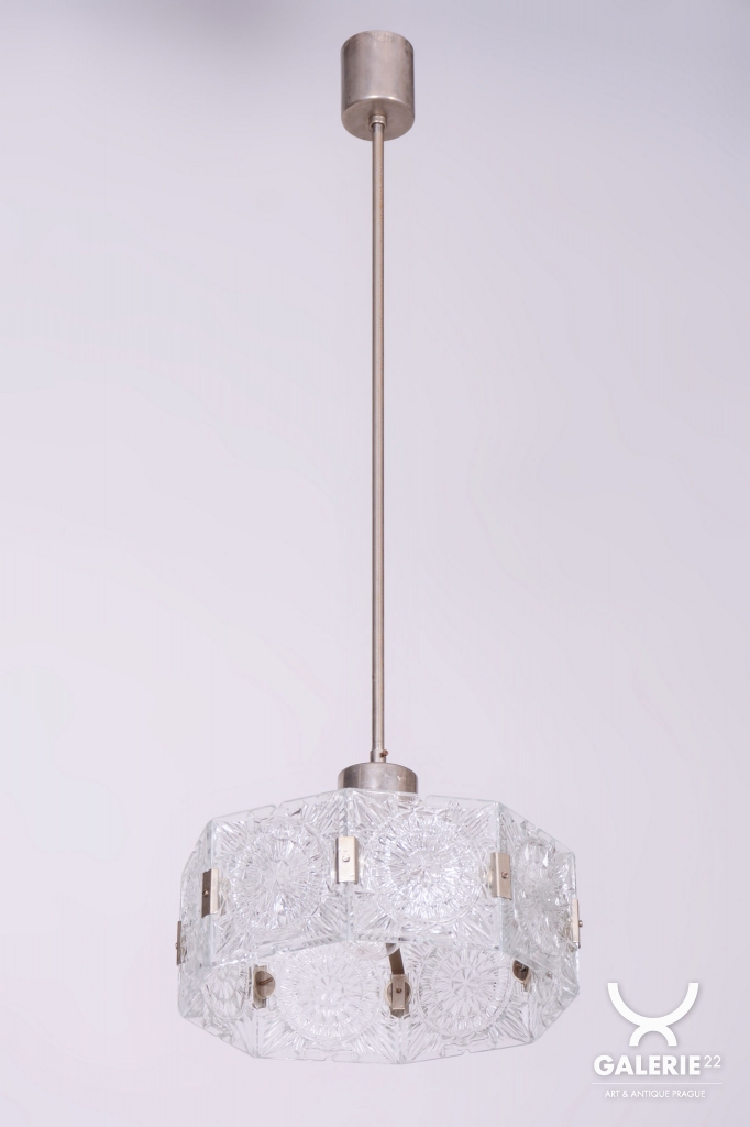 This chandelier is an outstanding example of 1960s Czechoslovak design, created by the legendary designer Jaroslav Bejvl. Manufactured in the prestigious glassworks of Kamenický Šenov, it embodies the signature elements of the Mid-Century Modern style. The base is a subtle chrome-plated steel construction, which has been professionally polished to a mirror finish during restoration. The centerpiece is the cast glass shade, which, thanks to its specific texture and thickness, creates a unique play of light and shadow, a hallmark of Bejvl’s artistic work.