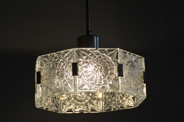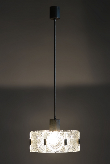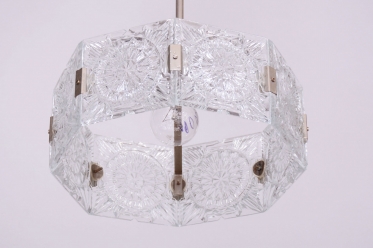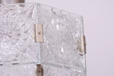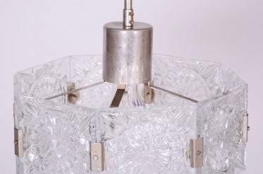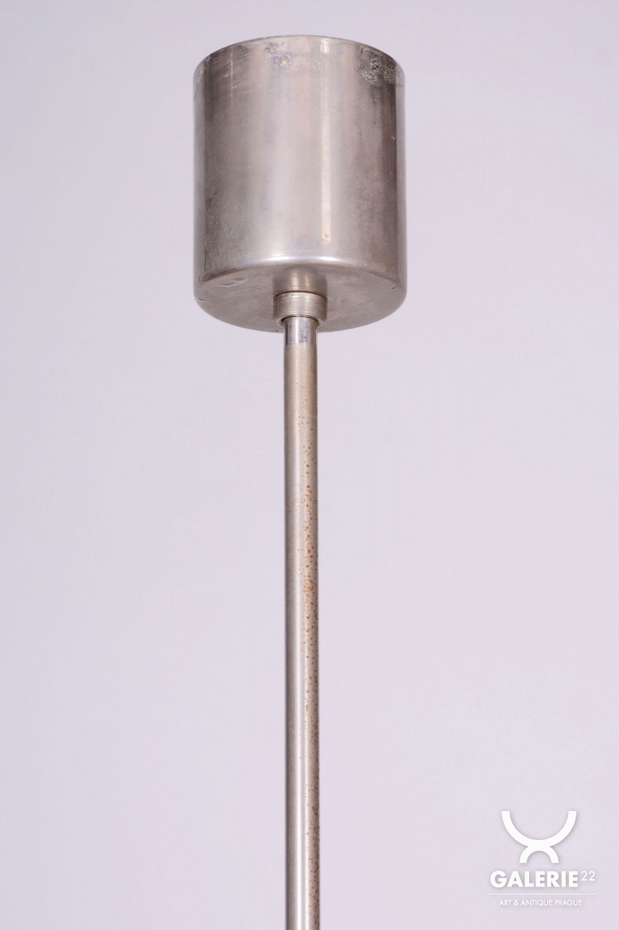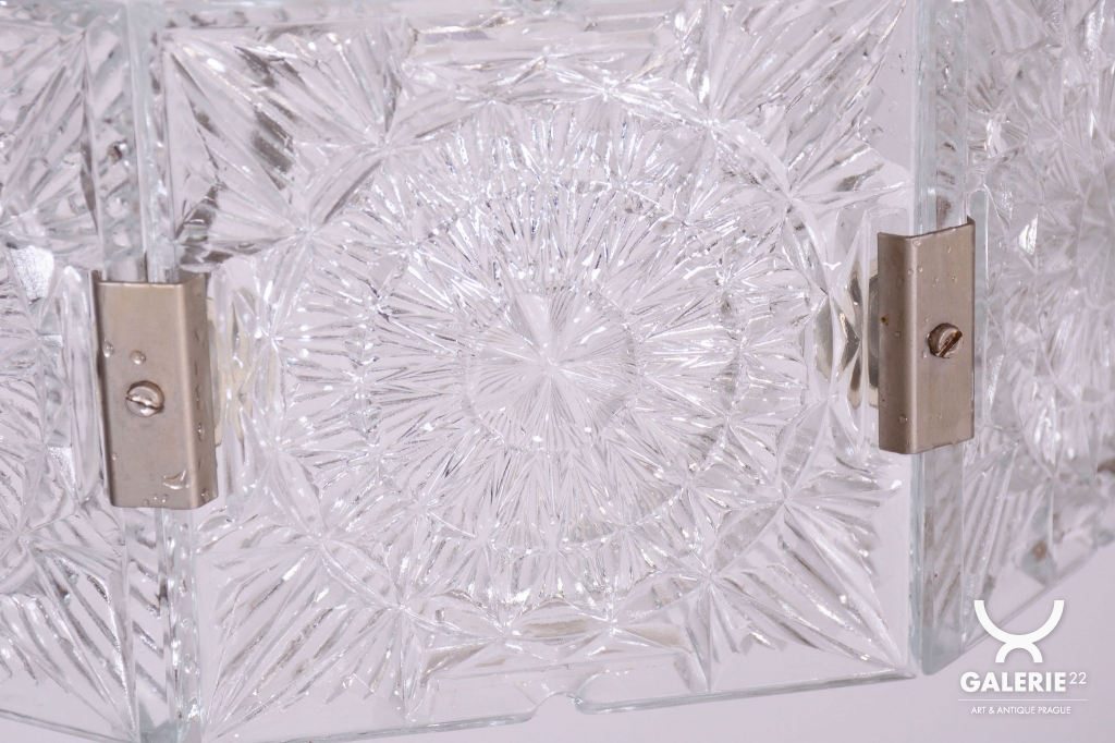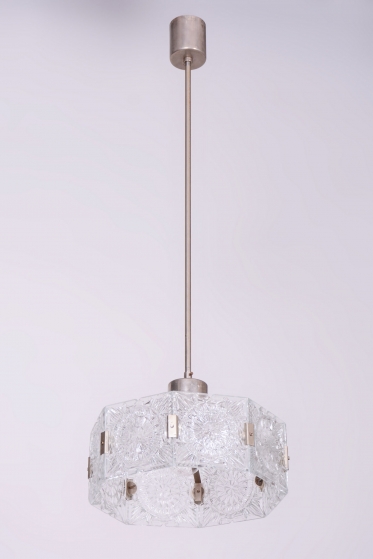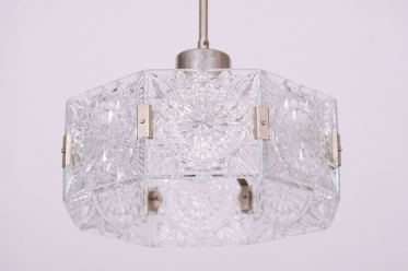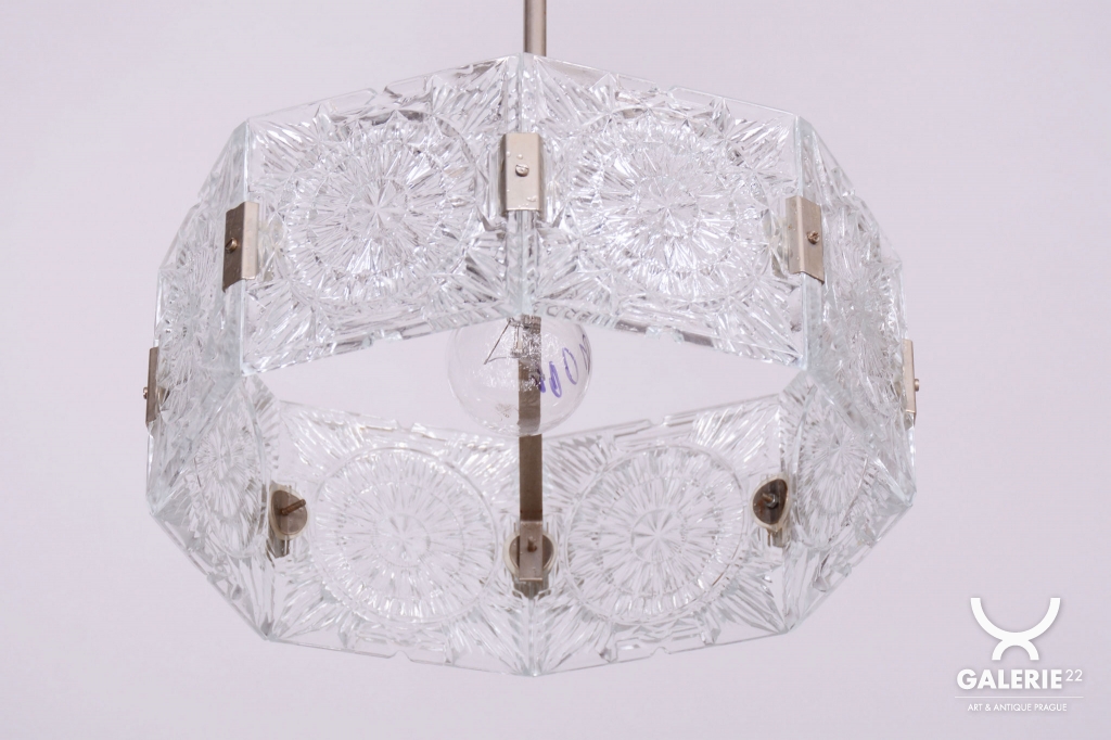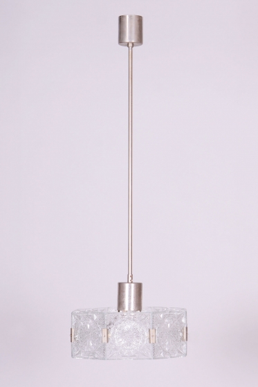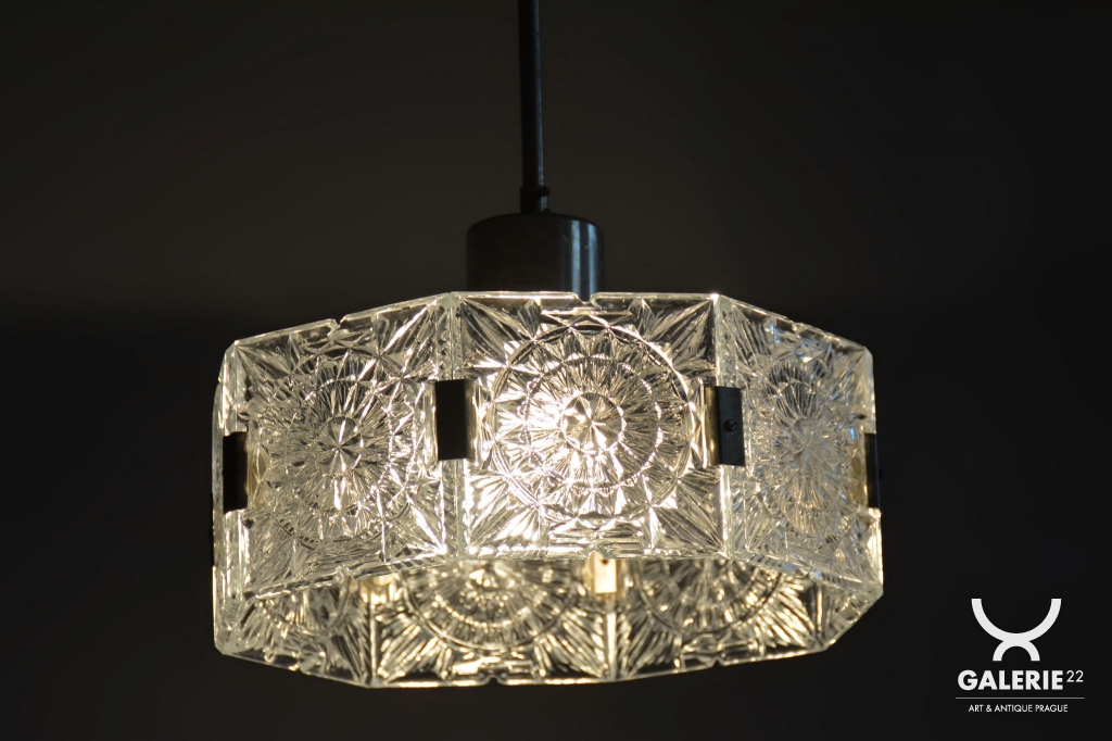 This chandelier is an outstanding example of 1960s Czechoslovak design, created by the legendary designer Jaroslav Bejvl. Manufactured in the prestigious glassworks of Kamenický Šenov, it embodies the signature elements of the Mid-Century Modern style. The base is a subtle chrome-plated steel construction, which has been professionally polished to a mirror finish during restoration. The centerpiece is the cast glass shade, which, thanks to its specific texture and thickness, creates a unique play of light and shadow, a hallmark of Bejvl’s artistic work.