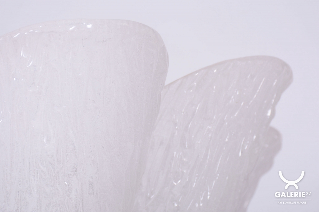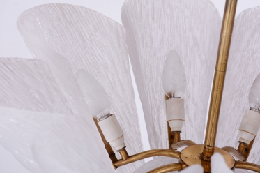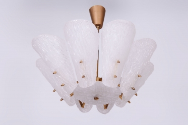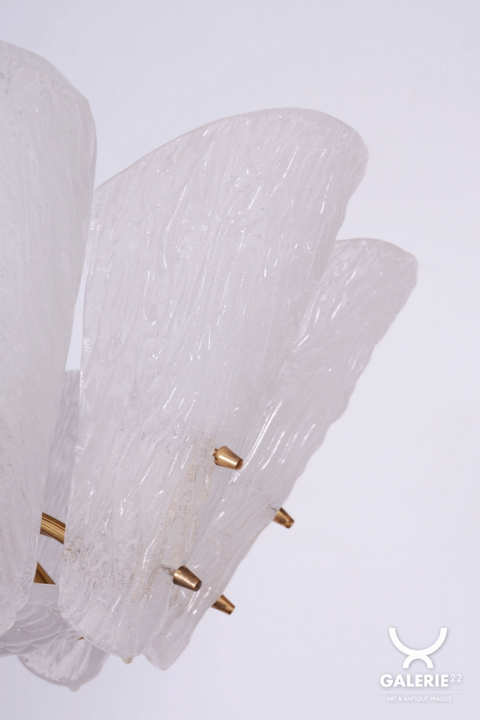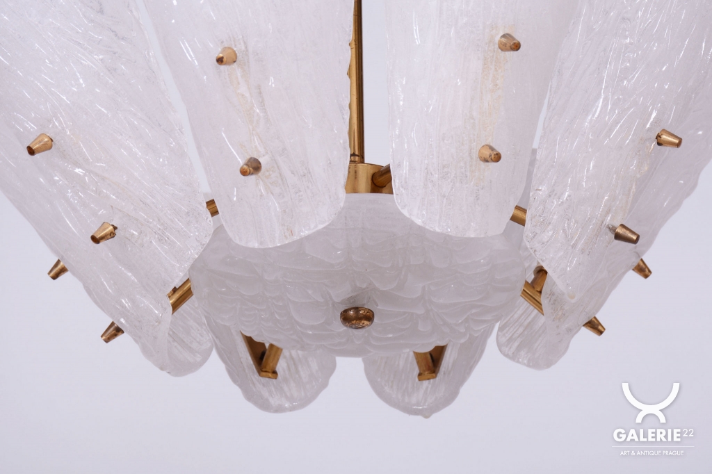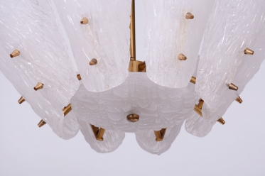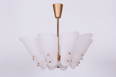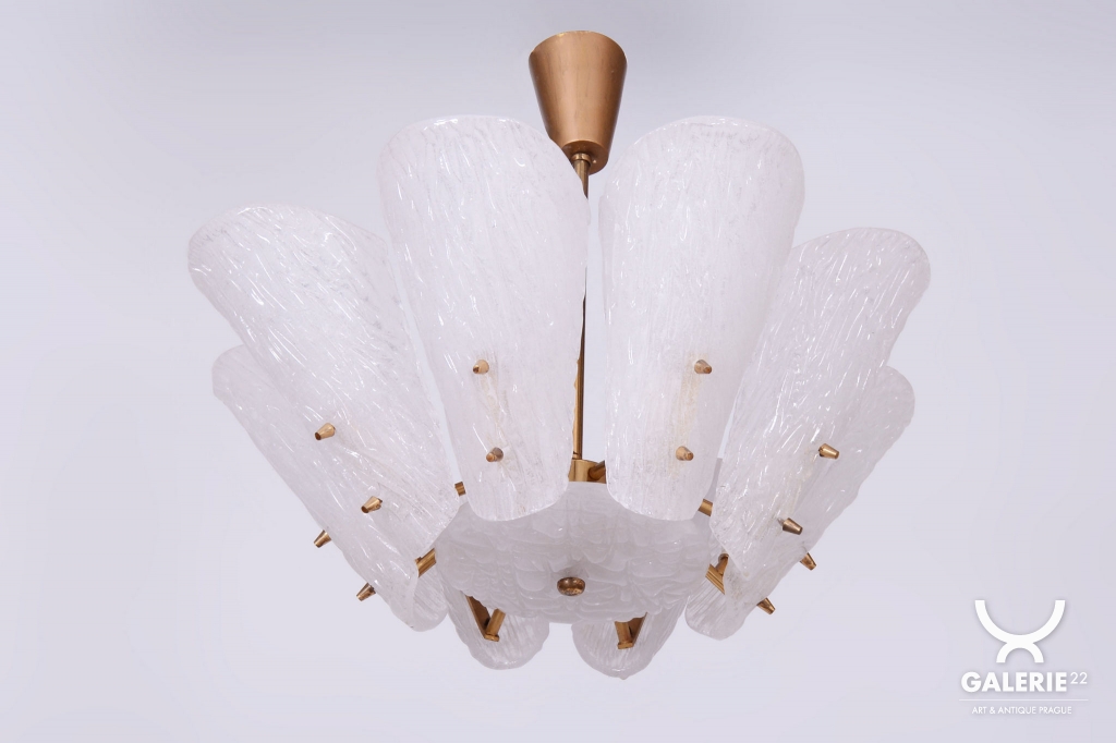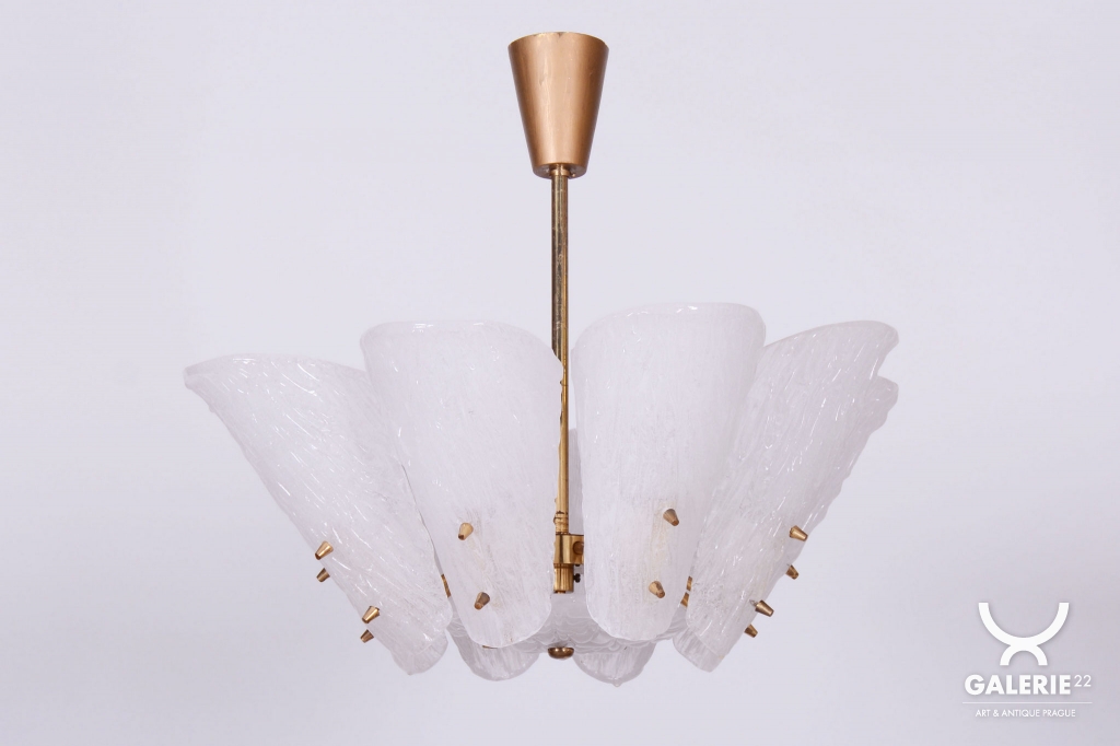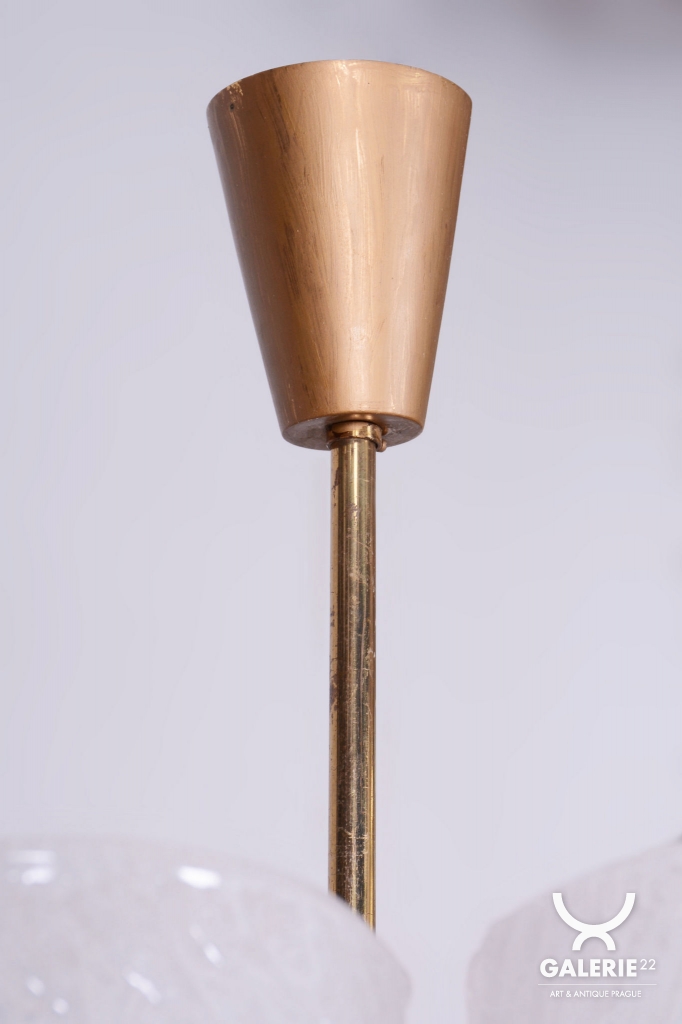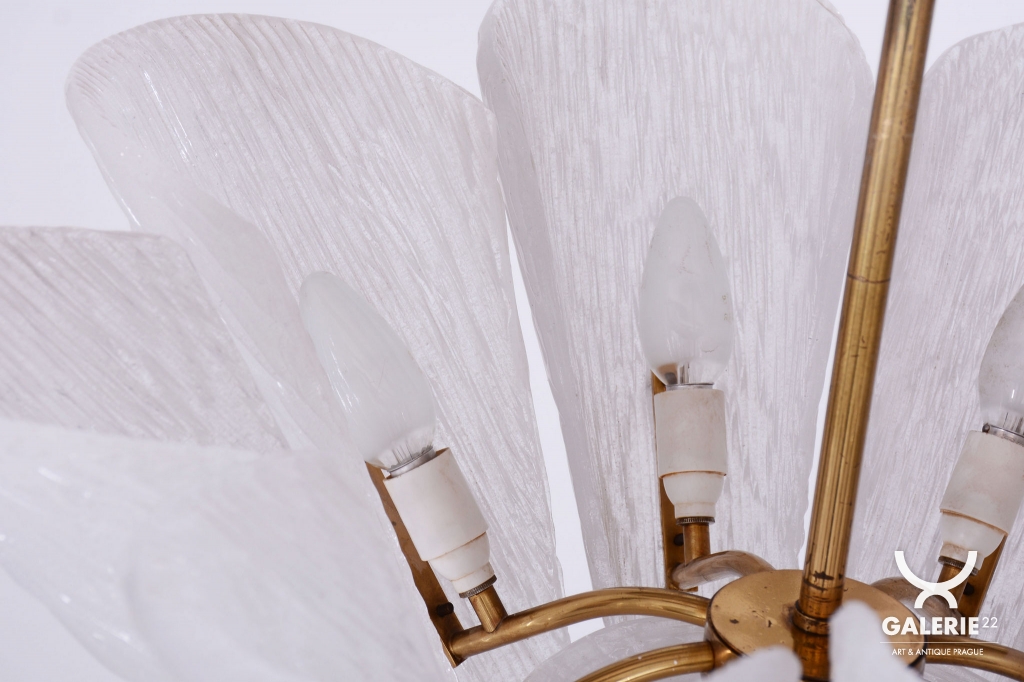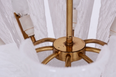 This chandelier is a masterpiece of Austrian modernist design from the 1950s, designed by the renowned architect and designer J. T. Kalmar. The fixture represents the early phase of the Mid-Century Modern era, where the technical precision of Vienna Kalmar workshops met a new sense of elegance. The foundation is a sophisticated brass construction, professionally cleaned to highlight its natural golden tone and refined luster. The uniqueness of this piece is emphasized by the shades made of white textured glass, which, thanks to their specific relief, softly refract light and create a deep, organic atmosphere within the interior.